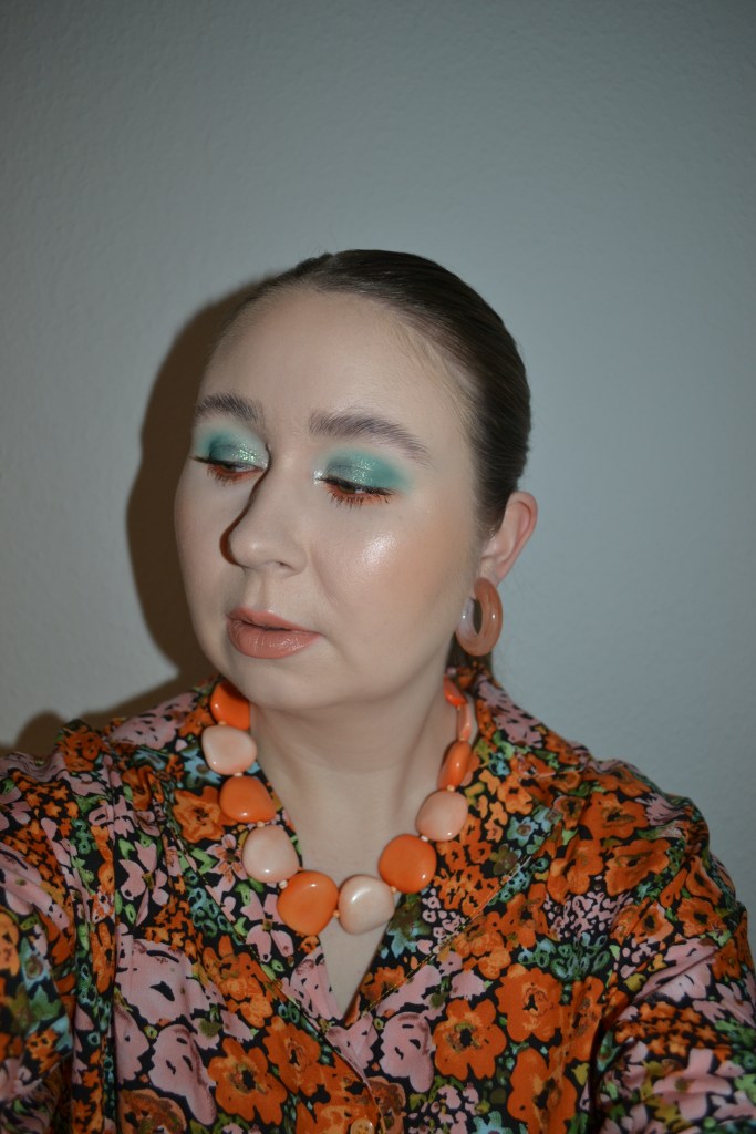 (Base: primer – e.l.f Cosmetics Power Grip primer, foundation – Maybelline Dream Urban Cover foundation (shade: 100 Warm Ivory), concealers – Sigma Beauty Spectrum Color-Correcting Duo in Light to Medium + Huda Beauty #FAUXFILTER Luminous Matte liquid concealer (shade: 1.3G Marshmellow), powder – Huda Beauty Easy Bake powder in Sugar Cookie. Face make-up: bronzer – KimChi Chic Beauty Thailor bronzer in 01 I Went to Malibu, blusher – Made By Mitchell Blursh Press’d blusher in All Riped Up, highlighter – Smashbox x Becca Shimmering Skin Perfector pressed highlighter (shade: Rose Quartz). Eye make-up: base – MAC Prep + Prime 24-Hour Extend Eye Base, eyeshadows – Essence eyeshadow in 05 Granny Pants + Oden’s Eye Saga of Freja Cat’s Breath palette (shades: Catnip + Bad temper + Bling + White peach + Warmth + Cat star), mascaras – MAC Extended Play Gigablack Lash mascara + Maybelline Lash Sensational Sky High mascara Cosmic Black, eyeliner – Oden’s Eye Solmåne gel liner in 002 Orange. Eyebrows: Anastasia Beverly Hills Brow Freeze + Maybelline Brow Ultra Slim pencil in Medium Brown. Lips: Morphe x Nyane Color pencil in Tequila Sunrise + MAC Burnt Sugar lipstick)