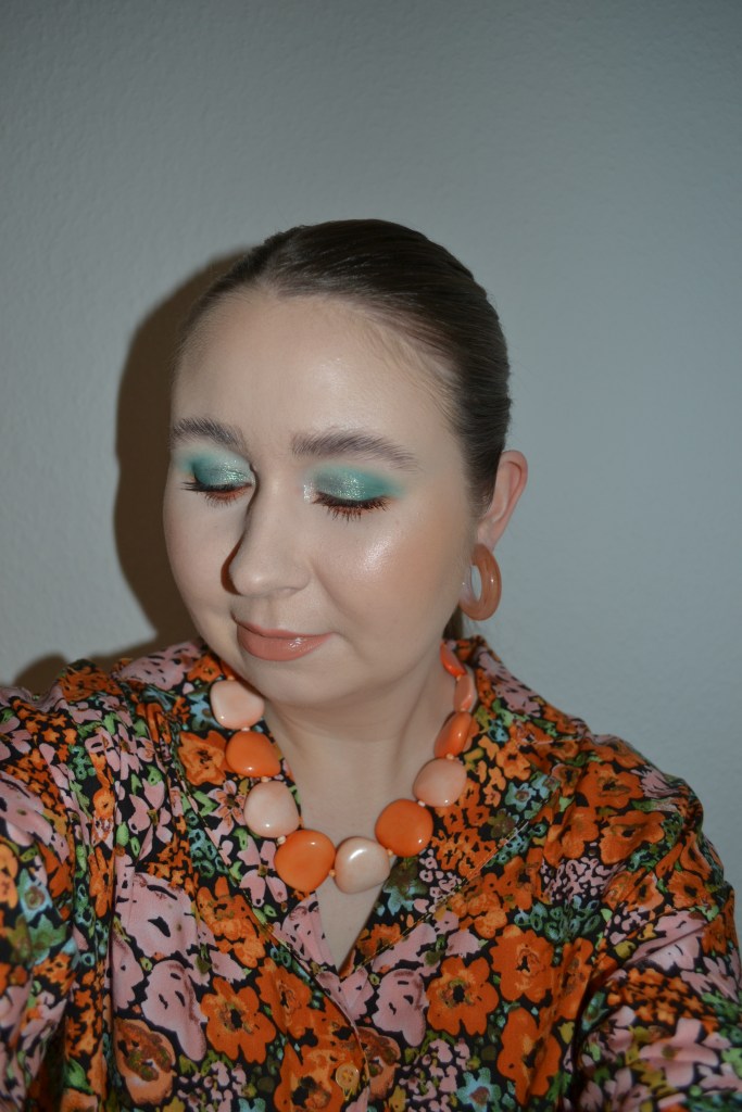 Here’s the make-up I wore with this outfit. I’m not sure I like the light peachy nude lip, but I think the eye look is very pretty.