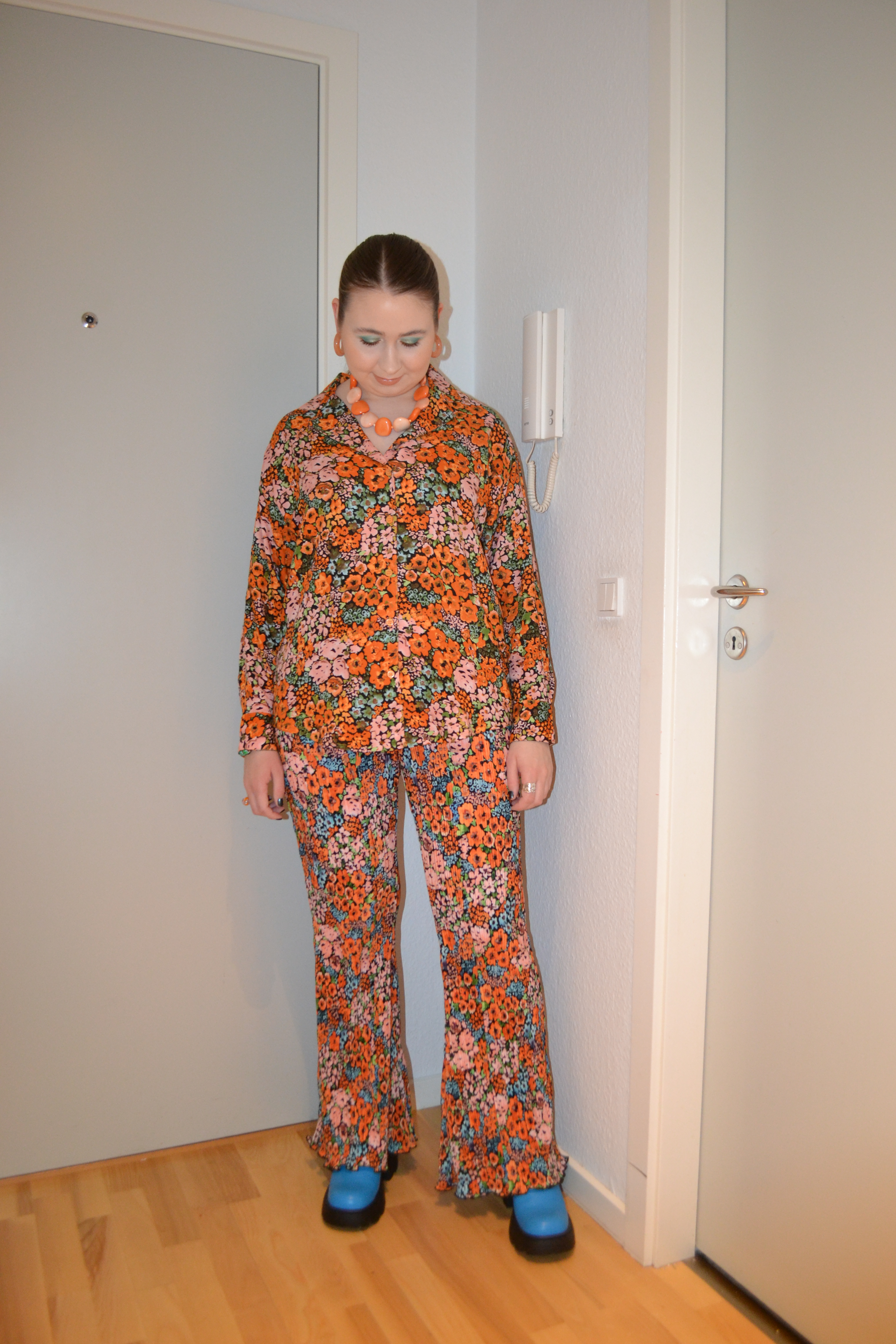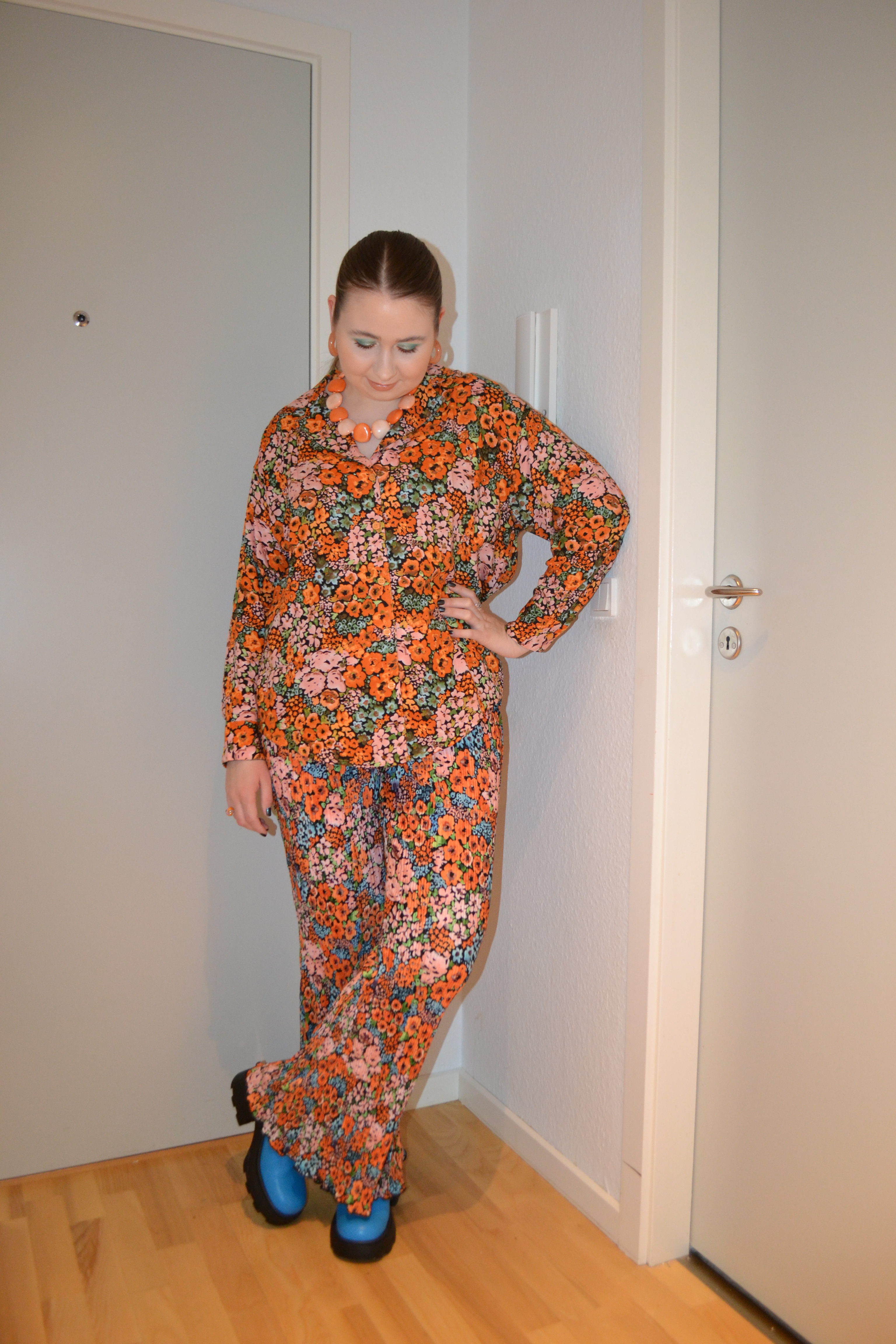 (Base: primer – e.l.f Cosmetics Power Grip primer, foundation – Maybelline Dream Urban Cover foundation (shade: 100 Warm Ivory), concealers – Sigma Beauty Spectrum Color-Correcting Duo in Light to Medium + Huda Beauty #FAUXFILTER Luminous Matte liquid concealer (shade: 1.3G Marshmellow), powder – Huda Beauty Easy Bake powder in Sugar Cookie. Face make-up: bronzer – KimChi Chic Beauty Thailor bronzer in 01 I Went to Malibu, blusher – Made By Mitchell Blursh Press’d blusher in All Riped Up, highlighter – Smashbox x Becca Shimmering Skin Perfector pressed highlighter (shade: Rose Quartz). Eye make-up: base – MAC Prep + Prime 24-Hour Extend Eye Base, eyeshadows – Essence eyeshadow in 05 Granny Pants + Oden’s Eye Saga of Freja Cat’s Breath palette (shades: Catnip + Bad temper + Bling + White peach + Warmth + Cat star), mascaras – MAC Extended Play Gigablack Lash mascara + Maybelline Lash Sensational Sky High mascara Cosmic Black, eyeliner – Oden’s Eye Solmåne gel liner in 002 Orange. Eyebrows: Anastasia Beverly Hills Brow Freeze + Maybelline Brow Ultra Slim pencil in Medium Brown. Lips: Morphe x Nyane Color pencil in Tequila Sunrise + MAC Burnt Sugar lipstick)