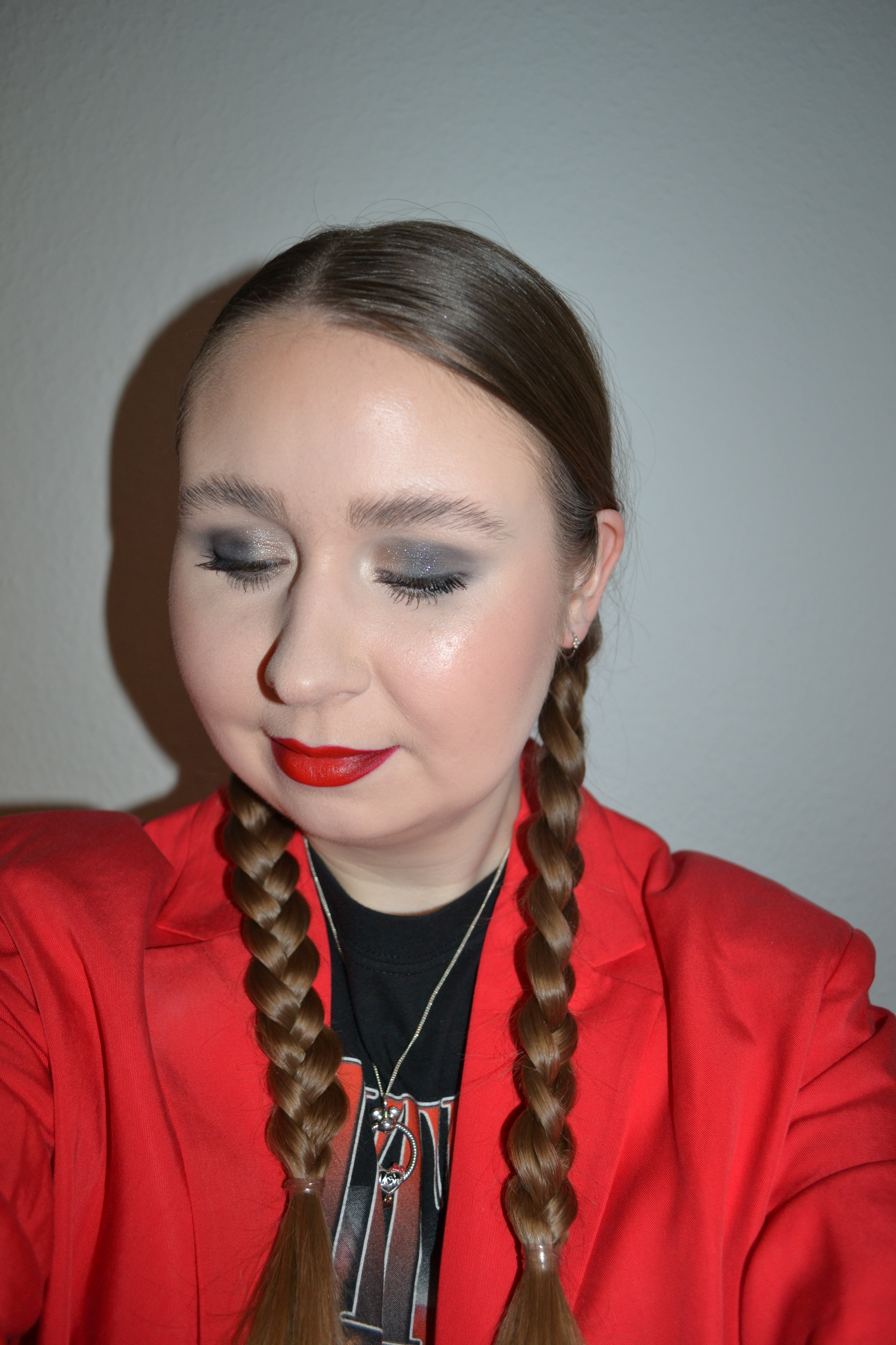 (Base: primer – MAC Studio Fix Mattifine 12HR Shine-Control primer, foundation – MAC Studio Sculpt SPF 15 foundation (shade: NC15), concealers – Smashbox x Becca Under Eye Brightening Corrector in Fair/Light + Huda Beauty #FAUXFILTER Luminous Matte liquid concealer (shade: 1.3G Marshmellow), powders – e.l.f. Cosmetics HD Undereye setting powder in Sheer + MAC Prep + Prime Transparent finishing powder. Face make-up: bronzer – MAC Next To Nothing bronzing powder (shade: Canyon Dreamin’), blusher – MAC Nippy’s Pink Rose powder blush, highlighter – MAC Extra Dimension Skinfinish in Just Whitney. Eye make-up: base – MAC Prep + Prime 24-Hour Extend Eye Base, eyeshadows – Essence eyeshadow in 05 Granny Pants + MAC x Whitney Houston Whitney’s Nippy Eye-Conic palette (shades: Nippy Taupe Dusk + Nippy’s Grape + Nippy Platinum + Nippy’s Noir) + MAC eyeshadows (shades: L.E.S. Artiste + Nylon), mascaras – MAC Extended Play Gigablack Lash mascara + Maybelline Lash Sensational Sky High mascara Cosmic Black, eyeliner – Oden’s Eye Solmåne gel liner in 014 Colorful black. Eyebrows: Anastasia Beverly Hills Brow Freeze + Maybelline Brow Ultra Slim pencil in Medium Brown. Lips: MAC Ms. Diva Pro Longwear lip pencil + MAC Nippy’s Sensual Red lipstick + MAC Lady Danger lipstick)