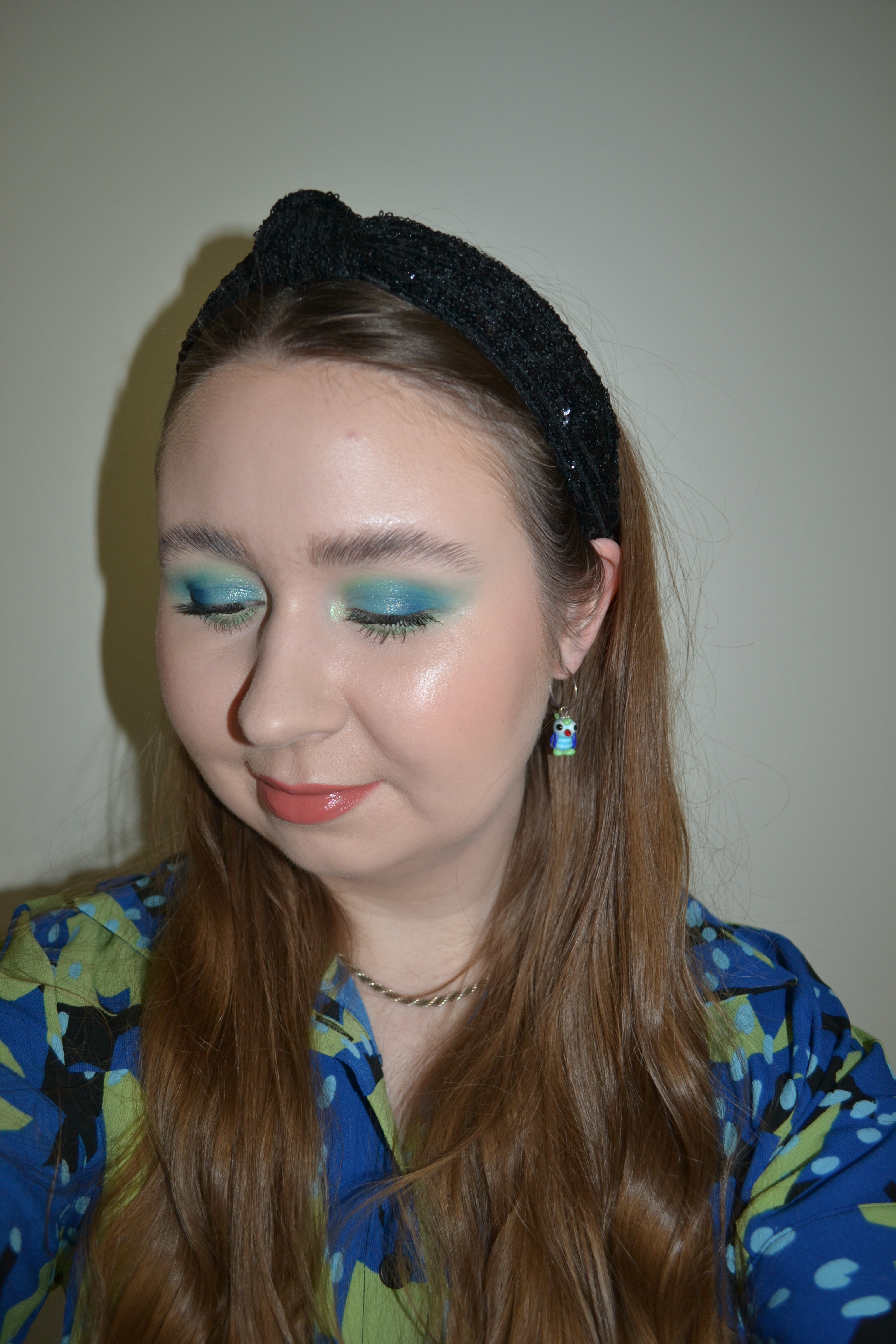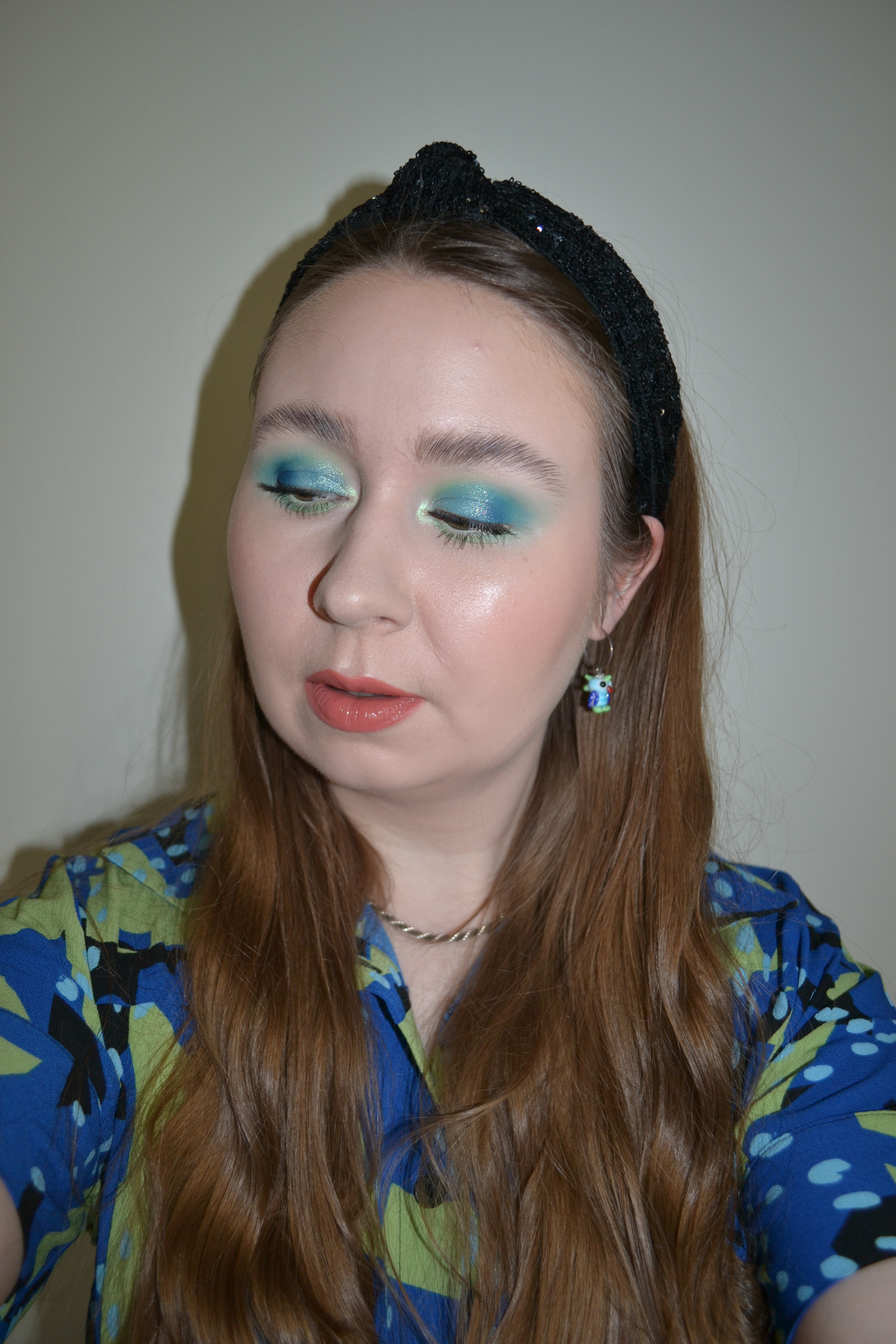 (Base: primer – e.l.f. Skin Suntouchable! Whoa Glow SPF 30 sunscreen (shade: Sunbeam), foundations – Nars Light Reflecting foundation (shade: Mont Blanc) + Revolution Conceal & Define full coverage foundation (shade: F0), concealers – Smashbox x Becca Under Eye Brightening Corrector in Fair/Light + Revolution IRL Filter Finish soft matte concealer (shade: C2), powder – Charlotte Tilbury Airbrush Brightening Flawless Finish powder (shade: Fair/Medium). Face make-up: bronzer + blusher – XXRevolution Healthy Glow Sculptor cream blush and bronzer in Forgive and Forget Pink, highlighter – Colourpop Winx Club Lite Stix in Darcy. Eye make-up: base – Sigma Beauty Eyeshadow Base Primer in Ignite, eyeshadows – Essence eyeshadow in 05 Granny Pants + Cosmic Brushes Serenity palette (shades: Spring + Mood + Serenity + Opal), mascaras – MAC Extended Play Gigablack Lash mascara + Rare Beauty Perfect Strokes universal volumizing mascara, eyeliner – Essence Wood You Love Me? Duo Eye Pencil in 01 Forever Together (light green shade). Eyebrows: e.l.f. Cosmetics Brow Lift + Maybelline Brow Ultra Slim pencil in Medium Brown. Lips: MAC Boldly Bare lip pencil + Maybelline Superstay Vinyl Ink in 15 Peachy)