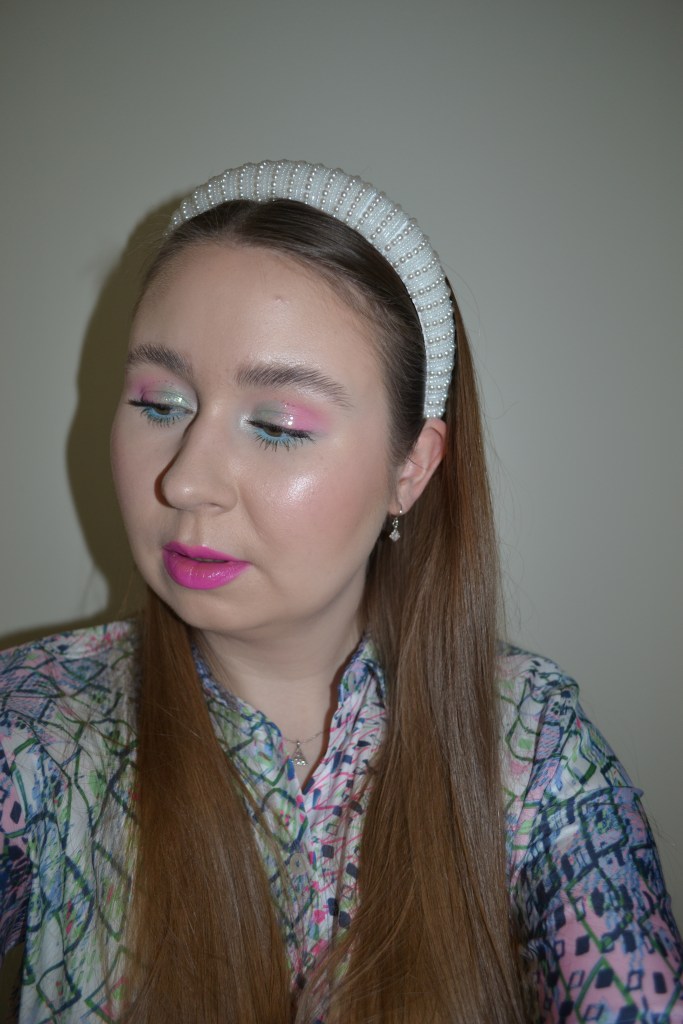 (Base: primer – e.l.f Cosmetics Power Grip primer, foundation – Maybelline Dream Urban Cover foundation (shade: 100 Warm Ivory), concealers – e.l.f. Cosmetics Flawless Brightening concealer (shade: Fair 10 C) + L’Oréal Infaillible More Than Concealer (shade: 322 Ivory), powders – Laura Mercier Translucent Loose Setting Powder Tone Up in Rose + Catrice All Matt Shine Control powder Healthy Look in 100 Neutral Fresh Beige. Face make-up: bronzer – Sigma Beauty Matte Bronzer (shade: Light), blusher – Colourpop pressed powder blush in Prairie Air, highlighter – Catrice My Little Pony highlighter in C01 Head In The Clouds. Eye make-up: base – MAC Pro Longwear Paint Pot in Painterly, eyeshadows – Catrice My Little Pony eyeshadow palette in C01 Dreaming of Rainbows (shades: Parasol + Cotton Candy + Firefly + Nedley + Blue Belle + Glory) + Colourpop The Muppets Glitterally Obsessed glitter gel in It’s Moi, mascaras – MAC Extended Play Gigablack Lash mascara + Rare Beauty Perfect Strokes universal volumizing mascara, eyeliner – Revolution x Bratz Cloe eye pencil. Eyebrows: e.l.f. Cosmetics Brow Lift + Soda #browpurrfection Ultra Thin Brow Liner in 003 Kim. Lips: Morphe x Nyane Color pencil in Pitaya Pink + Essence Bloomin’ Bright lip glow stick in 01 Smilin’ Bright)