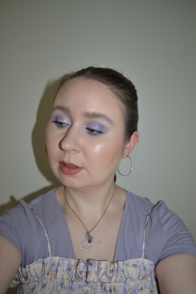 (Base: primer – e.l.f. Skin Suntouchable! Whoa Glow SPF 30 sunscreen (shade: Sunbeam), foundation – L’Oreal Infaillible 24H Fresh Wear foundation (shade: 015 Porcelain), concealers – Rare Beauty Positive Light under eye brightener (shade: Light) + L’Oréal Infaillible More Than Concealer (shade: 322 Ivory), powder – Laura Mercier Translucent Loose Setting Powder Ultra-Blur in Translucent. Face make-up: bronzer – Charlotte Tilbury Beautiful Skin Sun-Kissed Glow bronzer in Fair, blusher – Half Magic Cheek Fluff Soft Blur blush in Pink Mushroom, highlighter – Colourpop Super Shock highlighter in Lav Dream. Eye make-up: base – MAC Pro Longwear Paint Pot in Painterly, eyeshadows – Essence eyeshadow in 05 Granny Pants + Colourpop Lav_ish palette (shades: Escapism + Online + Digital Skies + Self-care Moment + Serenity + Mood Boost) + Colourpop Super Shock shadow in Angelic, mascaras – MAC Extended Play Gigablack Lash mascara + Rare Beauty Perfect Strokes universal volumizing mascara, eyeliner – NYX Slim eye pencil in Lavender Shimmer. Eyebrows: e.l.f. Cosmetics Brow Lift + Maybelline Brow Ultra Slim pencil in Medium Brown. Lips: Colourpop Lippie pencil in BFF + Pat McGrath Labs SatinAllure lipstick in Négligée + Colourpop So Glassy lip gloss in Purple Aura)