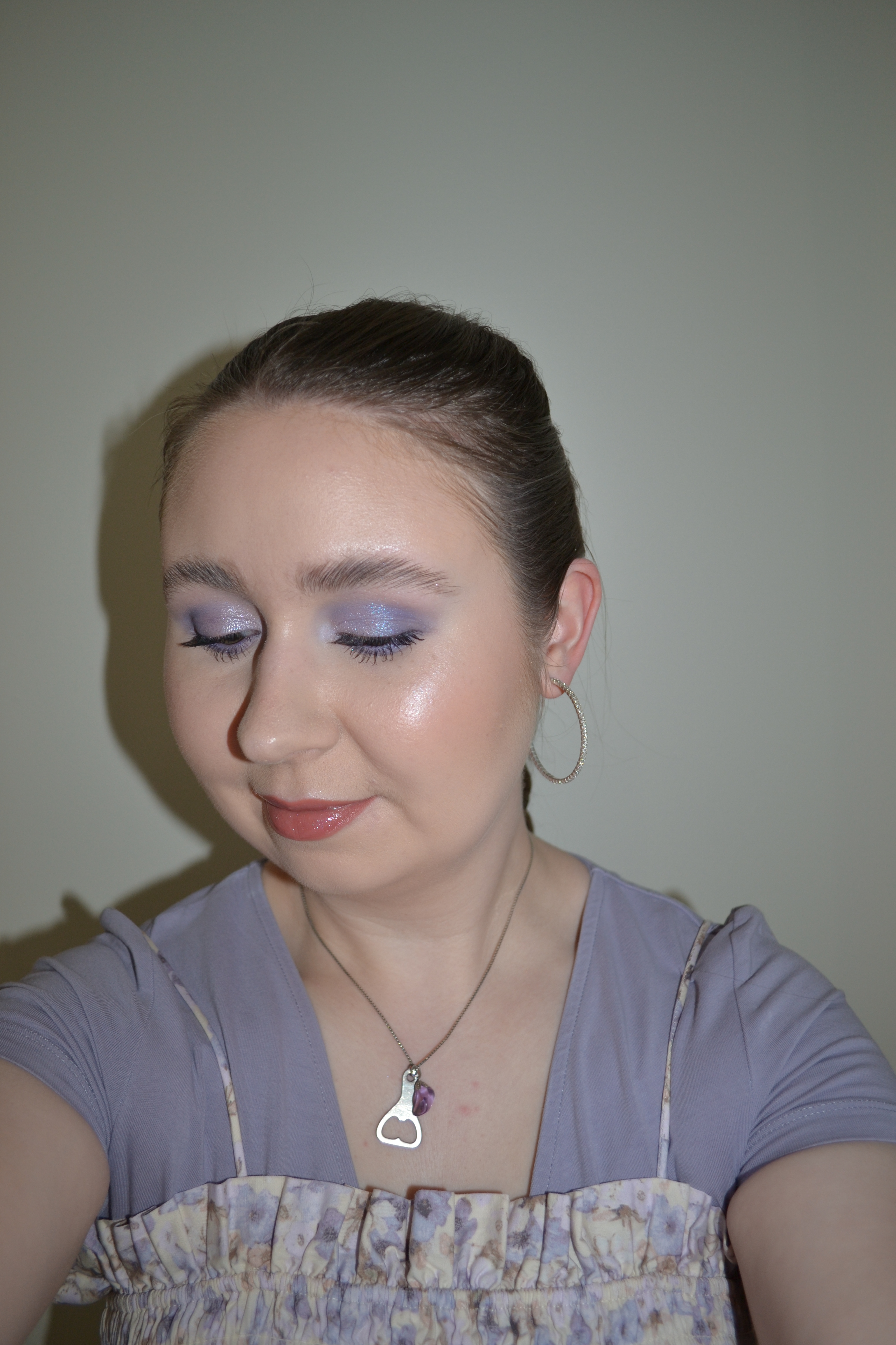 (Base: primer – e.l.f. Skin Suntouchable! Whoa Glow SPF 30 sunscreen (shade: Sunbeam), foundation – L’Oreal Infaillible 24H Fresh Wear foundation (shade: 015 Porcelain), concealers – Rare Beauty Positive Light under eye brightener (shade: Light) + L’Oréal Infaillible More Than Concealer (shade: 322 Ivory), powder – Laura Mercier Translucent Loose Setting Powder Ultra-Blur in Translucent. Face make-up: bronzer – Charlotte Tilbury Beautiful Skin Sun-Kissed Glow bronzer in Fair, blusher – Half Magic Cheek Fluff Soft Blur blush in Pink Mushroom, highlighter – Colourpop Super Shock highlighter in Lav Dream. Eye make-up: base – MAC Pro Longwear Paint Pot in Painterly, eyeshadows – Essence eyeshadow in 05 Granny Pants + Colourpop Lav_ish palette (shades: Escapism + Online + Digital Skies + Self-care Moment + Serenity + Mood Boost) + Colourpop Super Shock shadow in Angelic, mascaras – MAC Extended Play Gigablack Lash mascara + Rare Beauty Perfect Strokes universal volumizing mascara, eyeliner – NYX Slim eye pencil in Lavender Shimmer. Eyebrows: e.l.f. Cosmetics Brow Lift + Maybelline Brow Ultra Slim pencil in Medium Brown. Lips: Colourpop Lippie pencil in BFF + Pat McGrath Labs SatinAllure lipstick in Négligée + Colourpop So Glassy lip gloss in Purple Aura)