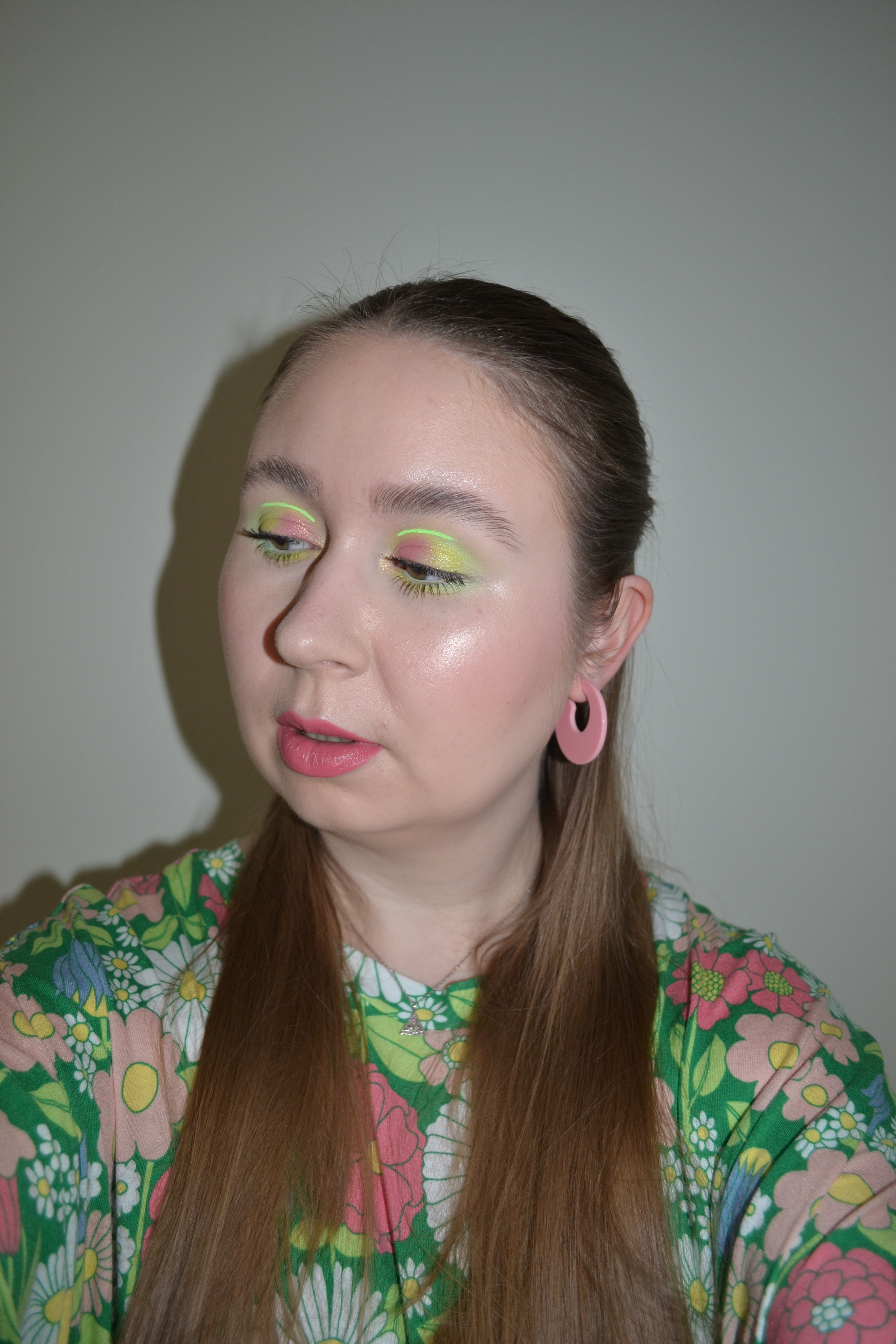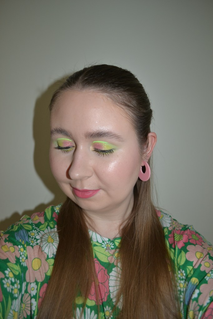 Here’s the make-up I wore with this outfit. I think this eye look turned out so fun. I love the neon green accent liner, and the colours match my dress perfectly.