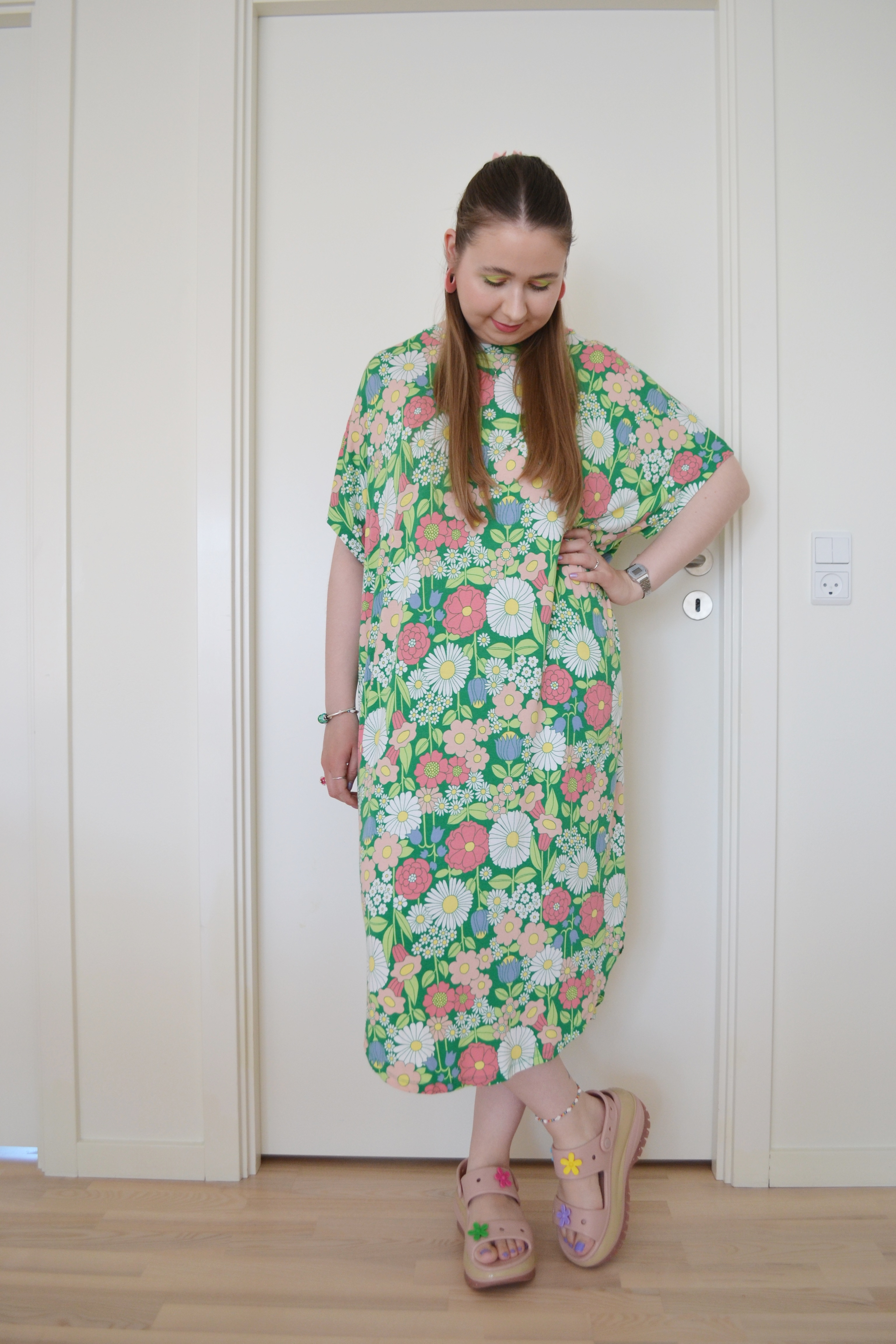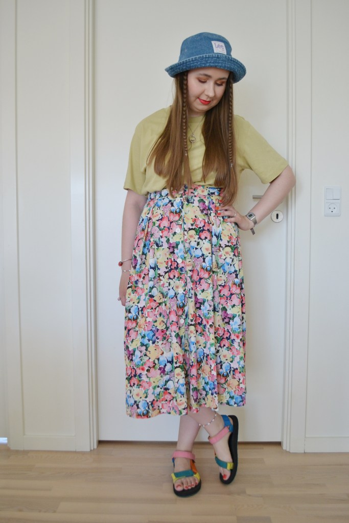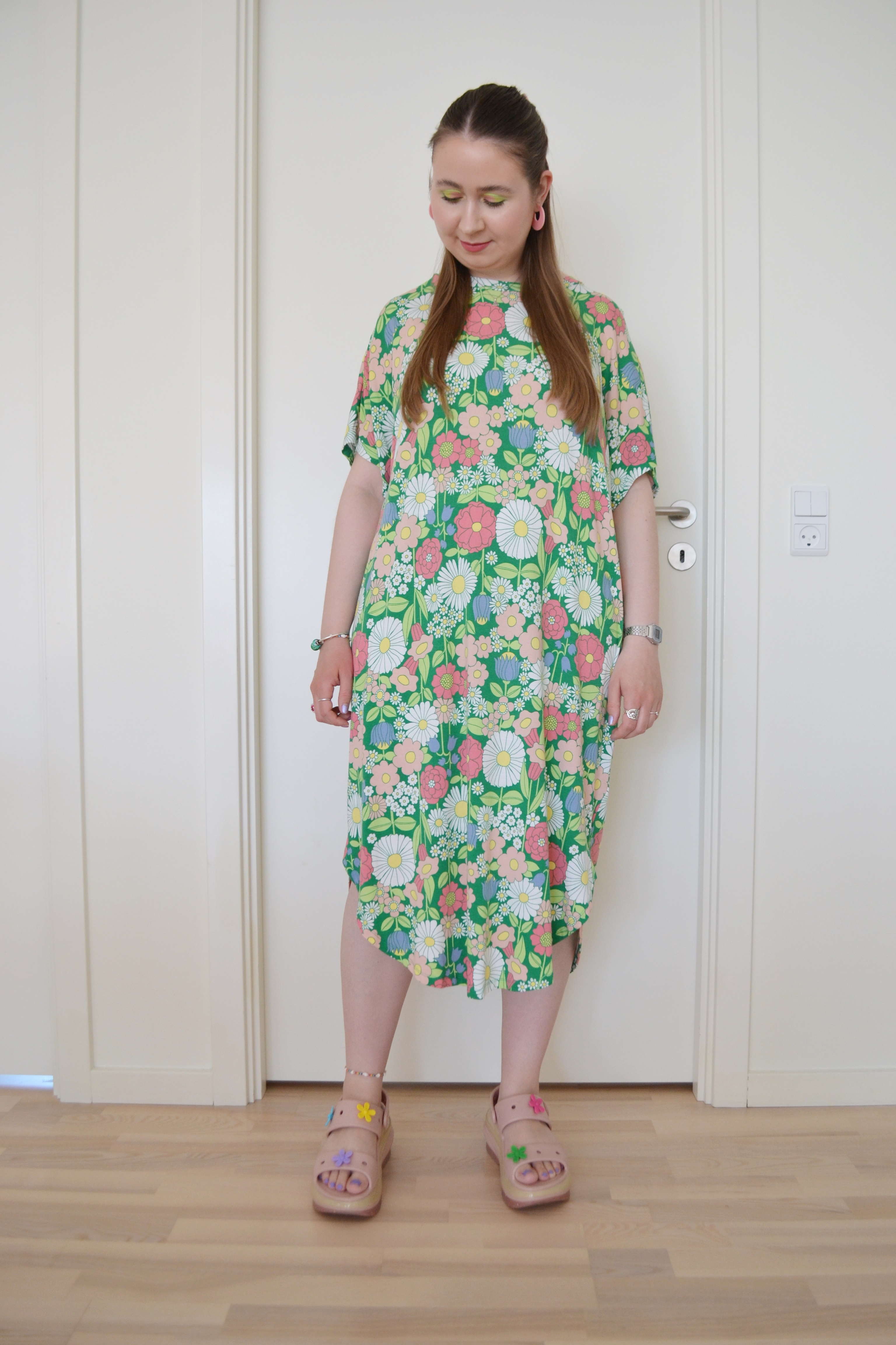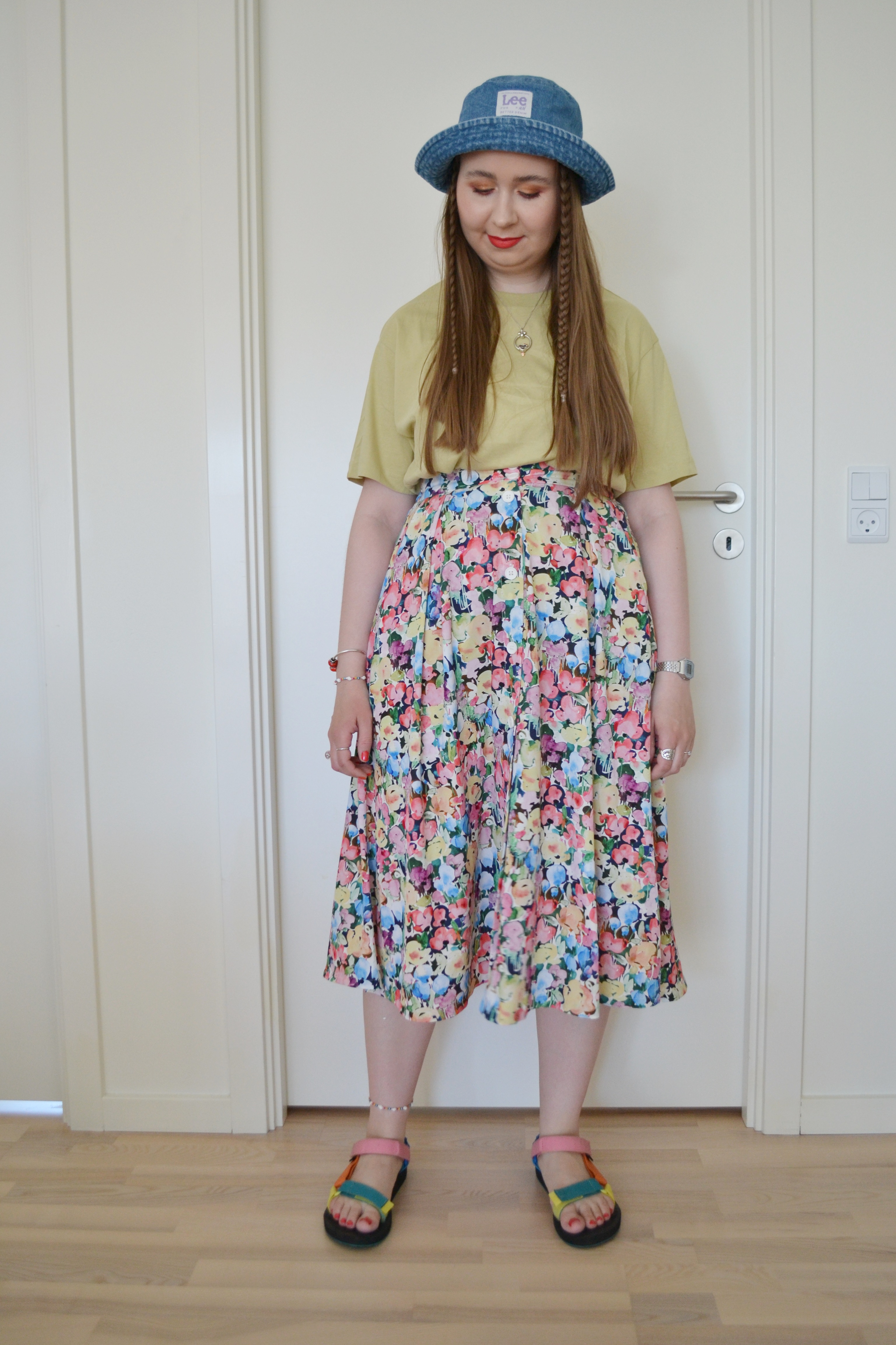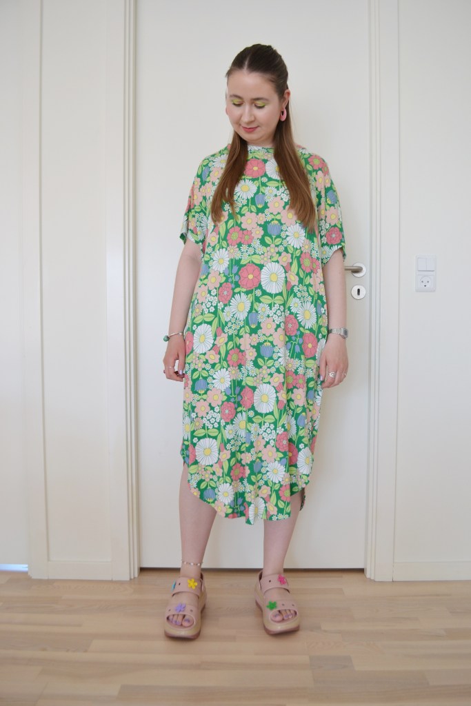 Here’s what I wore Wednesday June 7. The colour of the T-shirt matched the flowers on the dress perfectly, however, I wish that it had had a different shape and neckline.
