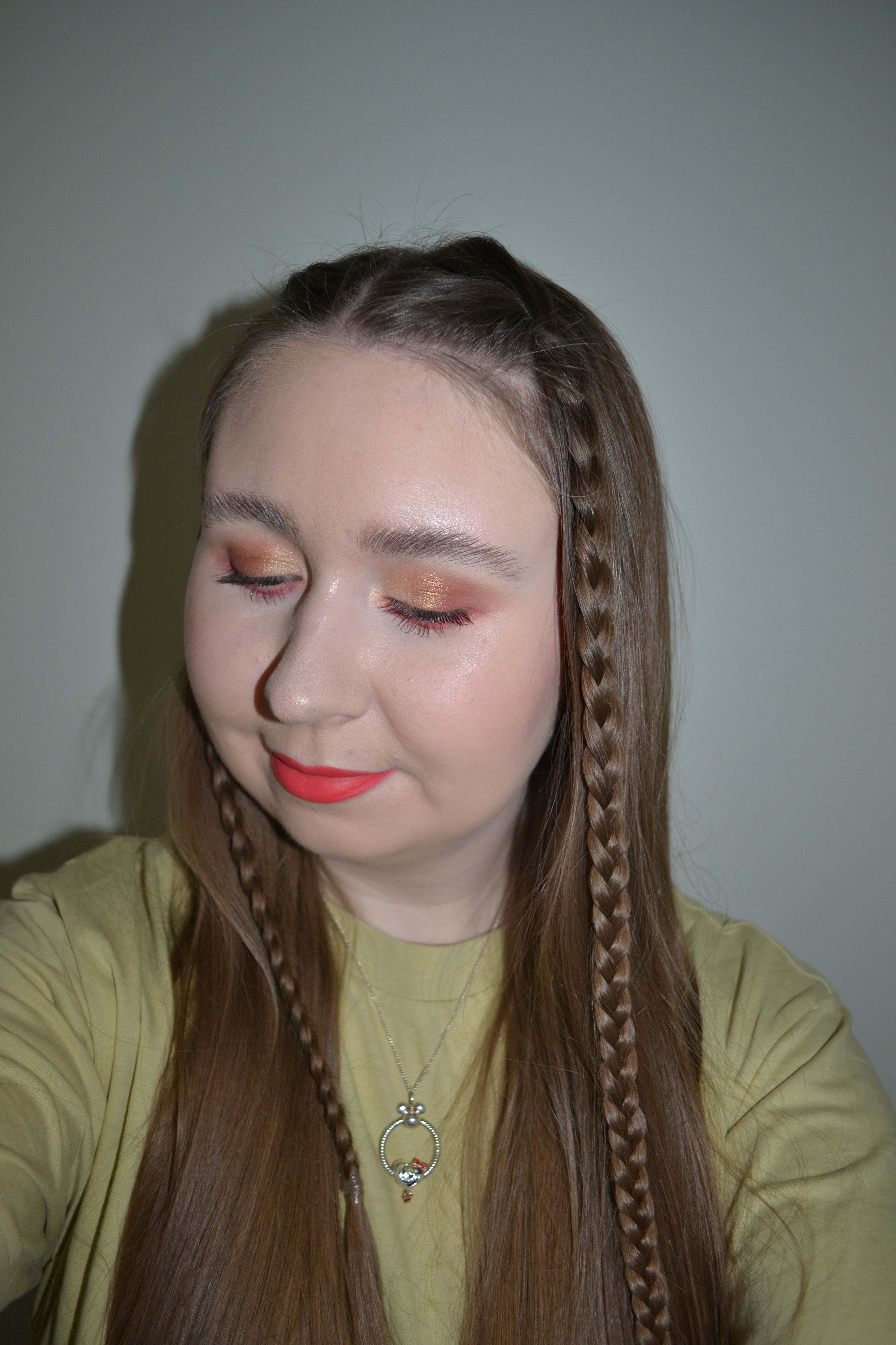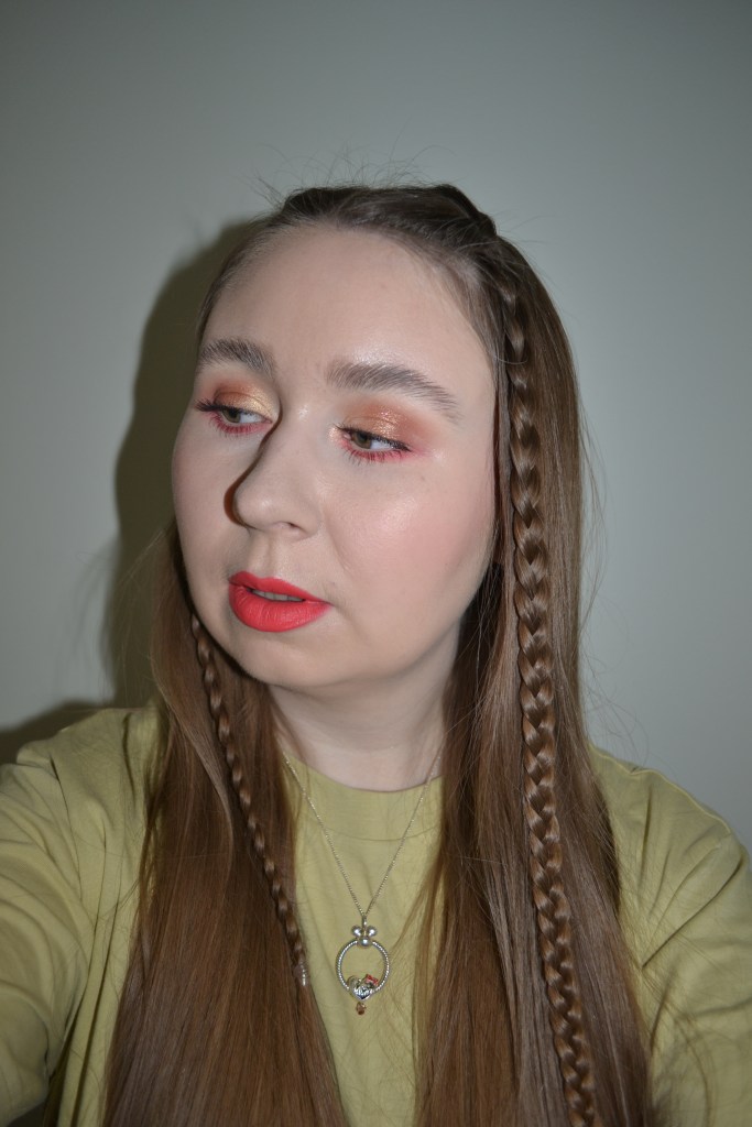 Here’s the make-up I wore with this outfit. I really like the matching lipstick and eyeshadow on the lower lash line; the colour is so pretty and summery.