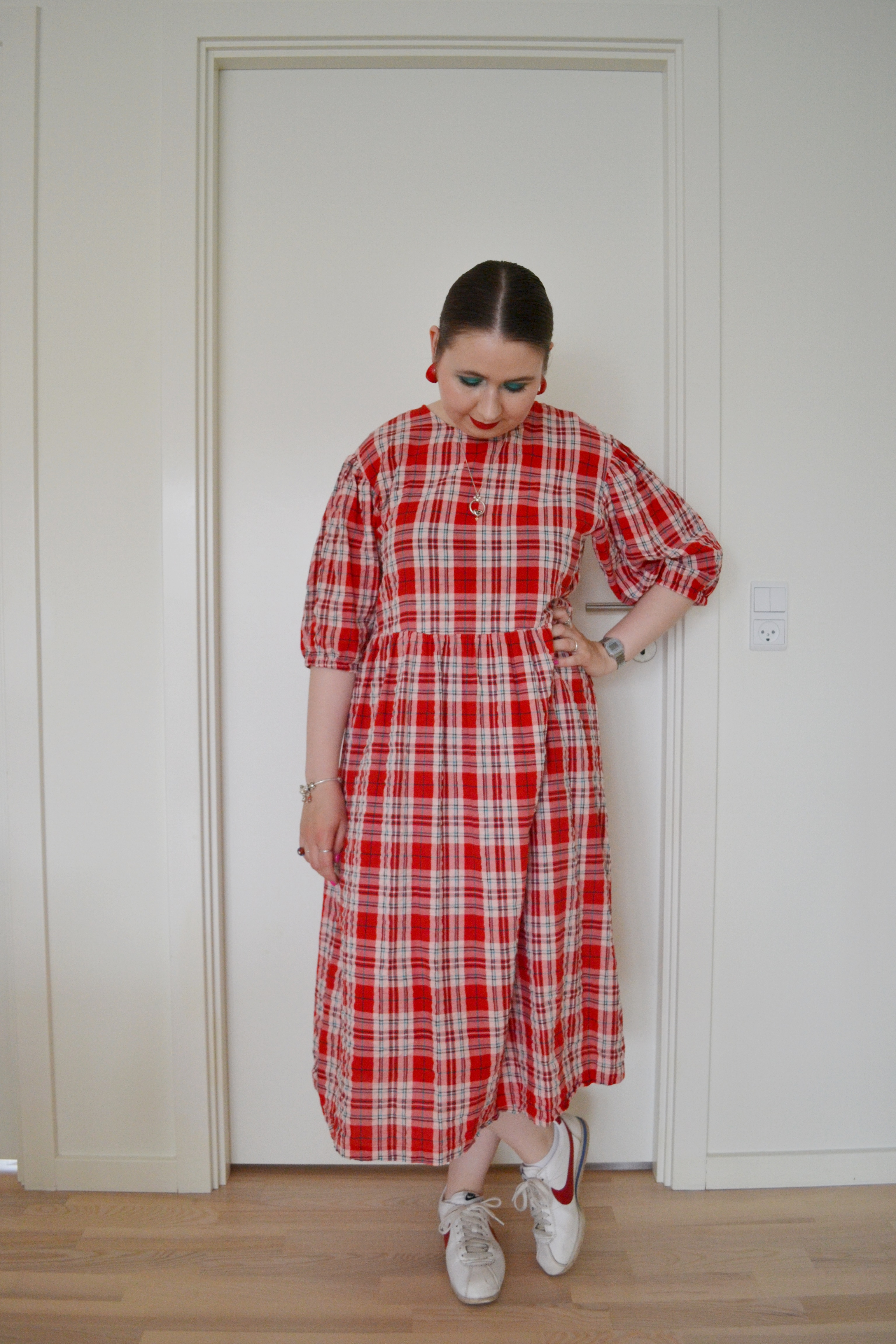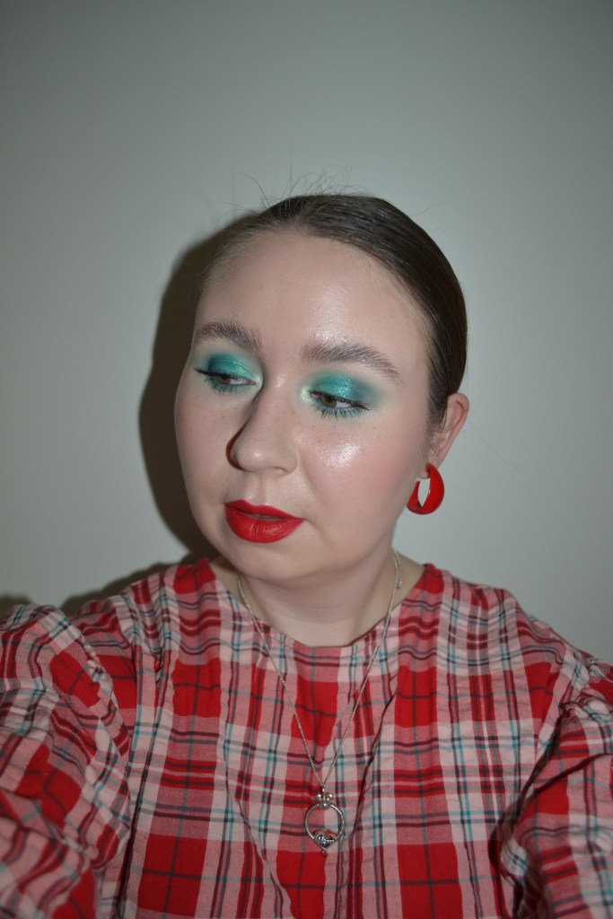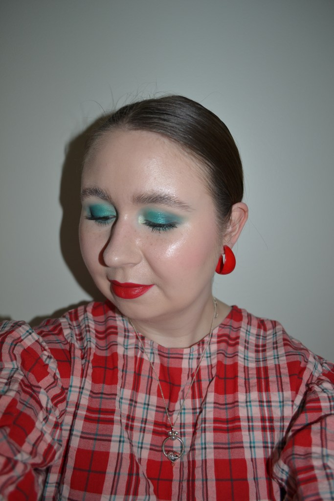 Here’s the make-up I wore with this outfit. I’m pretty sure that I’ve worn a teal eye look and red lips every time I’ve worn this dress, but how can I not?