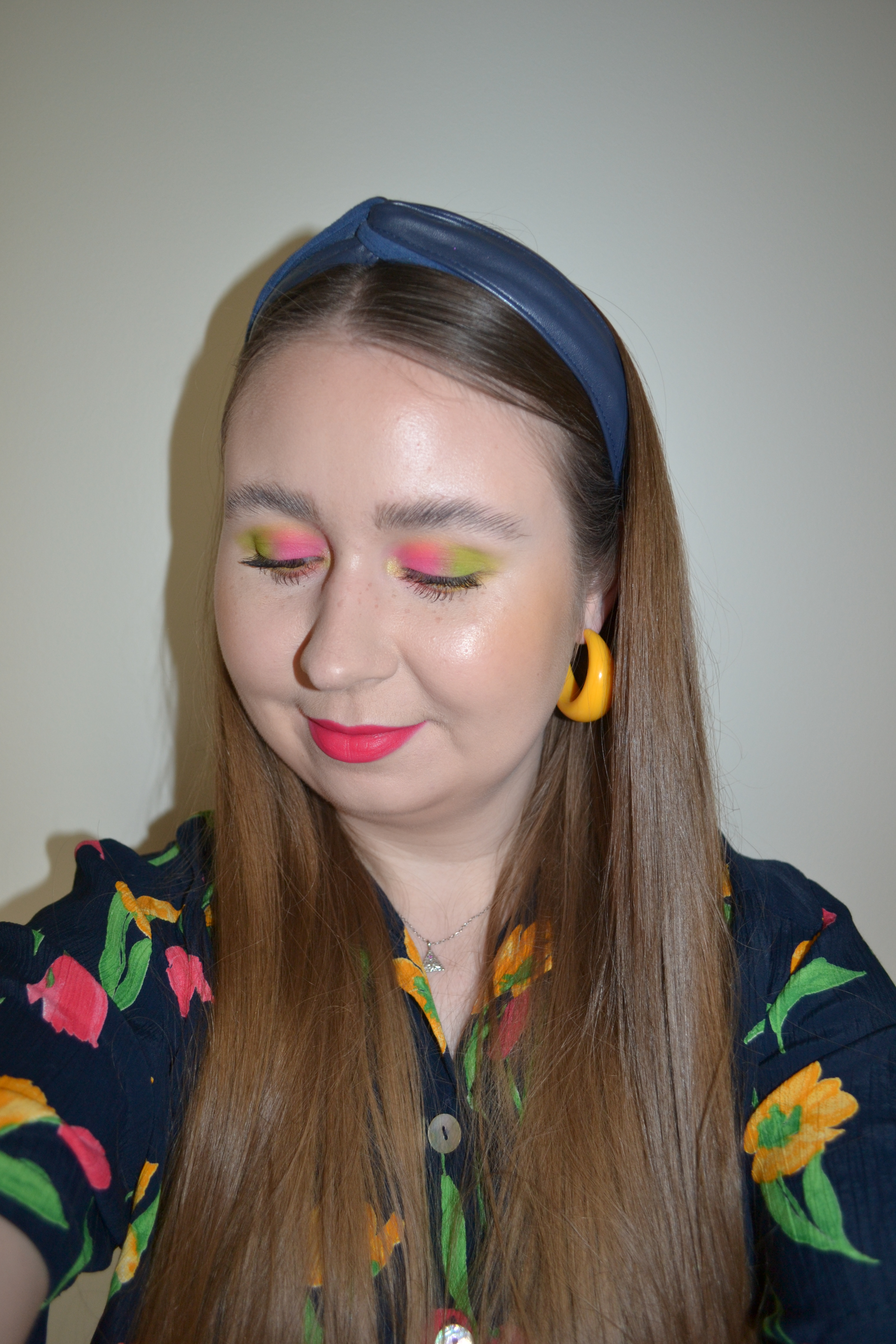 Here’s the make-up I wore with this outfit. A colourful, almost all matte eye look, which is not something I wear very often. An all matte look I mean. Colourful looks I wear all the time.