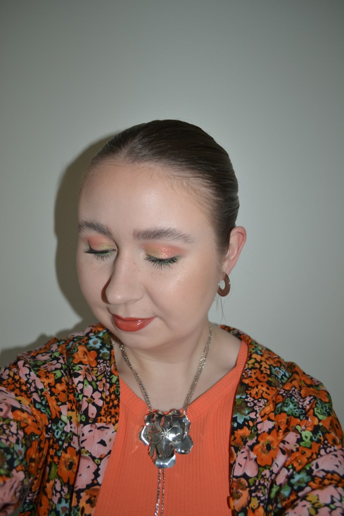 (Base: primers – Huda Beauty Glowish Blur Jam silicone-free smoothing primer + Catrice Soft Glam filter fluid (shade: 010 Fair-Light), foundations – Make Up For Ever HD Skin Undetectable stay-true foundation (shade: 1N06) + Revolution Conceal & Define full coverage foundation (shade: F0), concealer – Natasha Denona Hy-Glam concealer (shades: RN1 + N2), powders – Laura Mercier Translucent Loose Setting Powder Tone Up in Rose + Laura Mercier Translucent Loose Setting Powder Ultra-Blur in Translucent, freckles – KimChi Chic Candy Girl Fake Freckles in Afternoon in The Flower Field. Face make-up: bronzer – MAC Radiant Matte bronzing powder (shade: Beige-ing Beauty), blusher + highlighter – Unearthly Cosmetics Get Groovy highlighter duo (shades: In Your Dreams + Slick). Eye make-up: base – MAC Pro Longwear Paint Pot in Painterly, eyeshadows – Essence eyeshadow in 05 Granny Pants + Unearthly Cosmetics Get Groovy eyeshadow palette (shades: Groovy + Funky + Rad + Stellar + Chill + Fox), mascaras – MAC Extended Play Gigablack Lash mascara + Rare Beauty Perfect Strokes universal volumizing mascara, eyeliner – Colourpop BFF Créme gel liner in Aglow. Eyebrows: e.l.f. Cosmetics Brow Lift + Maybelline Brow Ultra Slim pencil in Medium Brown. Lips: Morphe x Nyane Color pencil in Pumpkin Spice + Oden’s Eye Alva Kiss of a Fairy cream lipstick in S102 Love Jasmine + Unearthly Cosmetics lipgloss in Psych)