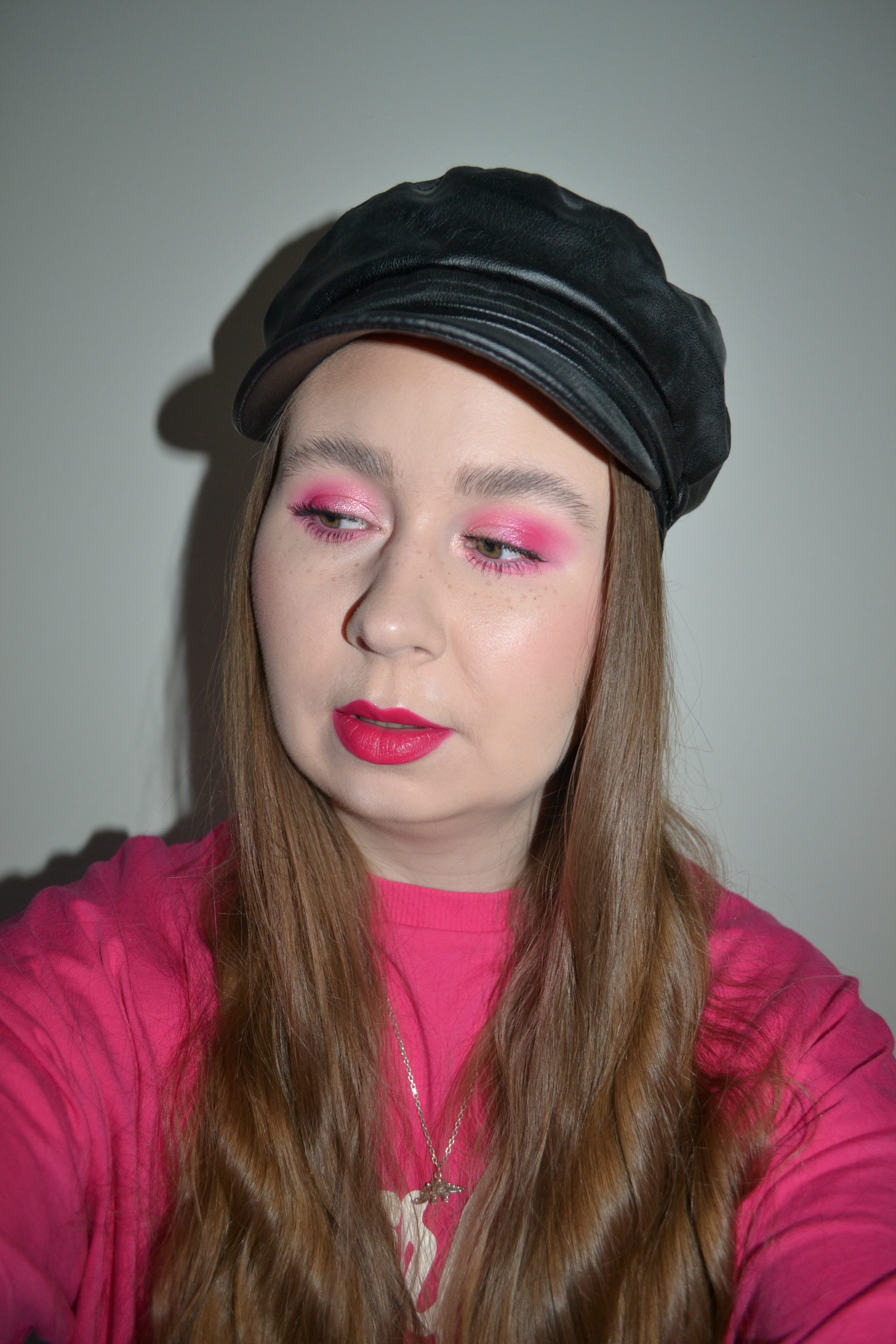 (Base: primer – Lottie London Bubble Tea primer, foundation – Clinique Even Better Clinical serum foundation SPF 20 (shade: WN 01 Flax), concealers – Smashbox x Becca Under Eye Brightening Corrector in Fair/Light + Clinique Even Better All Over concealer + eraser (shade: WN 01 Flax), powders – Laura Mercier Translucent Loose Setting Powder Tone Up in Rose + Catrice HD Baking & Setting loose powder in C01 Translucent, freckles – KimChi Chic Candy Girl Fake Freckles in Afternoon in The Flower Field. Face make-up: bronzer + highlighter – Catrice Holiday Skin bronze & glow palette in 010 Out Of Office, blusher – Lunar Beauty Nude Prism blush cheek palette (shade: Kawaii). Eye make-up: base – MAC Pro Longwear Paint Pot in Painterly, eyeshadows – Revolution x Grease It’s The Word shadow palette (shades: Feel-Good + Sassy + So Adolescent + Shape Up + Indeed), mascaras – MAC Extended Play Gigablack Lash mascara + Rare Beauty Perfect Strokes universal volumizing mascara, eyeliner – Oden’s Eye Solmåne gel liner in 001 Pitaya. Eyebrows: e.l.f. Cosmetics Brow Lift + Maybelline Brow Ultra Slim pencil in Medium Brown. Lips: Colourpop Barbie Lippie pencil in Malibu Sunset + Coloupop Barbie Créme Lux lipstick in Malibu Sunset)