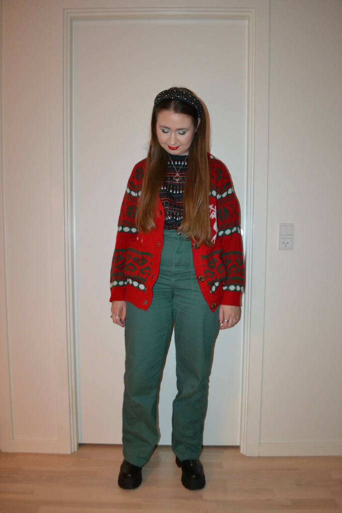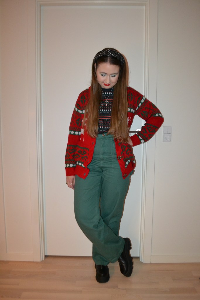 Sort of subtle Posted on November 27, 2023 by Mucha-Lucha Here’s what I wore Wednesday November 22. This look is obviously Christmassy, but still in a sort of subtle way, I think. (Cardigan – Pieces, T-shirt – Monki, trousers – H&M, shoes – Asos Design) Share this: Click to share on X (Opens in new window) X Click to share on Facebook (Opens in new window) Facebook Like Loading... Related