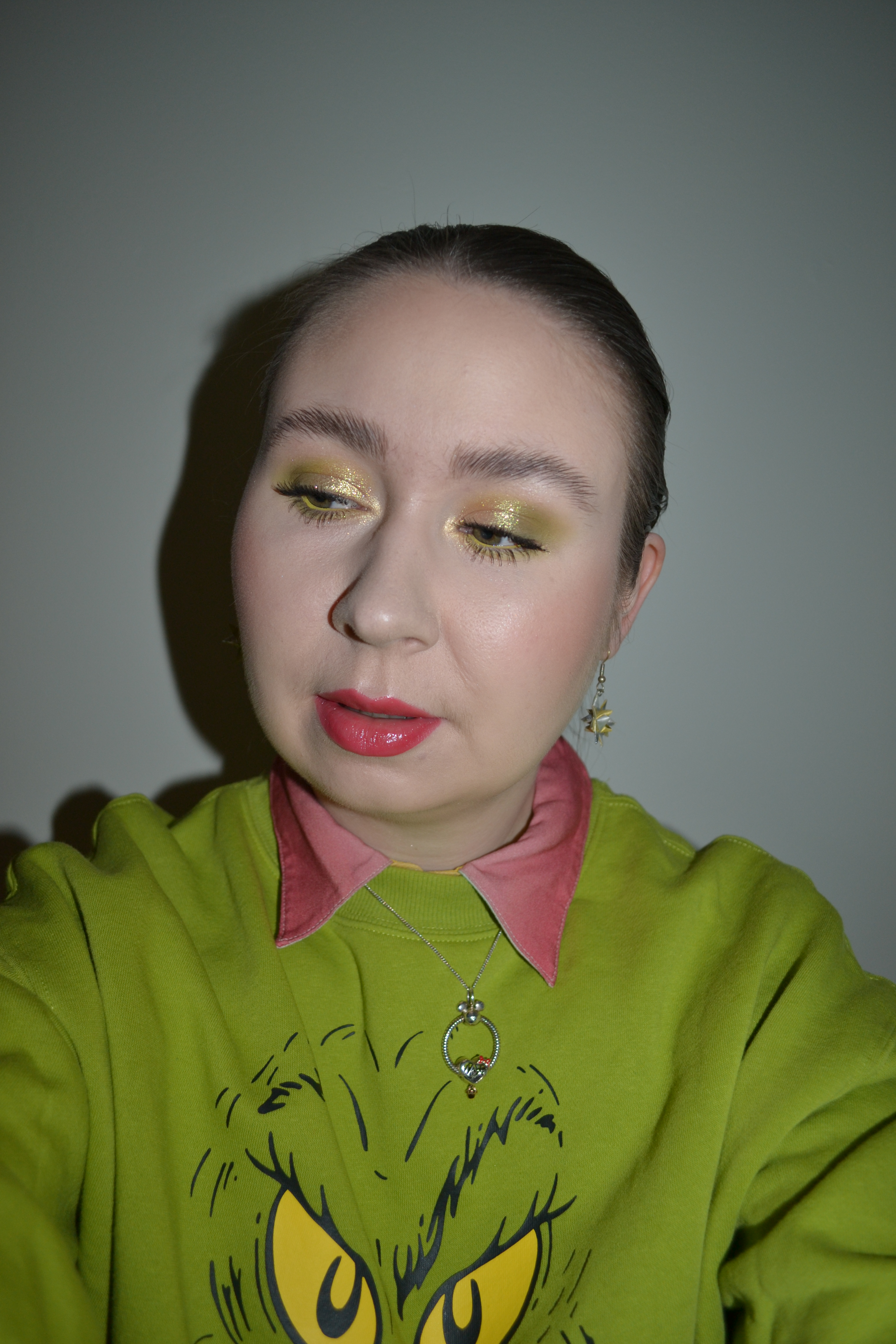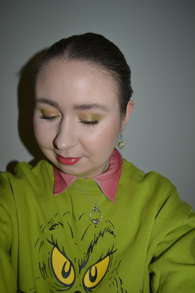 Here’s the make-up I wore with this outfit. I love a lime green/olive green eye look, and how pretty and juicy looking is the lip colour?!