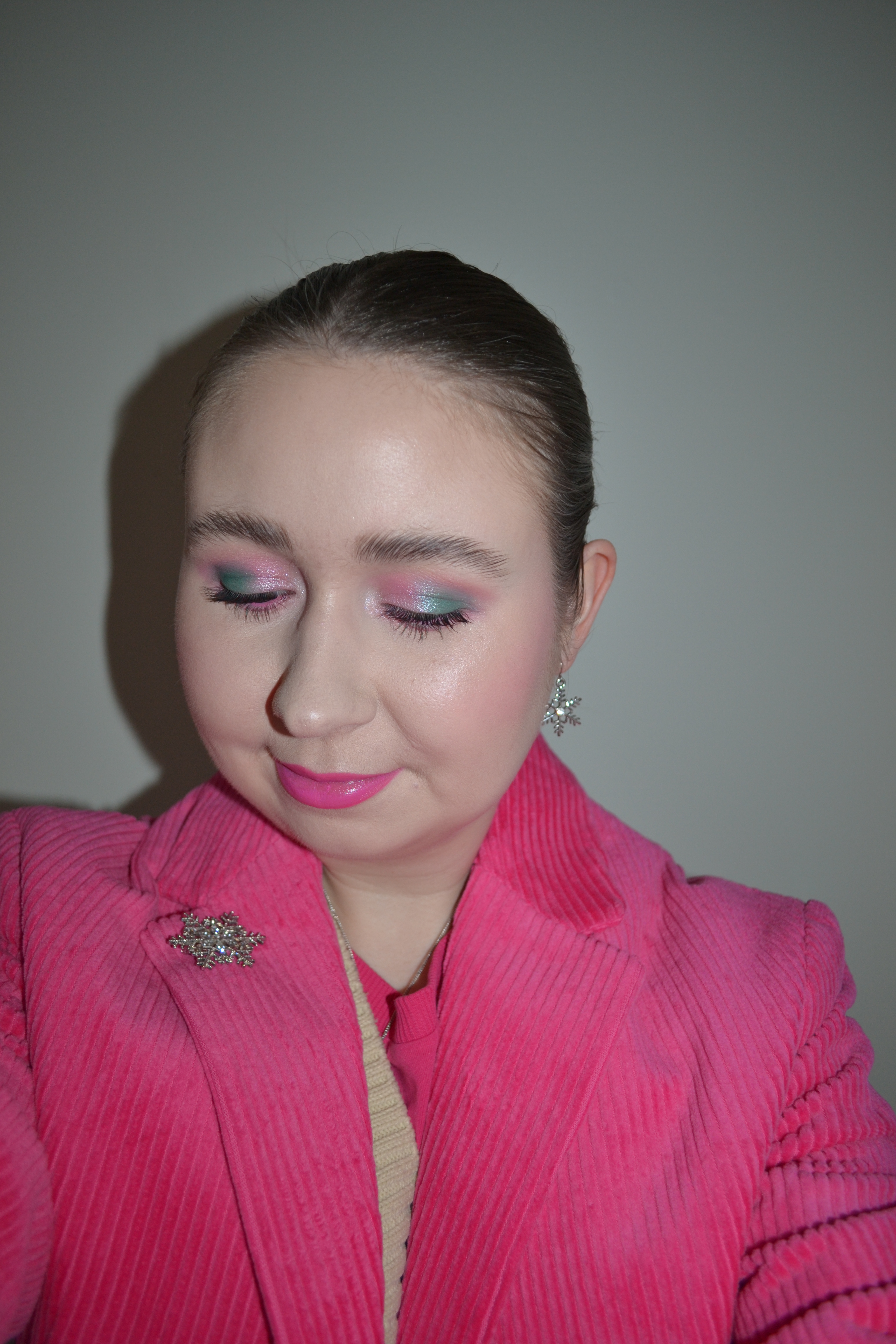 Here’s the make-up I wore with this outfit. As much as I enjoy creating and wearing green and red Christmas make-up looks, it was nice to wear a bit of pink in the middle of December.