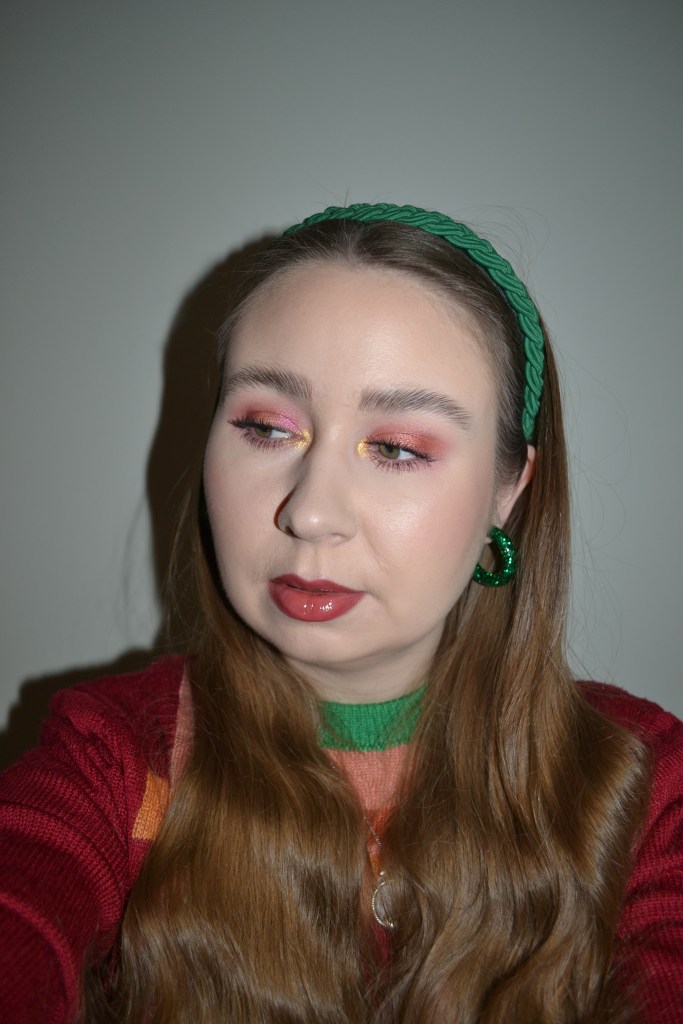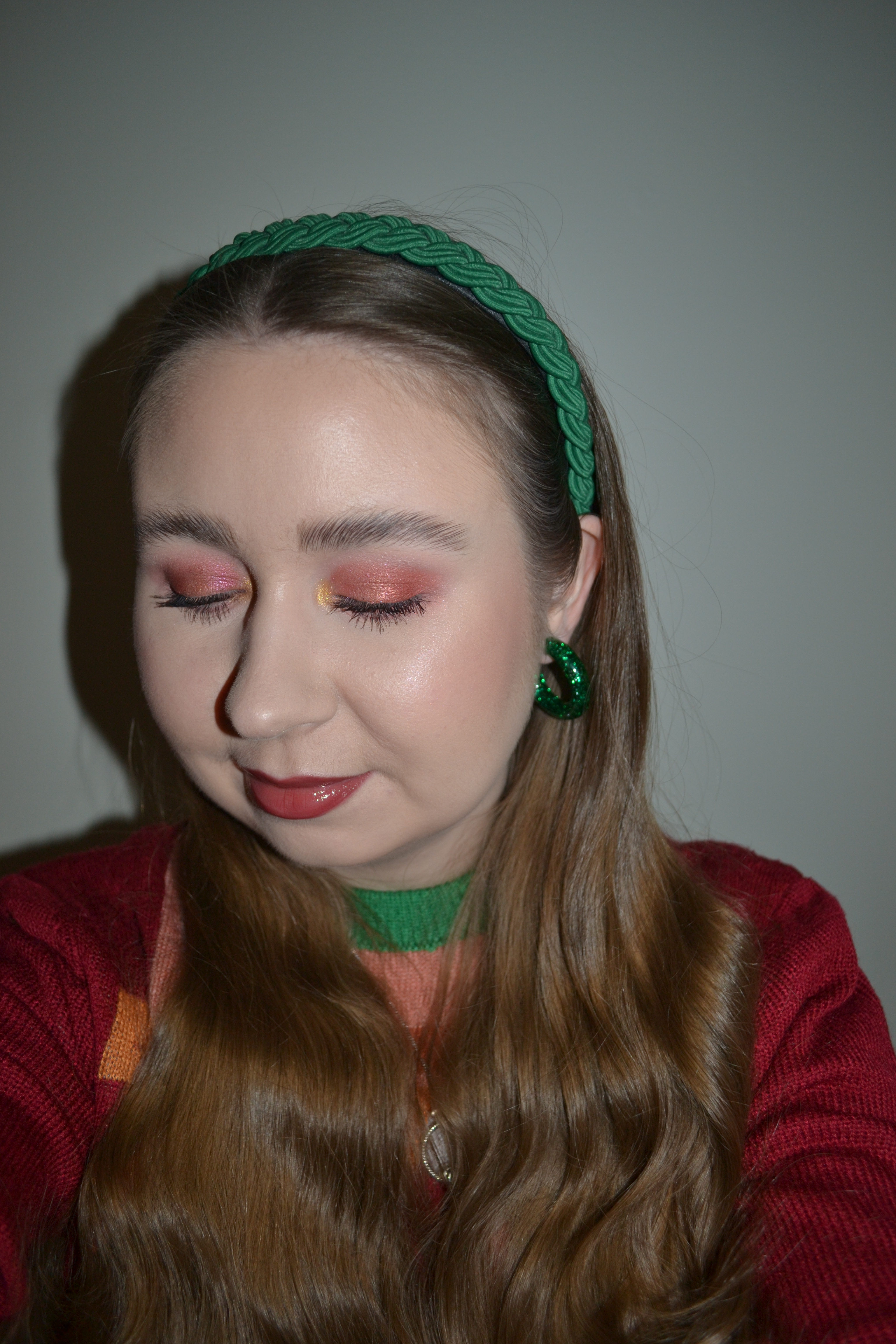 Here’s the make-up I wore with this outfit. After wearing lots of green eye looks and red lips throughout December, it was fun wearing a make-up look in completely different colours.