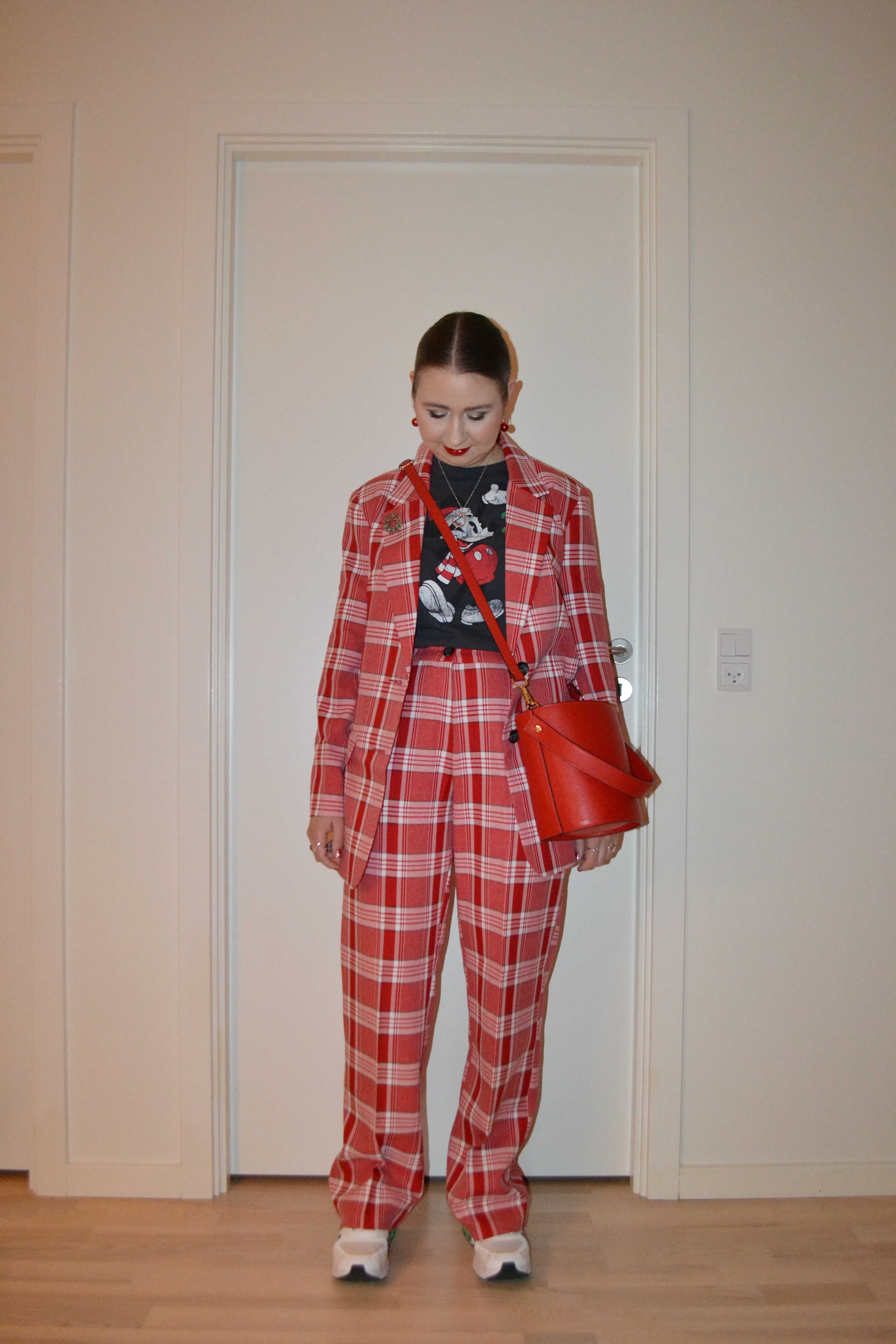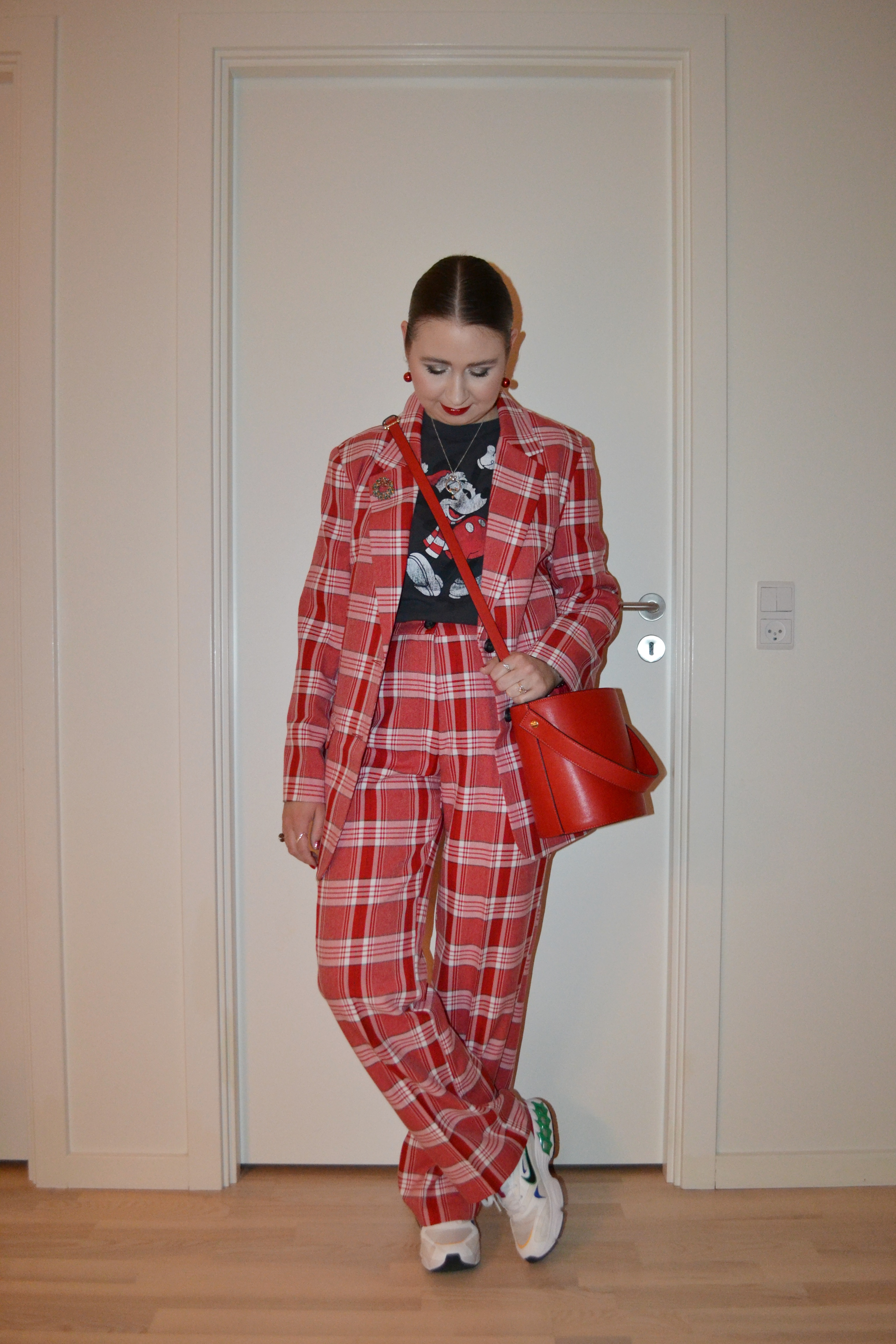 (Blazer + trousers – Asos Design, T-shirt – H&M, bag – Topshop, sneakers – Nike)