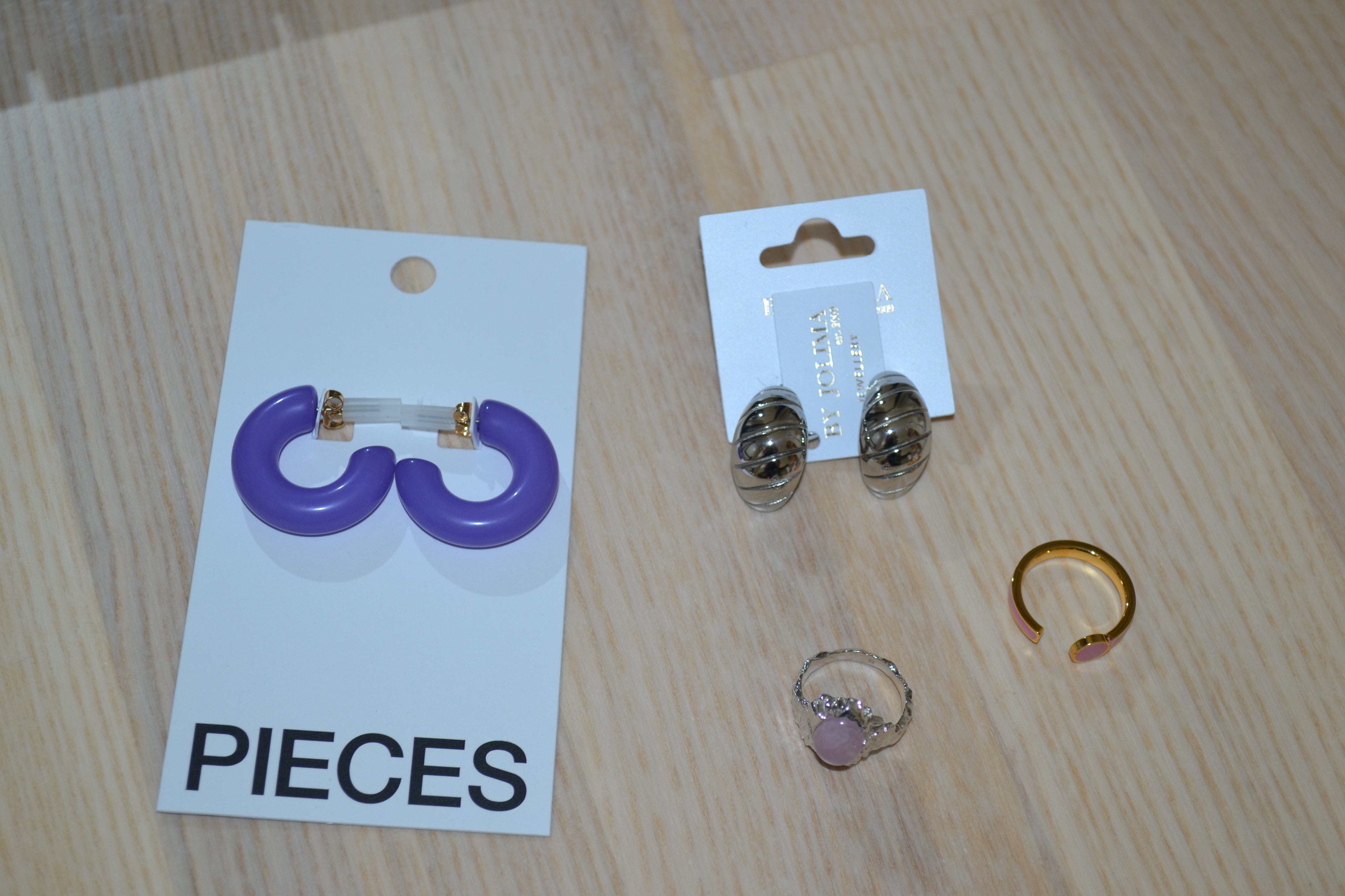 Lastly, I purchased two pairs of earrings and two rings. The purple hoops are from Pieces and the silver “croissant” earrings are from a brand called By Jolima. The silver ring is from Maanesten, and the gold and pink ring is from a brand called Design Letters. I got all of these pieces on sale.