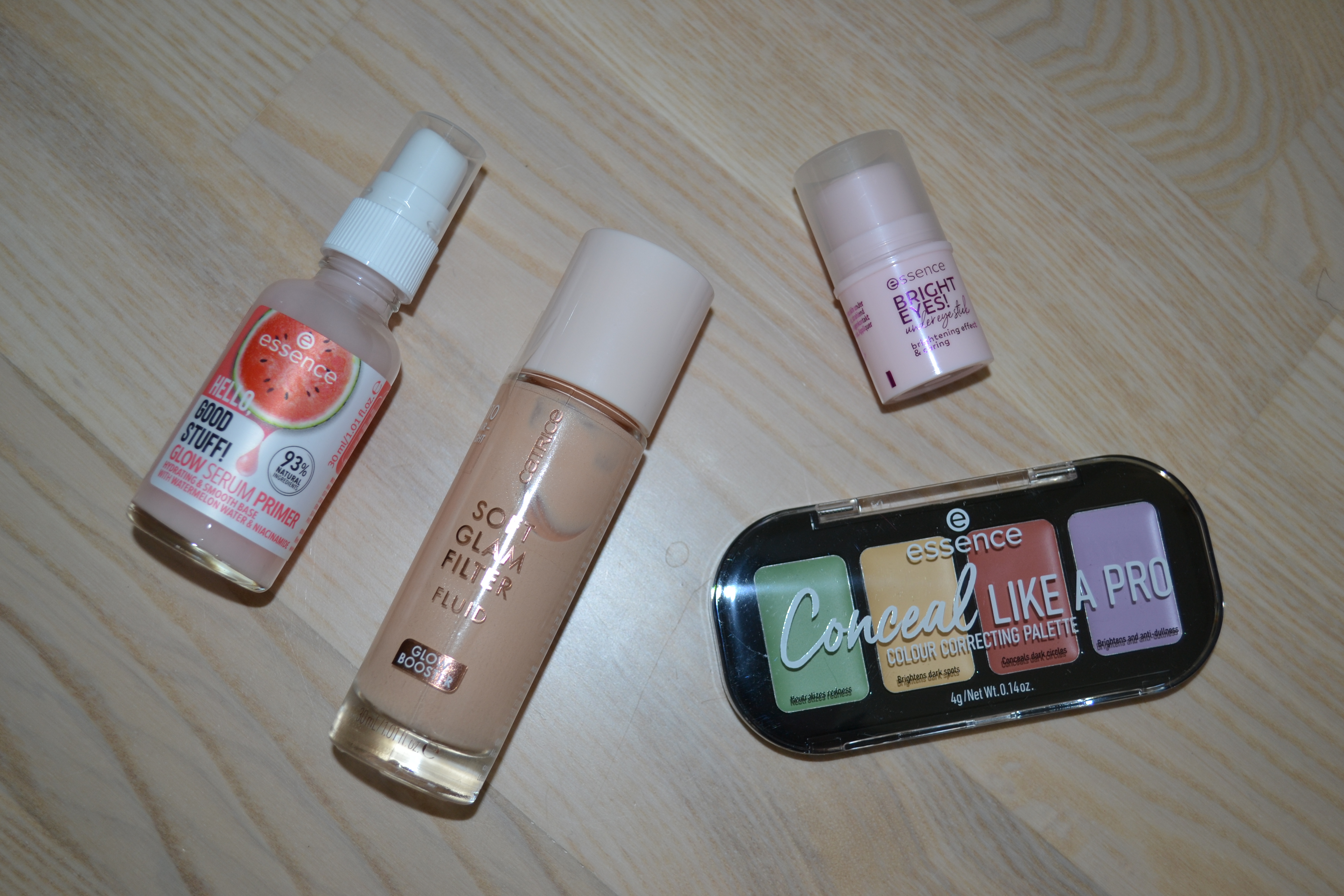 Let’s start off with base products. I got the Essence Hello Good Stuff glow serum primer, the Catrice Soft Glam filter fluid glow booster in 010 Fair-Light, the Essence Bright Eyes! under eye stick in 01 Soft Rose, and the Essence Conceal Like A Pro colour correcting palette. I haven’t formed a proper opinion on the brigthening and colour correcting products yet, but I really enjoy the primer and the glow booster. I actually think that the Catrice Soft Glam filter fluid glow booster is a very close dupe to the Charlotte Tilbury Hollywood Flawless Filter.