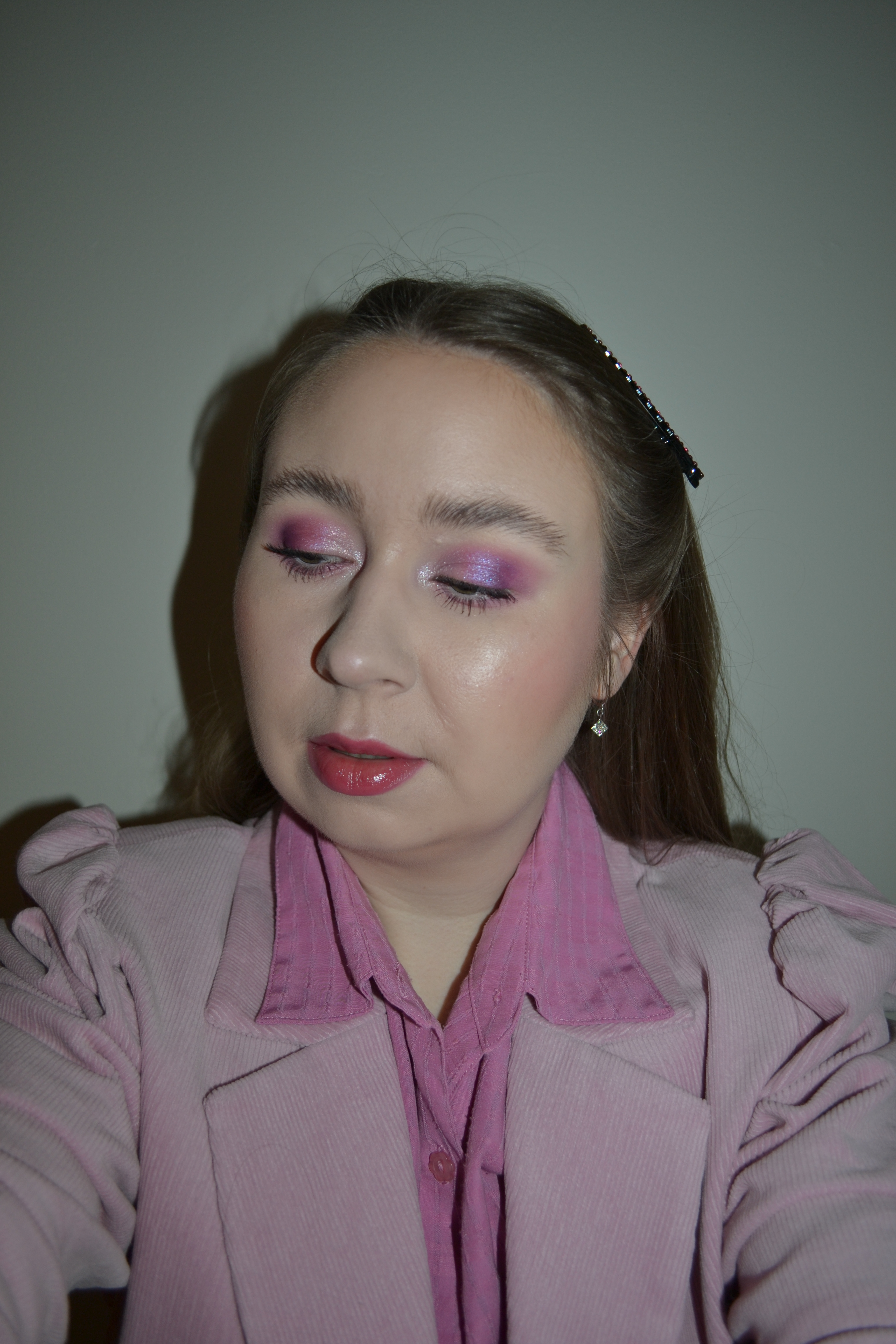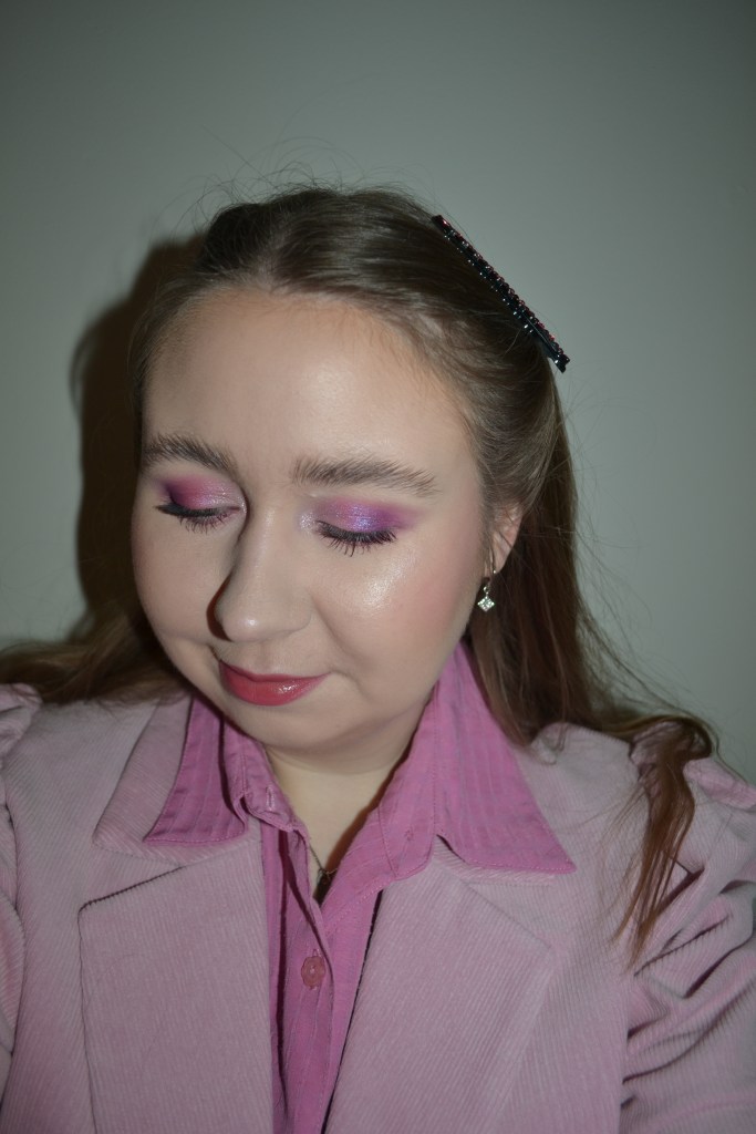 (Base: primer – Essence Hello, Good Stuff! glow serum primer, foundation – Missha M Perfect Cover B.B Cream Spf 42 (shade: 21 Light Beige), concealer – Natasha Denona Hy-Glam concealer (shade: RN1 + N2), powders – Huda Beauty Easy Bake powders (shades: Cherry Blossom Cake + Sugar Cookie). Face make-up: bronzer – Revolution Ultra Cream Bronzer in Light, blusher – Catrice Sparks Of Joy blush stick in C02 All I Want For Christmas Is Pink, highlighter – Catrice METAFACE highlighter face glaze pot in C01 Virtual. Eye make-up: base – MAC Pro Longwear Paint Pot in Painterly, eyeshadows – Essence eyeshadow in 05 Granny Pants + Colourpop Orchid You Not palette (shades: Rebloom + Ada + Of All Purple + Pretty One) + Colourpop Super Shock shadow in The Griffith, mascara – Catrice Glam & Doll False Lashes mascara, eyeliner – NYX Faux Whites eyeliner in Lavender Blush. Eyebrows: Anastasia Beverly Hills Brow Freeze + Maybelline Brow Ultra Slim pencil in Medium Brown. Lips: NYX Slim lip pencil in Prune + Rimmel Kind & Free tinted lip balm in 006 Berry Twist)