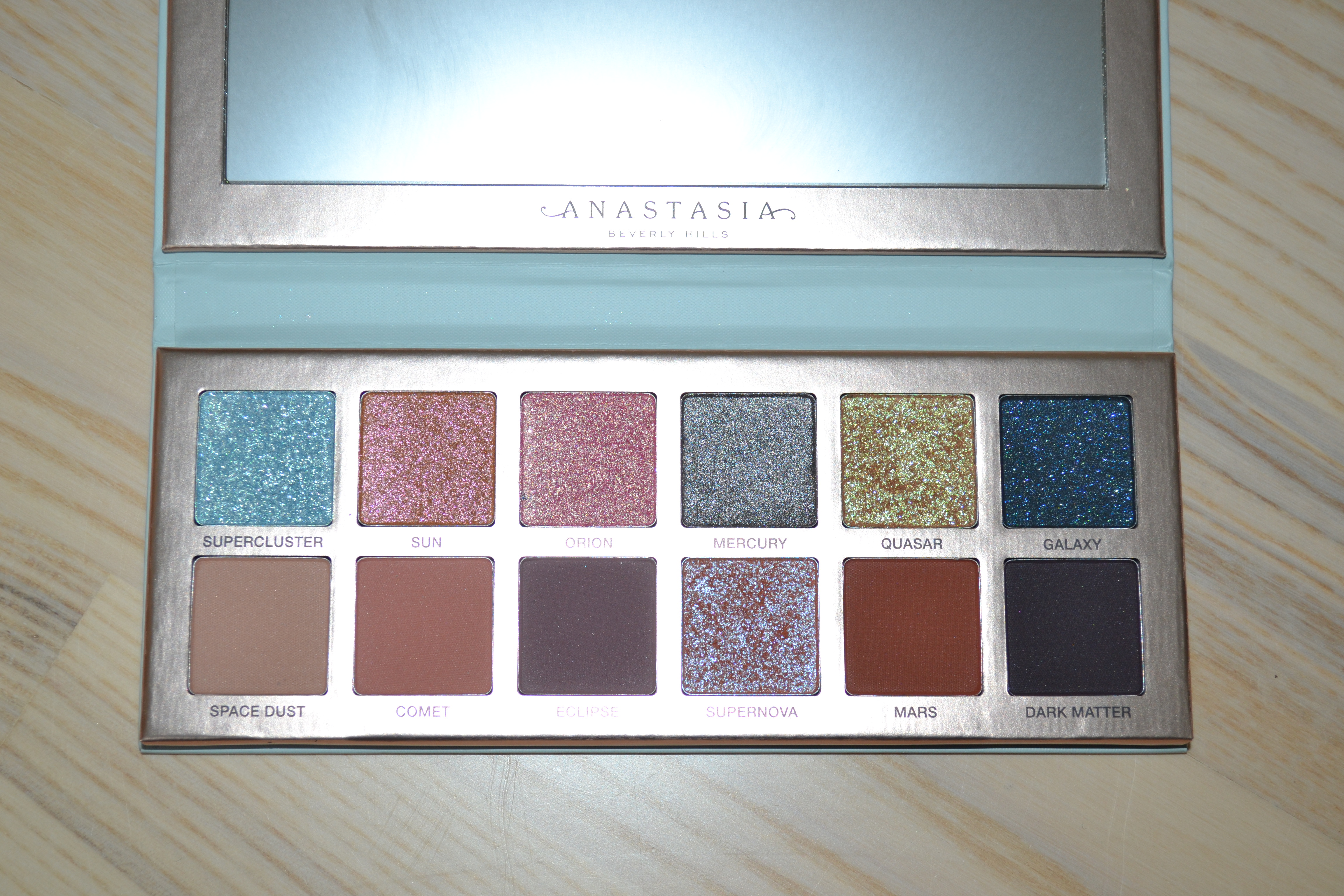 I don’t buy all the Anastasia Beverly Hills palettes, but I’d been wanting to try the Cosmos palette to see if the shifty shimmers were any good, so when I found it on sale, I picked it up. I mean, it’s not indie shimmers, but they were pretty, especially the light blue shimmer called Supercluster.