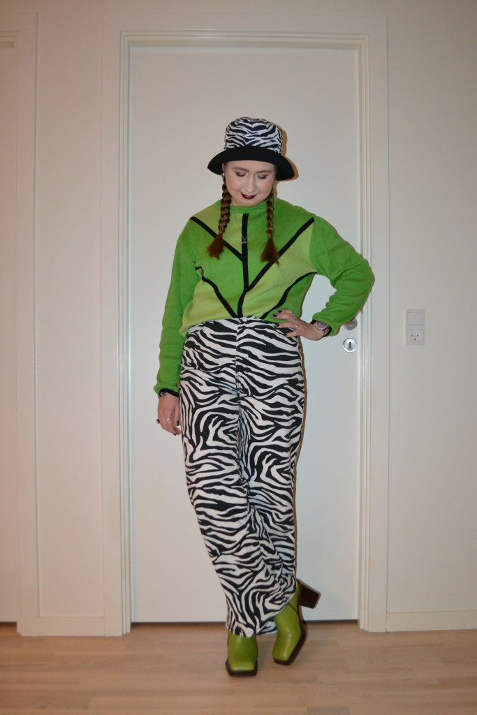 Alternating zebra print and lime green Posted on March 5, 2024 by Mucha-Lucha Here’s what I wore Thursday January 11. I love this look; the alternating zebra print and lime green pieces really work for me. (Bucket hat – Bershka, jumper – second hand, jeans – H&M, boots – Asos Design) Share this: Click to share on X (Opens in new window) X Click to share on Facebook (Opens in new window) Facebook Like Loading... Related