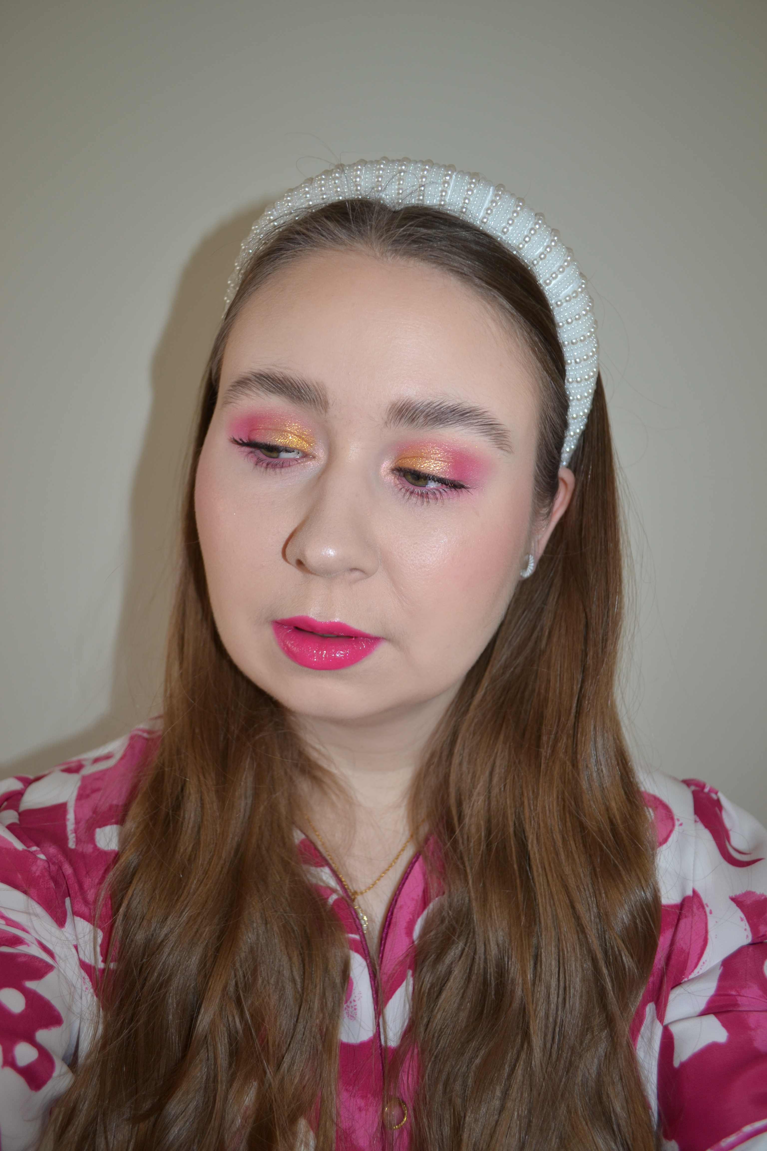 (Base: primer – e.l.f. Cosmetics Liquid Poreless Putty primer, foundation – Make Up For Ever HD Skin Undetectable stay-true foundation (shades: 1N00 + 1N06), concealer – Natasha Denona Hy-Glam concealer (shade: RN1 + N2), powders – Laura Mercier Translucent Loose Setting Powder Tone Up in Rose + Laura Mercier Translucent Loose Setting Powder Ultra-Blur in Translucent. Face make-up: bronzer – Trixie Cosmetics Flower Power bronzer in Darling Daisy, blusher – Unearthly Cosmetics Devour blush highlighter duo (shade: Slay), highlighters – Trixie Cosmetics Flower Power bronzer in Darling Daisy (highlight shade) + Unearthly Cosmetics Devour blush highlighter duo (shade: Delicate). Eye make-up: base – MAC Pro Longwear Paint Pot in Painterly, eyeshadows – Essence eyeshadow in 20 Cream + Natasha Denona Circo Loco palette (shade: Joker) + Pat McGrath Labs Mothership VIII Divine Rose II artistry palette (shades: Rose Seduction + Gold Lusts 001 + Astral Pink Moon + Skinshow Rose Opal), mascara – Catrice Glam & Doll False Lashes mascara, eyeliner – Oden’s Eye Solmåne gel liners in 001 Pitaya. Eyebrows: Anastasia Beverly Hills Brow Freeze + Maybelline Brow Ultra Slim pencil in Medium Brown. Lips: NYX Slim lip pencil in Fuchsia + MAC No Faux Pas lipstick + Colourpop Rudolph the Red-Nosed Reindeer Lux lip gloss in Hermey)