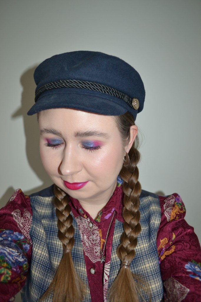 (Base: primer – NYX The Marshmellow primer, foundation – Urban Decay Stay Naked Hydromaniac Tinted Glow Hydrator (shade: 20 Fair Neutral), concealers – e.l.f. Cosmetics Putty Color-Correcting Eye Brightener (shade: Fair) + e.l.f. Cosmetics Hydrating Camo concealer (shade: Fair Beige), powders – Laura Mercier Translucent Loose Setting Powder Tone Up in Rose + Catrice All Matt Shine Control powder Healthy Look in 100 Neutral Fresh Beige. Face make-up: bronzer + blusher + highlighter – Pat McGrath Labs Divine Blush + Bronze + Glow Trio: Fleurever Nude (shades: Nude Honey + Naked Peony + Opal Allure). Eye make-up: base – Sigma Beauty Eyeshadow Base Primer in Ignite, eyeshadows – Essence eyeshadow in 20 Cream + Ace Beauté Paletteopoly palette (shades: Mullet + Fanny Pack + Boy Band + VHS + Vogue), mascara – Essence I Love Extreme crazy volume mascara, eyeliner – Colourpop BFF Créme gel liner in Actin’ Up (Multi-chrome). Eyebrows: Anastasia Beverly Hills Brow Freeze + Maybelline Brow Ultra Slim pencil in Medium Brown. Lips: MAC Nightingale lip pencil + Laura Mercier High Vibe lip color in 142 Pop)