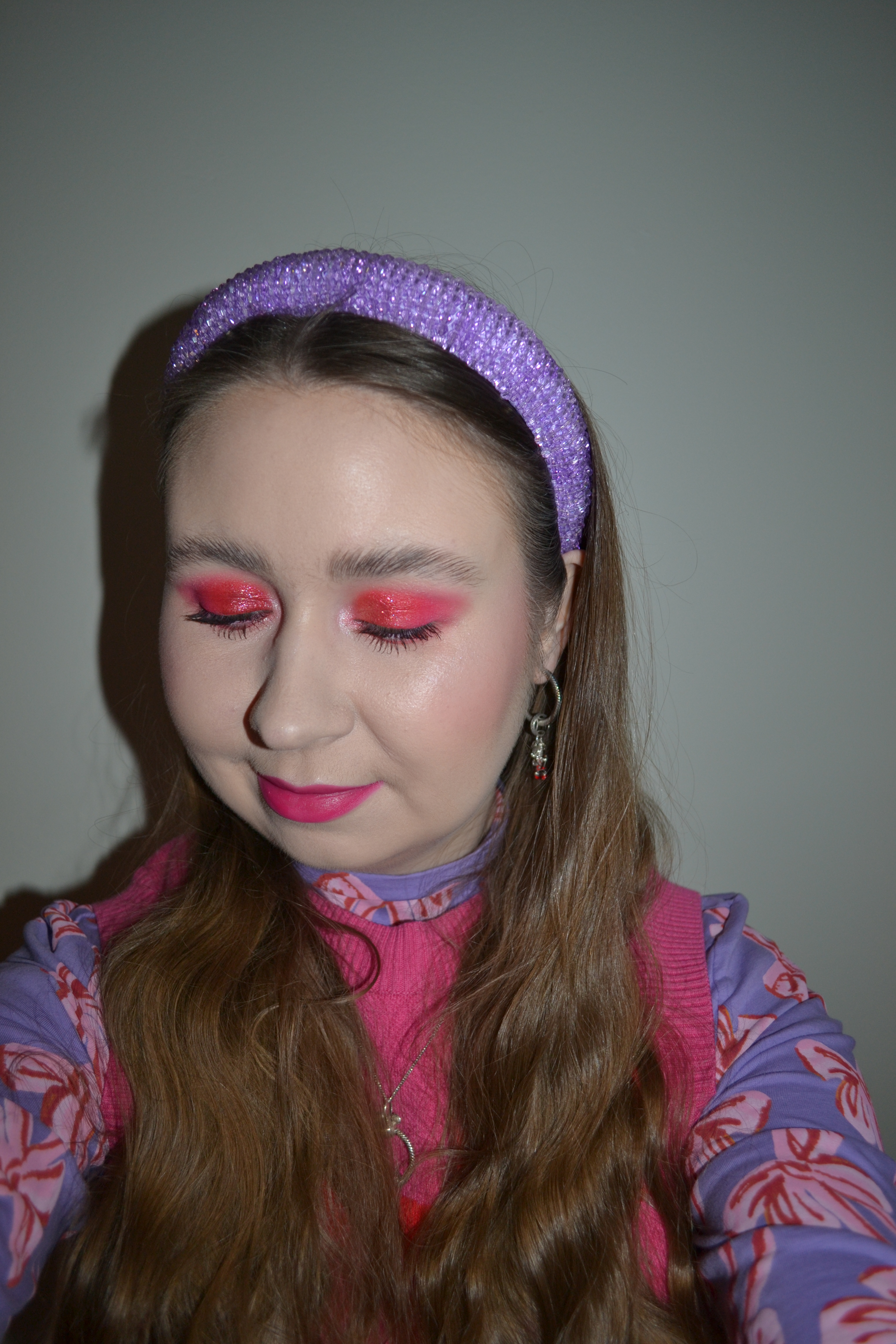 Here’s the make-up I wore with this outfit. I wanted to do an intense red eye look during Valentine’s Day “week”, and it went perfectly with my red, pink, and purple outfit that I wore the day after Valentine’s Day.
