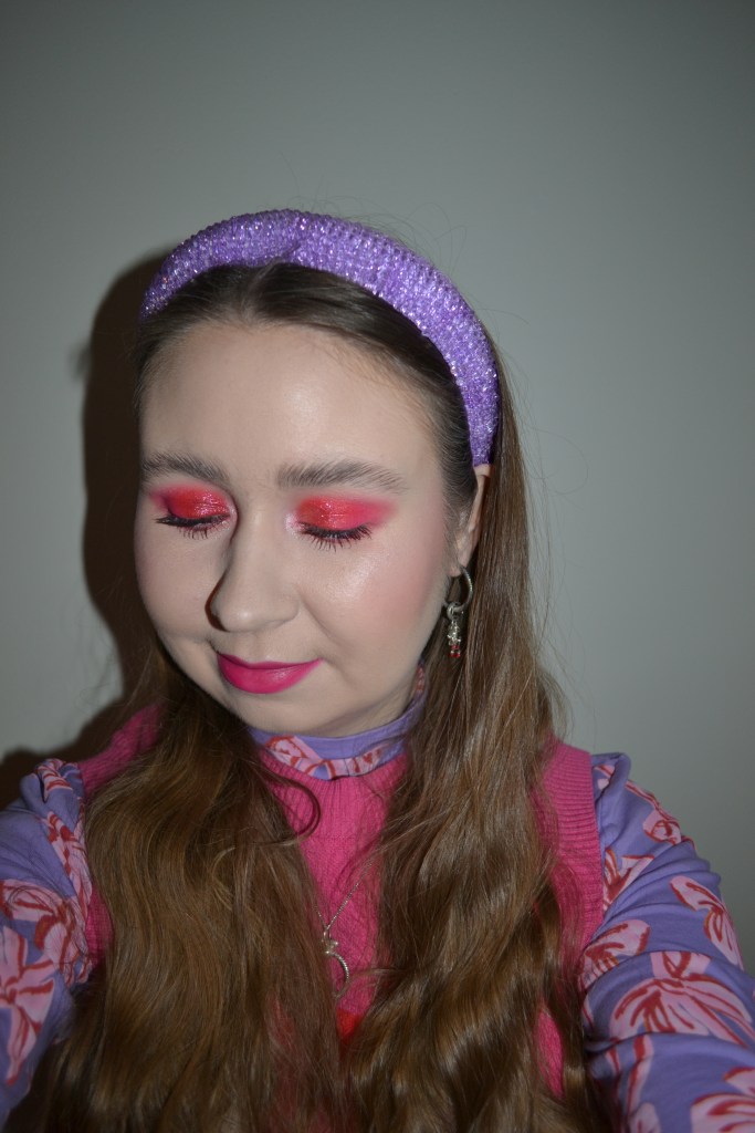 (Base: primer – Catrice Skin Glaze hydrating serum primer, foundation – L’Oreal Infaillible 24H Fresh Wear foundation (shade: 015 Porcelain), concealer – NYX Pro Fix Stick correcting concealers (shades: 0.2 Pink + 03 Alabaster), powders – Huda Beauty Easy Bake powder (shade: Cherry Blossom Cake) + Dior Backstage Face & Body Powder-No-Powder in 0 Neutral. Face make-up: bronzer – Makeup By Mario SoftSculpt Transforming Skin Enhancer in Light, blusher – Colourpop lip & cheek balm in Adore You, highlighter – Colourpop Super Shock highlighter in Lav Dreams. Eye make-up: bases – MAC Pro Longwear Paint Pot in Painterly + NYX Glitter primer, eyeshadows – Essence eyeshadow in 20 Cream + September Rose Cosmetics Still Pretty palette (shades: Red Rose + Azalea + Aster + Zinnia + Poppy + White Lotus), mascaras – MAC Extended Play Gigablack Lash mascara + Essence I Love Extreme crazy volume mascara, eyeliner – MAC Colour Excess Gel pencil eye liner in Lav-It. Eyebrows: Anastasia Beverly Hills Brow Freeze + Maybelline Brow Ultra Slim pencil in Medium Brown. Lips: MAC Talking Points lip pencil + Catrice Heart Affair matte liquid lipstick in C03 Taken?!)