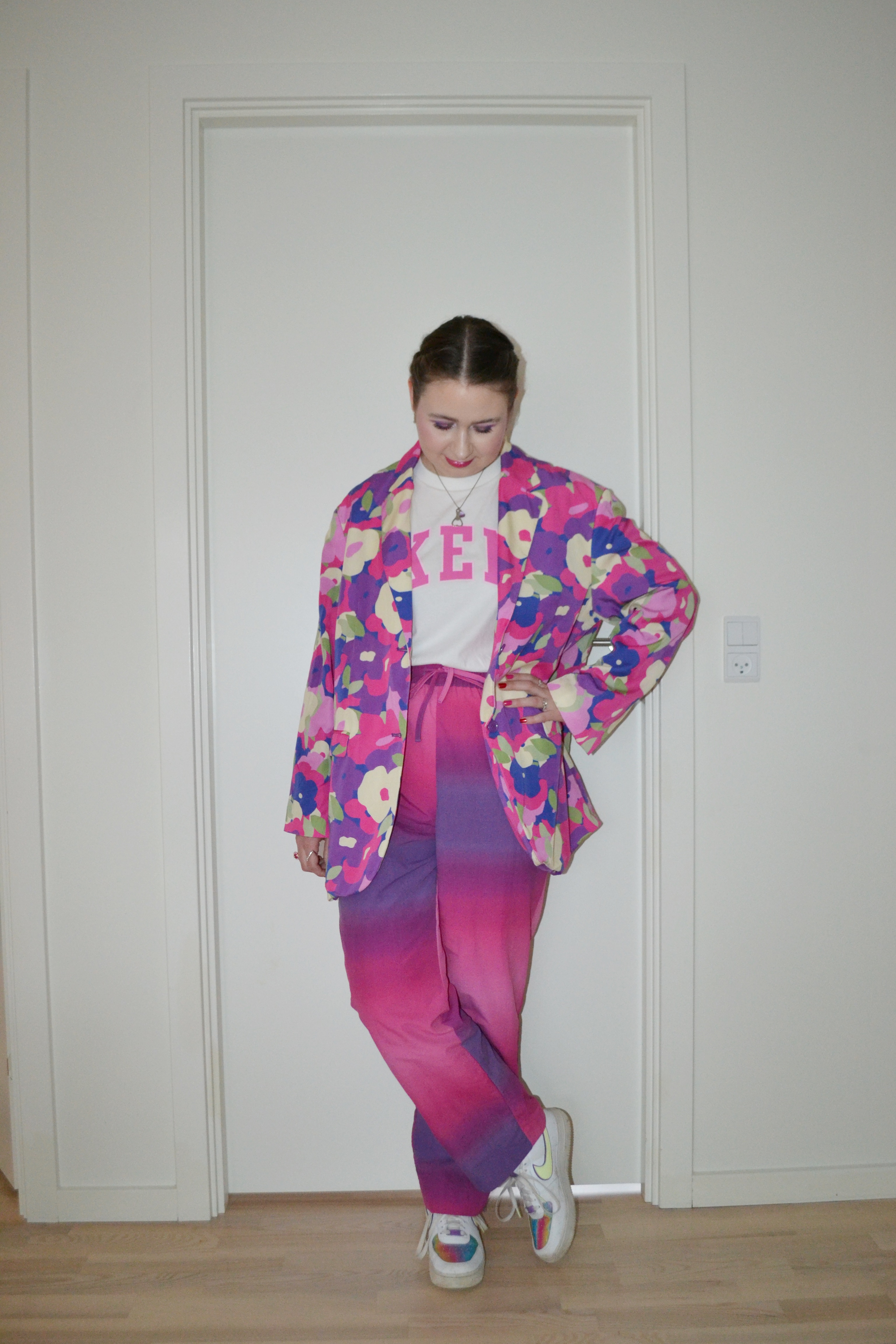 Casual Valentine’s Day Posted on April 17, 2024 by Mucha-Lucha Here’s what I wore Friday February 16. This look is still loosely inspired by Valentine’s Day if Valentine’s Day was to be celebrated in a casual setting. (Blazer + trousers – Monki, T-shirt – GAP, sneakers – Nike) Share this: Click to share on X (Opens in new window) X Click to share on Facebook (Opens in new window) Facebook Like Loading... Related