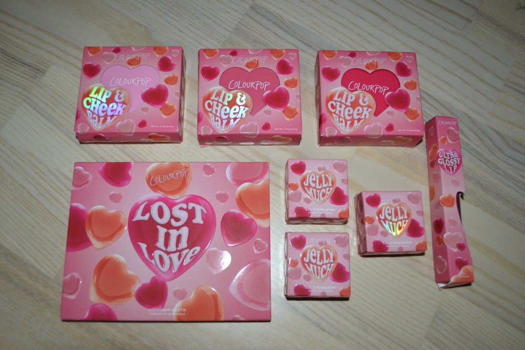 I picked up a lot of items from the Lost in Love collection, which was this year’s Valentine’s Day collection from Colourpop. I got the palette, the three Jelly Much shadows, the three lip & cheek balms, and one of the Ultra Glossy lips.