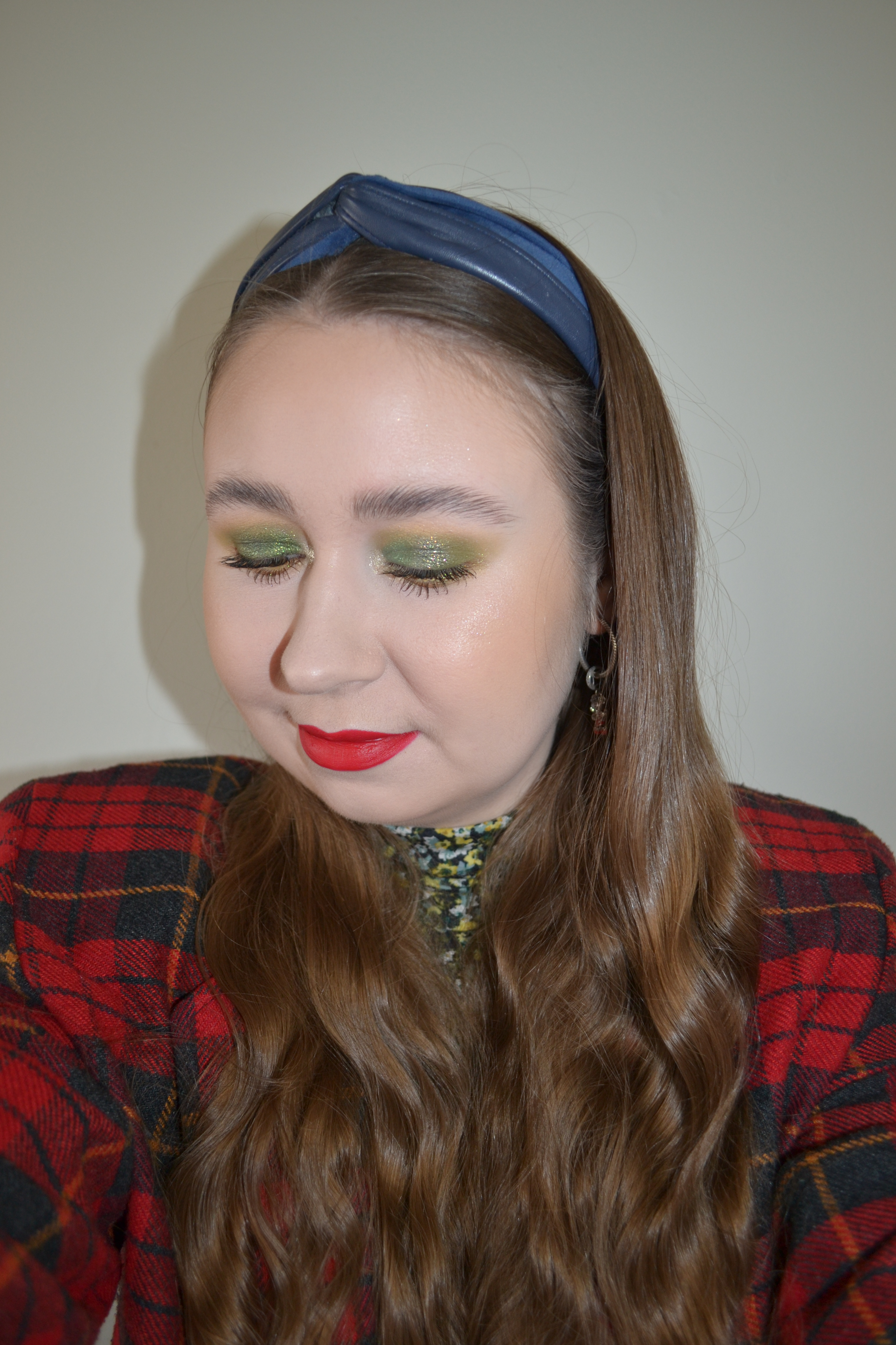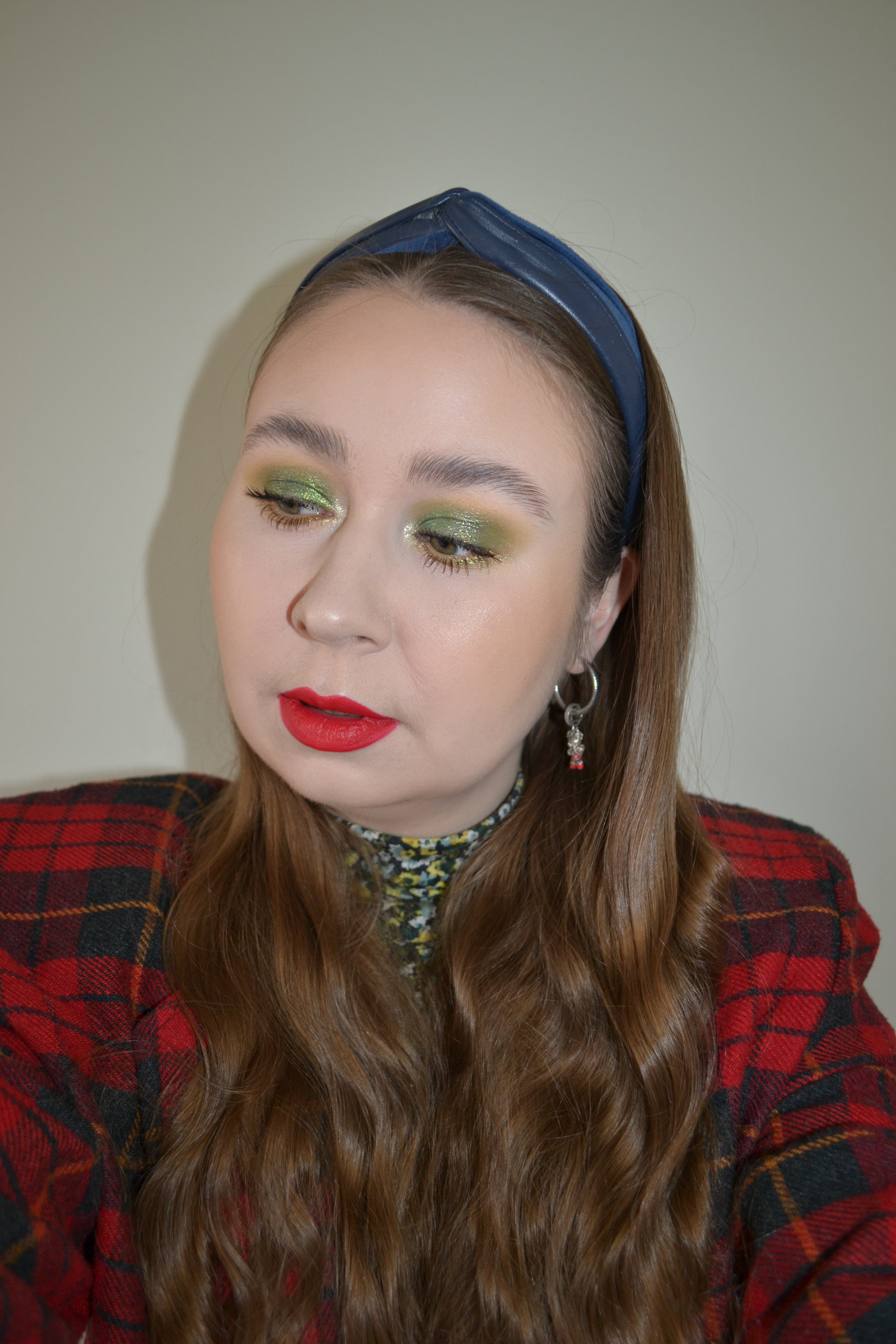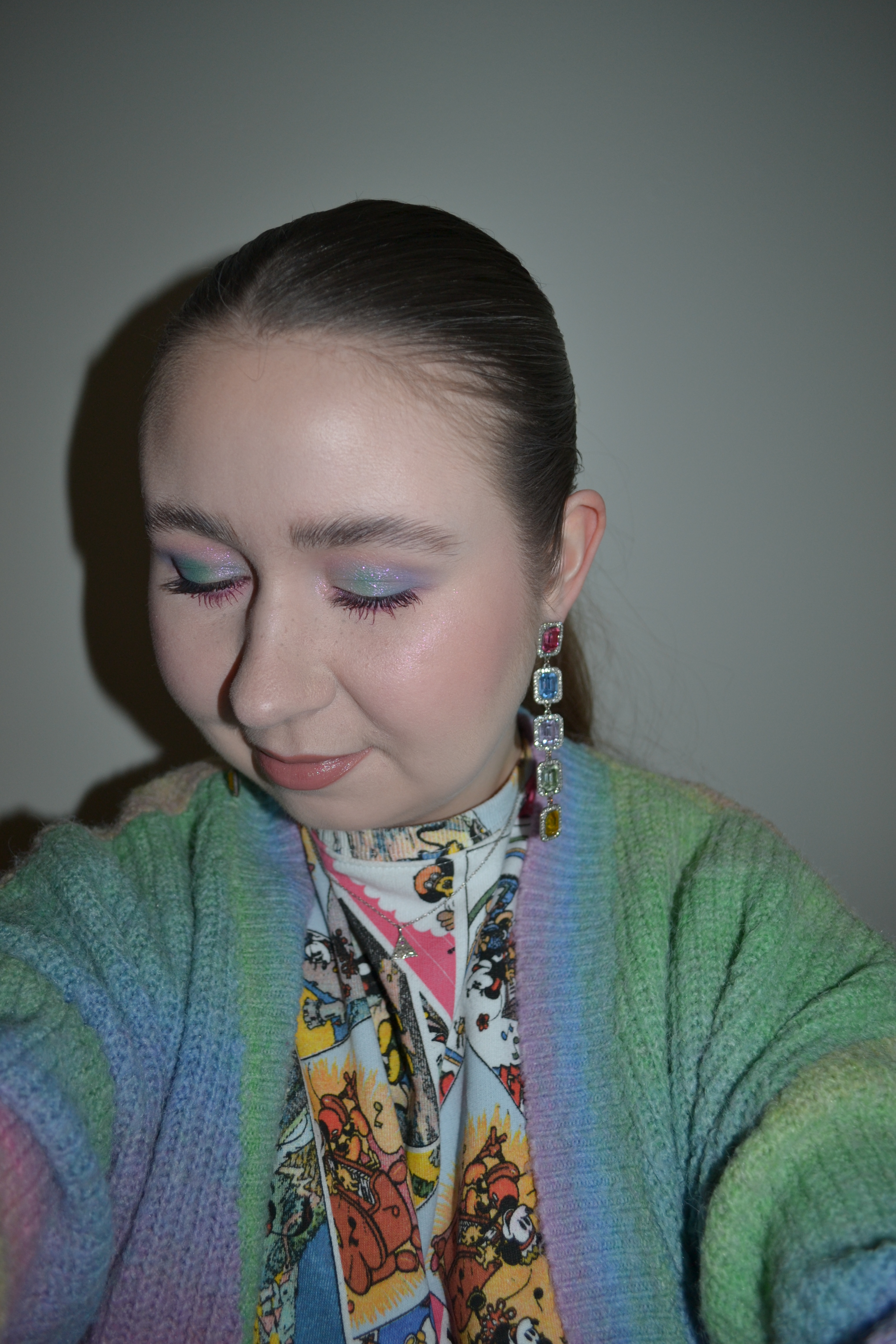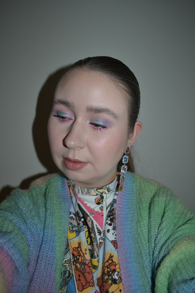 (Base: primers – e.l.f. Cosmetics Poreless Putty primer + e.l.f. Cosmetics Halo Glow Liquid Filter (shade: 1 Fair), foundation – e.l.f. Cosmetics Camo Hydrating CC Cream (shade: Fair 120N), concealers – e.l.f. Cosmetics Camo colour corrector (shade: Green) + e.l.f. Cosmetics Putty Color-Correcting Eye Brightener (shade: Fair) + e.l.f. Cosmetics Hydrating Camo concealer (shade: Fair Beige), powders – e.l.f. Cosmetics HD Undereye setting powder in Sheer + e.l.f. Cosmetics Prime & Stay finishing powder in Fair/Light. Face make-up: bronzer – MAC Skinfinish Sunstruck Radiant bronzer (shade: Radiant Light Rosy), blusher – Colourpop Alice in Wonderland pressed powder blush in Oh Dear!, highlighter – Fantasy Cosmetica Celestial Lights highlighter palette (shade: Dancing Lights). Eye make-up: base – MAC Pro Longwear Paint Pot in Painterly, eyeshadows – Fantasy Cosmetica Wizard palette (shades: Curiosity + Incantation + Telepathy + Divination + Conjuration + Graviturgy + Spell Book + Meteor Storm), mascaras – MAC Extended Play Gigablack Lash mascara + Essence I Love Extreme crazy volume mascara, eyeliner – Colourpop Crème gel liner in Ventura Blvd (multi-chrome). Eyebrows: Anastasia Beverly Hills Brow Freeze + Maybelline Brow Ultra Slim pencil in Medium Brown. Lips: L.A. Girl Perfect Precision lip liner in Pinky + Colourpop The Muppets Glowing Lip in Kissy Kissy)