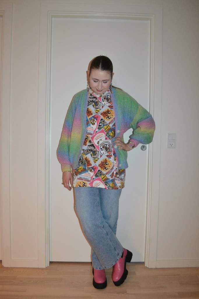 Here’s what I wore Friday March 8. I hadn’t worn my Zara “lips” boots in ages, but they were perfect with this outfit, and it was fun to wear them again.