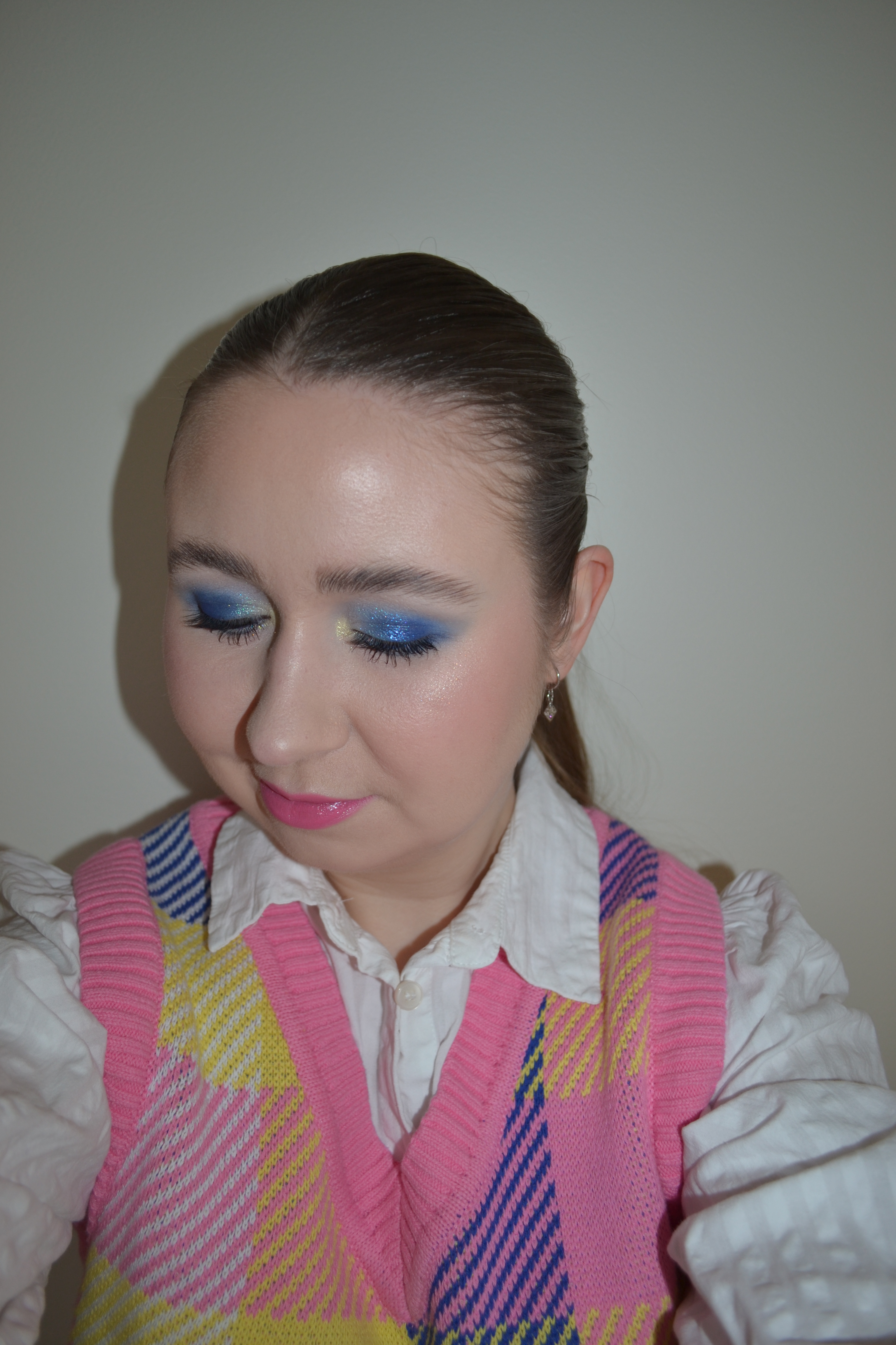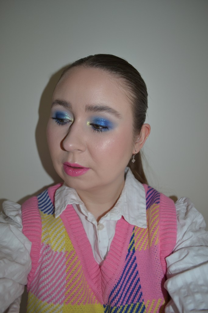 Here’s the make-up I wore with this outfit. You know how much I love a blue eye look, and there’s something very striking about a blue eye look paired with a bright pink lip.