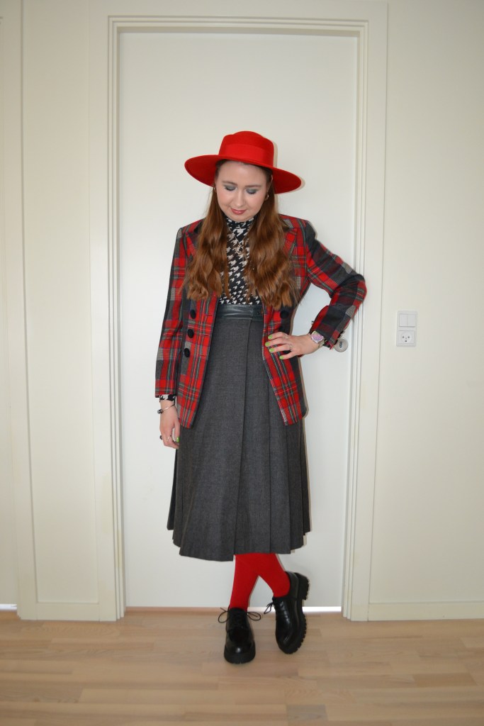 (Hat + blazer + skirt – second hand/vintage, roll neck top – H&M, tights – Calzedonia, shoes – Monki)