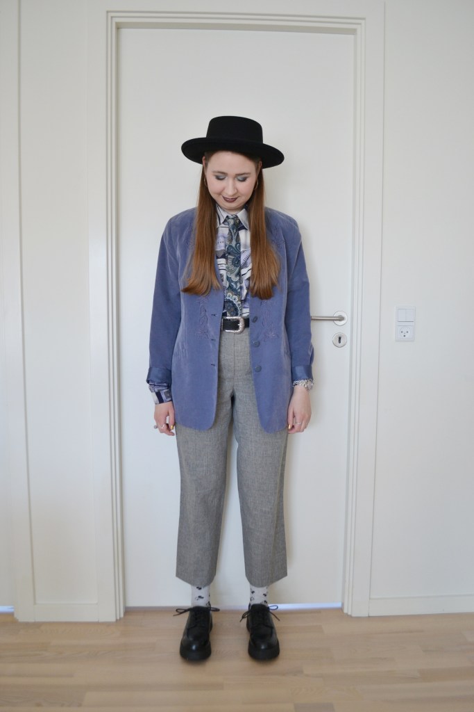 (Hat + socks – H&M, blazer + shirt + tie + trousers – second hand, belt – Asos Design, shoes – Monki)