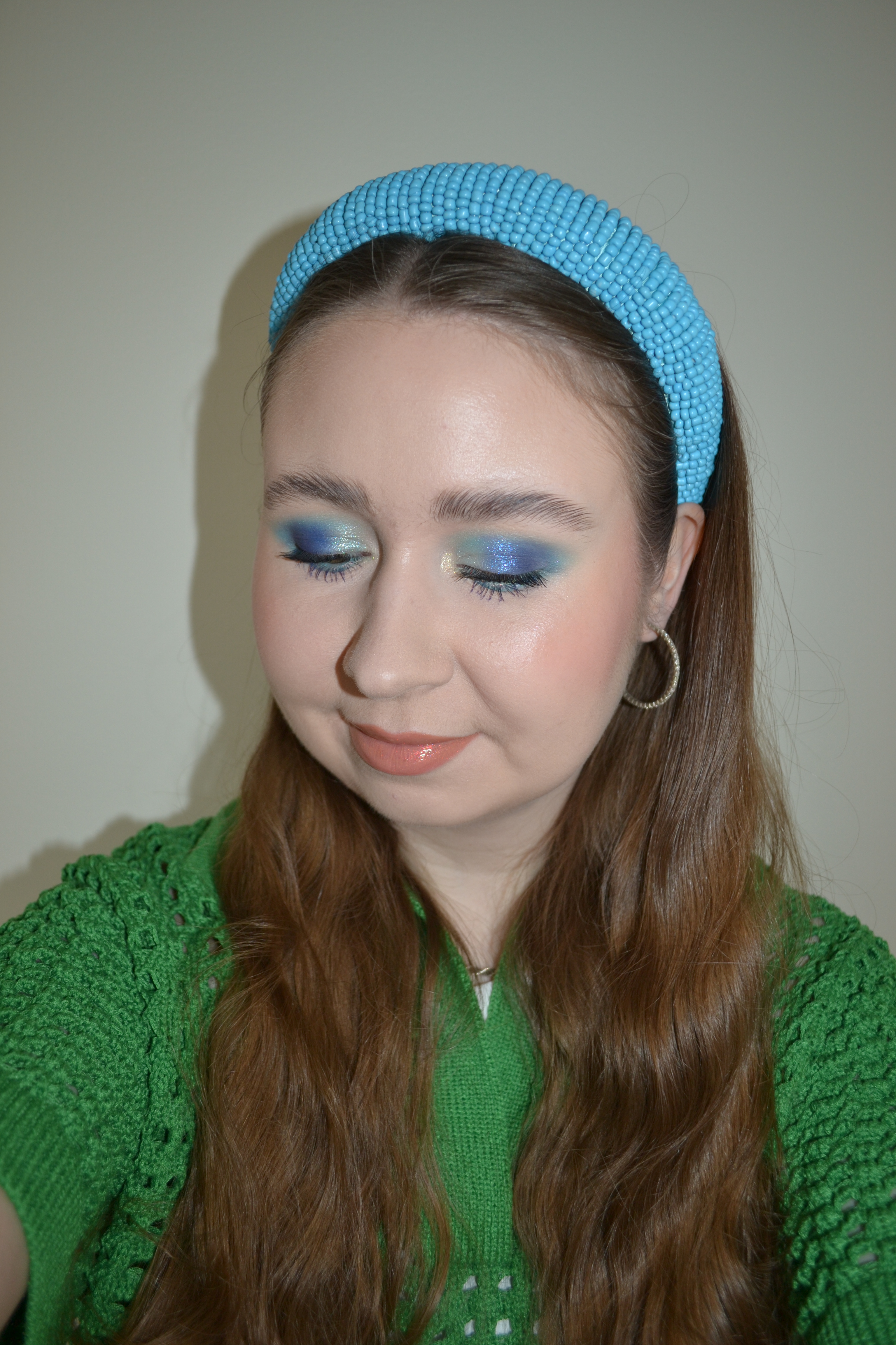 (Base: primer – e.l.f. Cosmetics Liquid Poreless Putty primer, foundation – e.l.f. Cosmetics Camo Hydrating CC Cream (shade: Fair 120N), concealers – Rare Beauty Positive Light under eye brightener (shade: Light) + Fenty Beauty We’re Even hydrating longwear concealer (shade: 120N), powders – Laura Mercier Translucent Loose Setting Powder Tone Up in Rose + e.l.f. Cosmetics Halo Glow setting powder in Light. Face make-up: bronzer – Made By Mitchell Blursh Bronzed liquid bronzer in Hollo There, blusher – e.l.f. Cosmetics Camo liquid blush in Coral Crush, highlighter – Made By Mitchell Blursh Lights liquid highlighter in A Chance Of Peach. Eye make-up: base – Sigma Beauty Eyeshadow Base Primer in Ignite, eyeshadows – Essence eyeshadow in 20 Cream + Cosmic Brushes Winter Wonderland palette (shades: Fresh Air + Clear Skies + Chill + Frost + Winter Solstice + Wonderland), mascaras – Essence I Love Extreme crazy volume mascara + Huda Beauty Legit Lashes mascara in Legit Blue, eyeliner – Colourpop BFF Créme gel liner in Crystal Tokyo. Eyebrows: Anastasia Beverly Hills Brow Freeze + Maybelline Brow Ultra Slim pencil in Medium Brown. Lips: Anastasia Beverly Hills Lip Liner in Baby Roses + Fenty Beauty Gloss Bomb Crystal holographic lip luminizer in Holla’gram)
