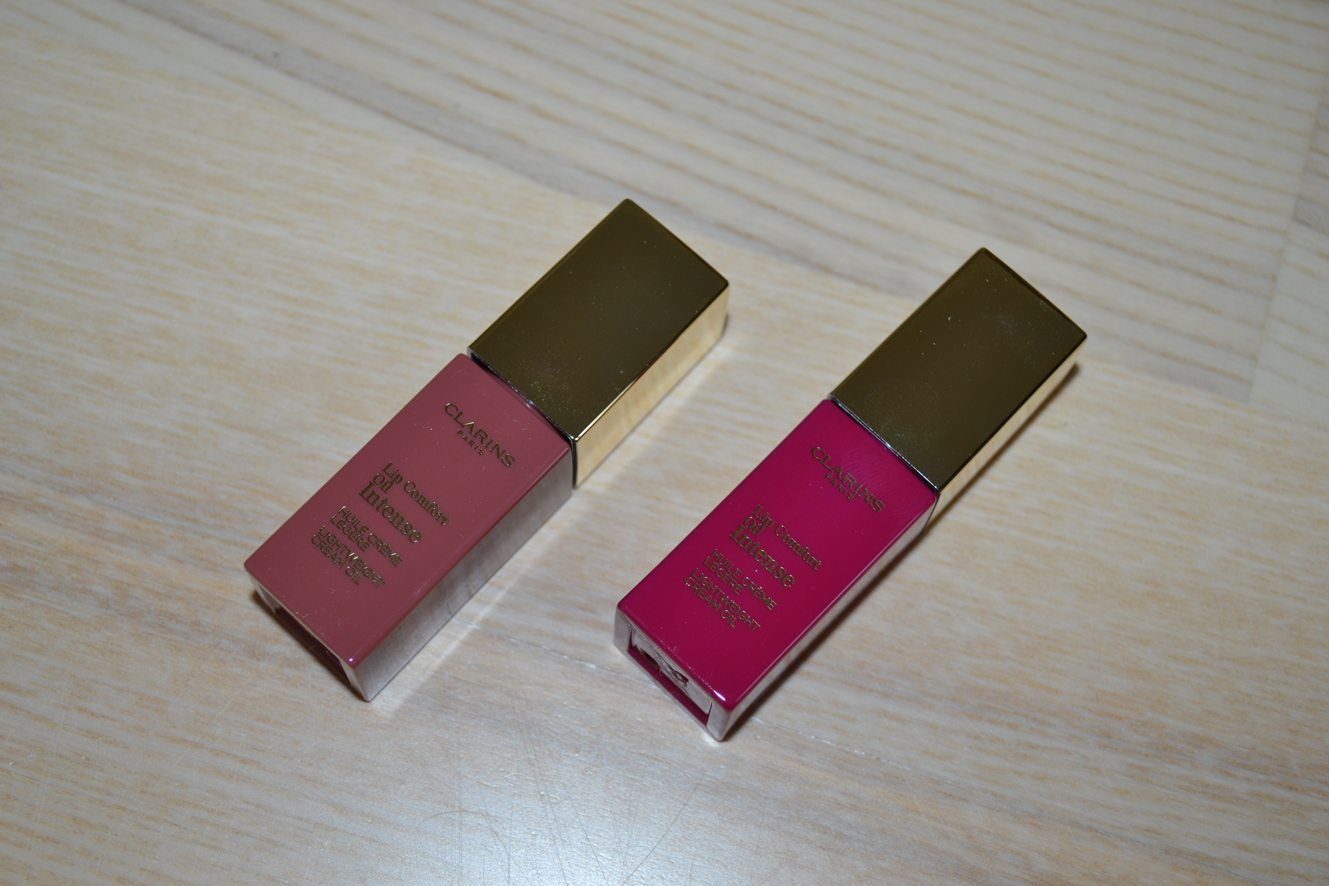 These are the Clarins Lip Comfort Oil Intense in the shades 01 Intense Nude and 02 Intense Plum. I love the “regular” Clarins Lip Comfort Oils, so I thought it would be fun to try out a more pigmented version.