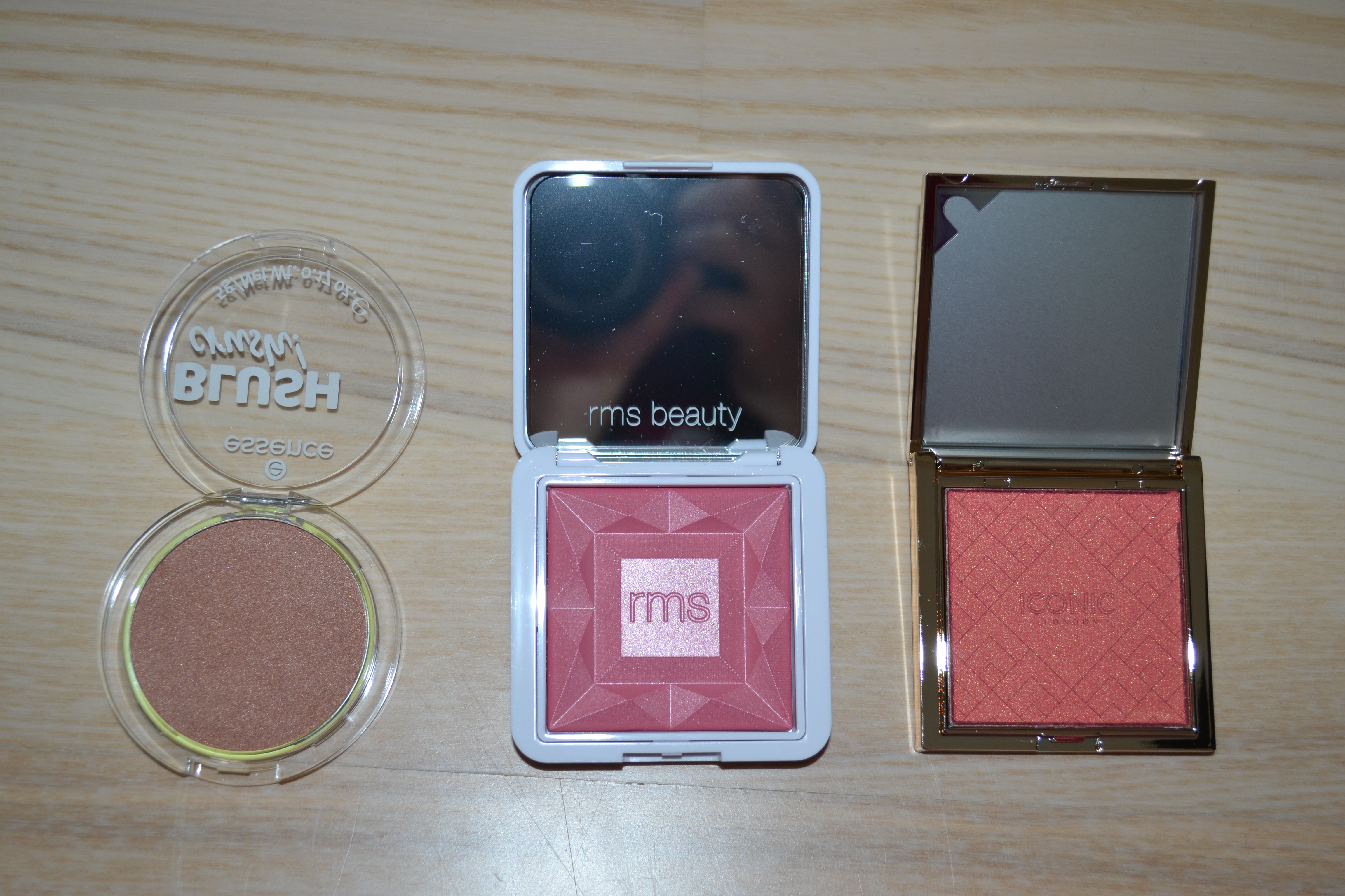 Let’s move on to this little mix of glowy cheek products. I got the Essence So Mesmerizing blush stick in 01 Let Mermiracles Happen!, the Essence Blush Crush! in 10 Caramel Latte, the RMS Beauty ReDimension hydra powder blush in French Rosé, the Iconic London Multi-Use Cheek Glow blush in Hot Stuff, and the Dior Forever Glow Maximizer in 011 Pink.