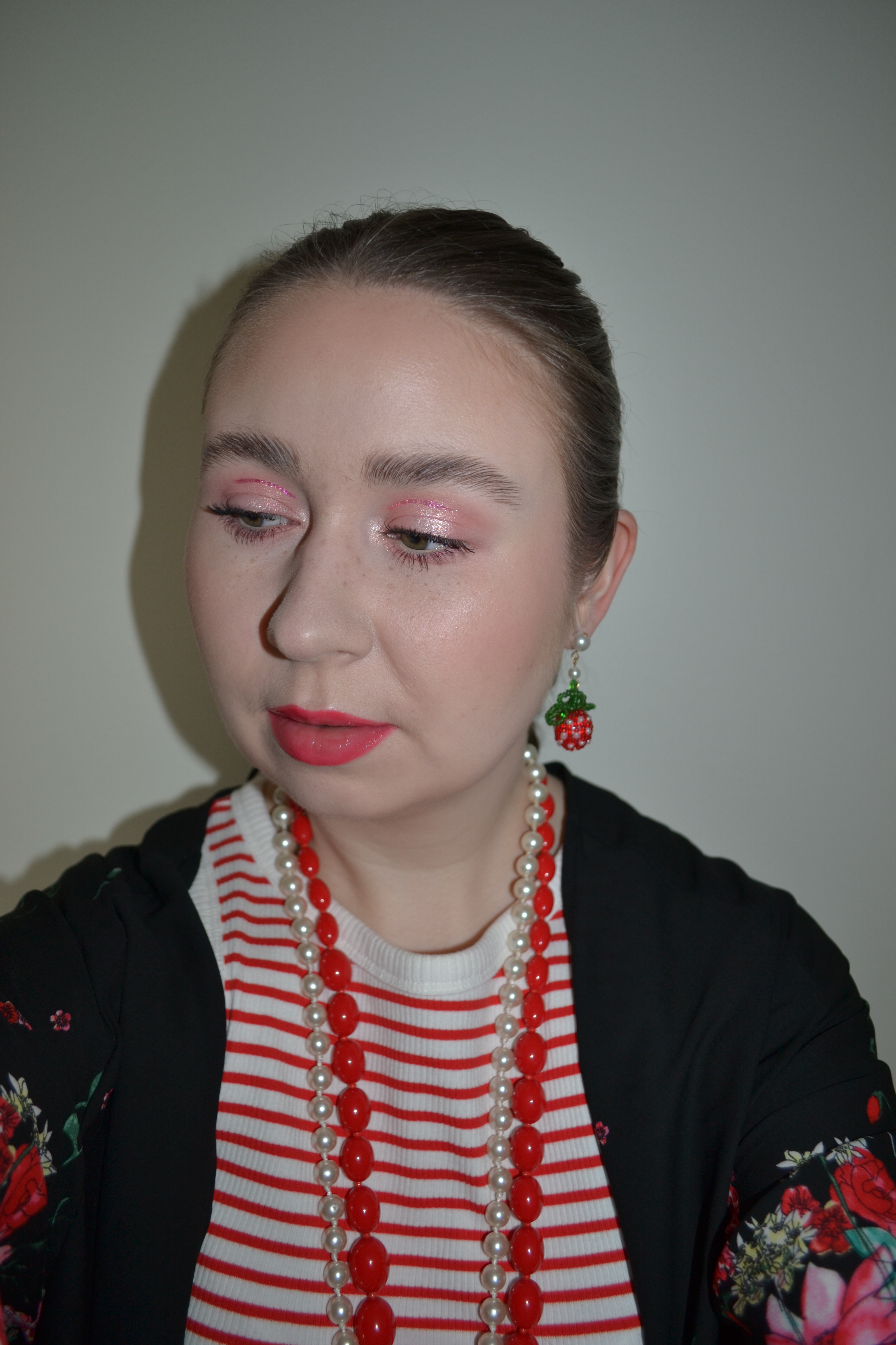 (Base: primer – e.l.f. Cosmetics Liquid Poreless Putty primer, foundation – Rare Beauty Positive Light tinted moisturizer (shade: 14W), concealer – NYX Pro Fix Stick correcting concealers (shades: 0.2 Pink + 03 Alabaster), powders – Laura Mercier Translucent Loose Setting Powder Tone Up in Rose + e.l.f. Cosmetics Halo Glow setting powder in Light, freckles – KimChi Chic Candy Girl Fake Freckles in Afternoon in The Flower Field. Face make-up: bronzer – Hourglass Ambient Lighting bronzer in Luminous Bronze Light, blusher – RMS Beauty ReDimension hydra powder blush in French Rosé, highlighter – Anastasia Beverly Hills Glow Seeker highlighter in Pearl. Eye make-up: eyeshadows – e.l.f. Cosmetics No Budge matte shadow stick in Bombshell + R.E.M. Beauty Midnight Shadows liquid eyeshadow in 1954 + Colourpop Jelly Much shadow in 4ever Valentine, mascaras – MAC Extended Play Gigablack Lash mascara + Essence I Love Extreme crazy volume mascara, eyeliners – Unearthly Cosmetics Immortal liquid eyeliner in Love Struck + MAC Studio Chromagraphic pencil in NC15/NW20. Eyebrows: Anastasia Beverly Hills Brow Freeze + Maybelline Brow Ultra Slim pencil in Medium Brown. Lips: e.l.f. Cosmetics Cream Glide lip liner in Red Receipt + Ole Henriksen Pout Preserve Peptide lip treatment in Blood Orange Spritz)