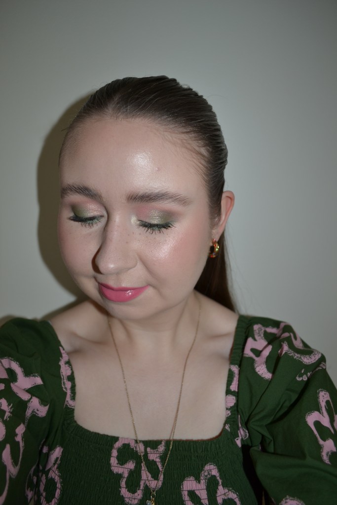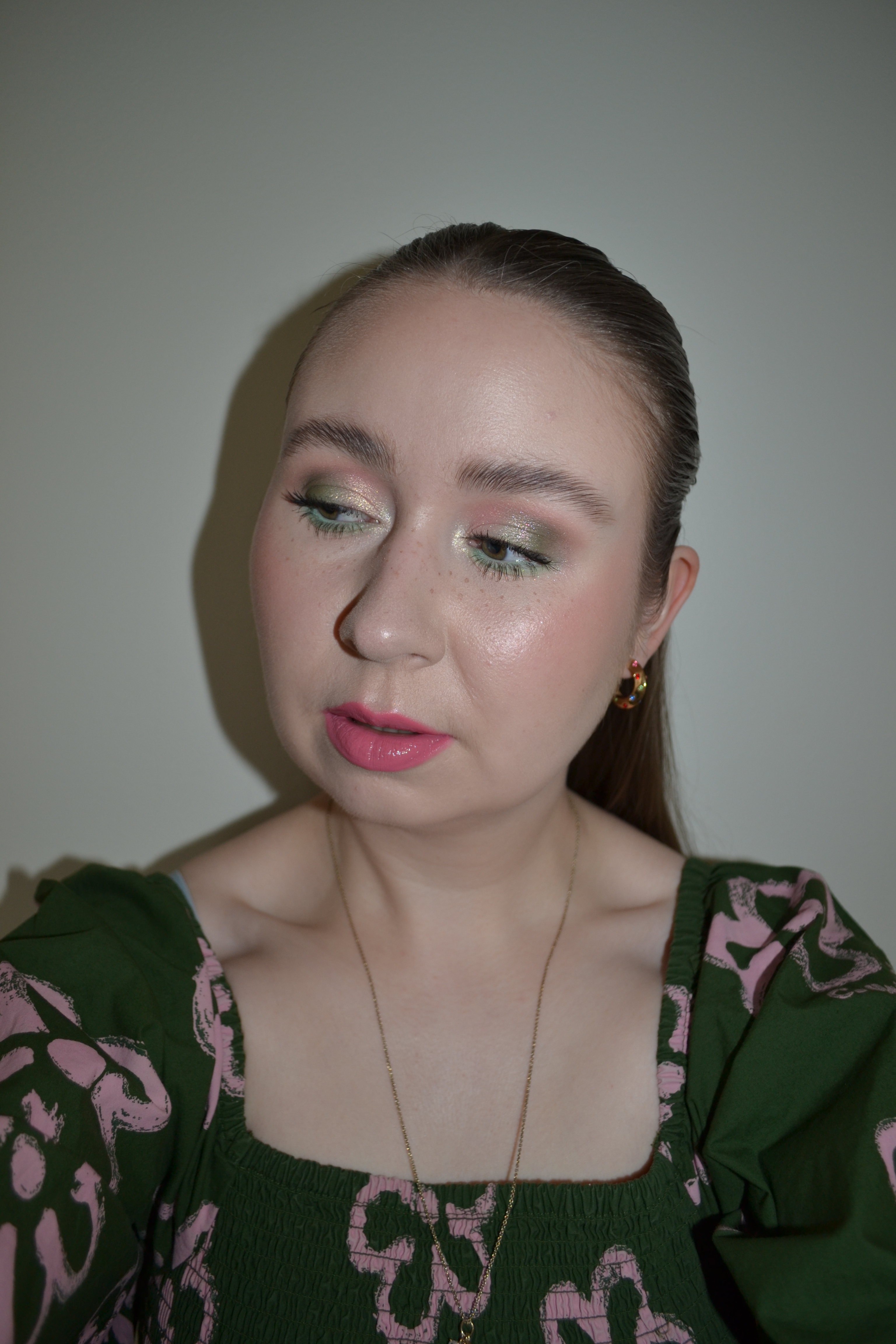 (Base: primers – Rare Beauty Always An Optimist pore diffusing primer + L’Oréal Glotion natural glow enhancer (shade: 901 Fair Glow), foundation – Rare Beauty Positive Light tinted moisturizer (shade: 14W), concealers – Smashbox x Becca Under Eye Brightening Corrector in Fair/Light + Huda Beauty #FAUXFILTER Luminous Matte liquid concealer (shade: 1.3G Marshmellow), powders – Laura Mercier Translucent Loose Setting Powder Tone Up in Rose + e.l.f. Cosmetics Halo Glow setting powder in Light, freckles – KimChi Chic Candy Girl Fake Freckles in Afternoon in The Flower Field. Face make-up: bronzer – MAC Skinfinish Sunstruck Radiant bronzer (shade: Radiant Light Rosy), blusher – bareMinerals Gen Nude highlighting blush in Pink Glow, highlighter – Lunar Beauty Moonshroom highlighter palette (shades: Sugar + Blossom). Eye make-up: base – MAC Pro Longwear Paint Pot in Painterly, eyeshadows – Essence eyeshadow in 20 Cream + Lethal Cosmetics Mellow Grove palette (shades: Serenity + Sylvan + Elysian + Adrift + Lagoon +Bliss), mascaras – MAC Extended Play Gigablack Lash mascara + Pat McGrath Labs Dark Star mascara, eyeliner – MAC Powerpoint eye pencil in Mistletoe Mint. Eyebrows: Anastasia Beverly Hills Brow Freeze + Maybelline Brow Ultra Slim pencil in Medium Brown. Lips: Make Up For Ever Artist Color Pencil in 806 Go Ahead Pink + Maybelline Superstay Vinyl Ink in 155 Upbeat)