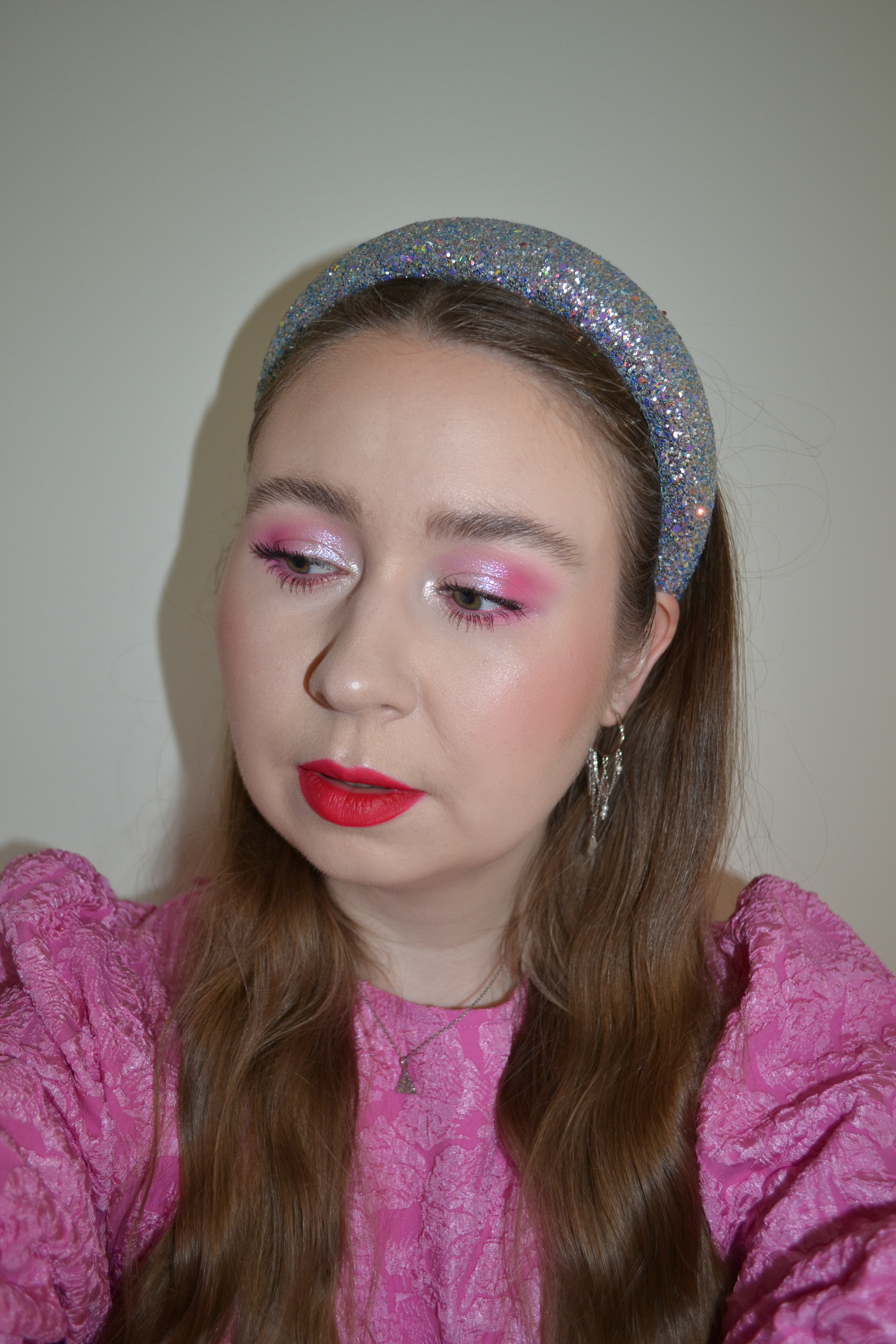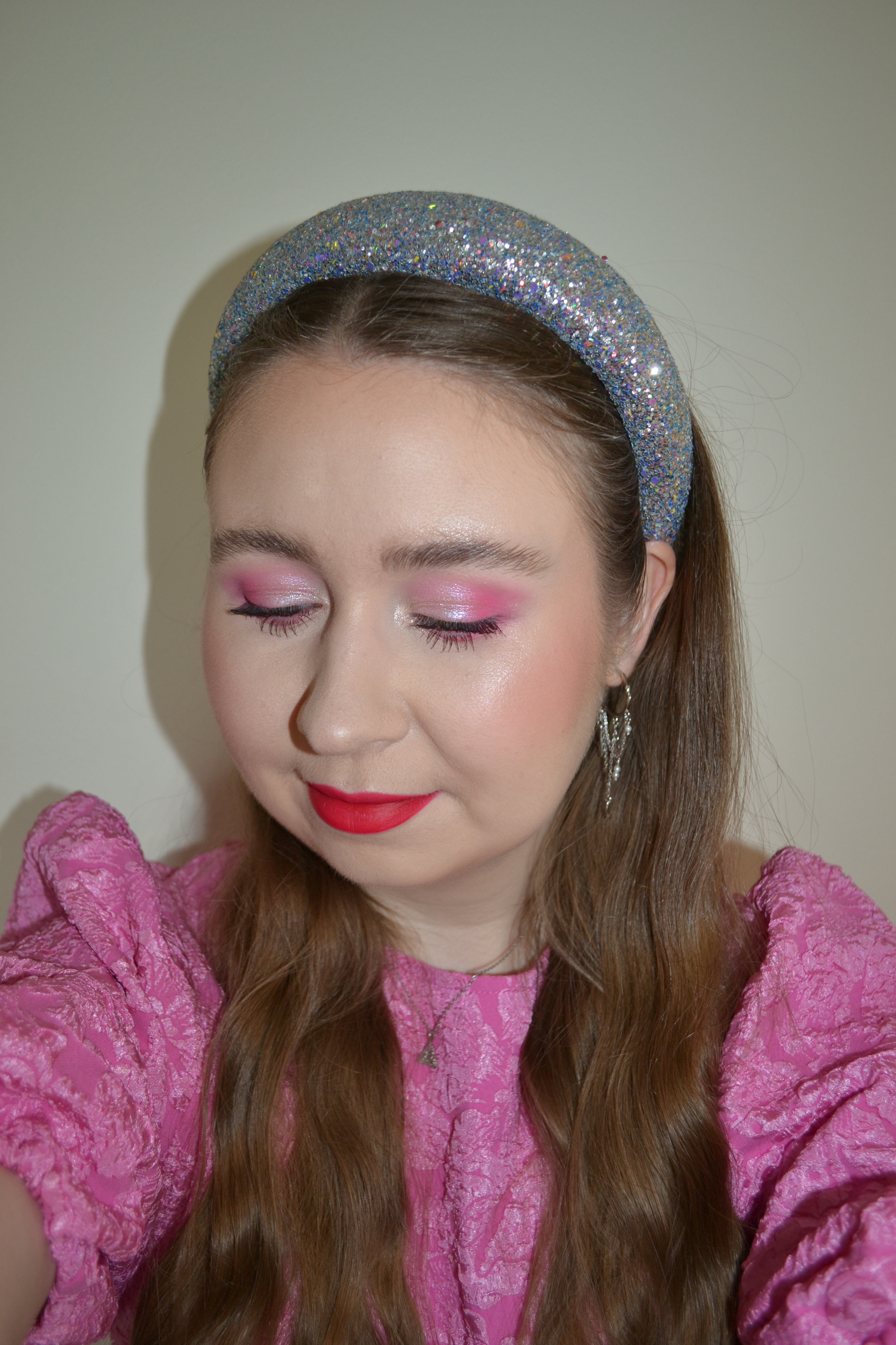 Here’s the make-up I wore with this wedding guest outfit. You know how much I love pink and red together, and since most of my look was pink, I had to wear a pop of red on the lips (and nails).