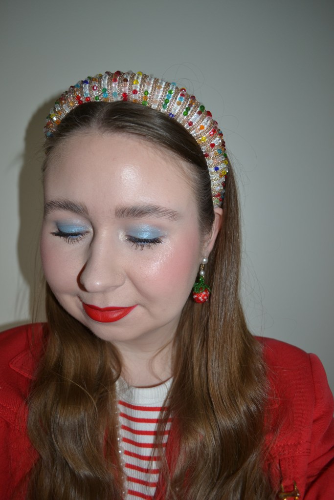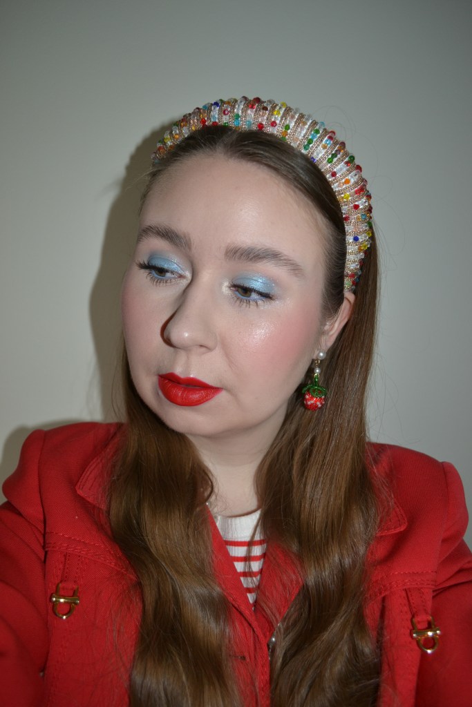 (Base: primer – e.l.f Cosmetics Power Grip primer, foundation – Rare Beauty Positive Light tinted moisturizer (shade: 14W), concealers – Rare Beauty Positive Light under eye brightener (shade: Light) + Huda Beauty #FAUXFILTER Luminous Matte liquid concealer (shade: 1.3G Marshmellow), powders – Charlotte Tilbury Airbrush Brightening Flawless Finish powder (shade: Fair/Medium) + Charlotte Tilbury Airbrush Flawless Finish powder (shade: 1 Fair). Face make-up: bronzer – L’Oréal Infaillible 24H Fresh Wear Matte bronzer (shade: 250 Light), blusher + highlighter – Simply Posh Cosmetics Cozy Up cheek palette (shades: Warm Wishes + Cozy Up (blushers) + Snowed In (highlighter)). Eye make-up: base – MAC Pro Longwear Paint Pot in Painterly, eyeshadows – Essence eyeshadow in 20 Cream + Colourpop Super Shock shadow in Sasuke Uchiha + Simply Posh Cosmetics Cozy Up cheek palette (shade: Snowed In – inner corners), mascaras – MAC Extended Play Gigablack Lash mascara + L’Oréal Lash Paradise mascara in Intense Black, eyeliner – Oden’s Eye Solmåne gel liner in 009 Sky Blue. Eyebrows: Anastasia Beverly Hills Brow Freeze + Maybelline Brow Ultra Slim pencil in Medium Brown. Lips: Natasha Denona I Need A Rouge lip crayon in Gigi + Jeffree Star Cosmetics Velvet Trap lipstick in Red Affair)