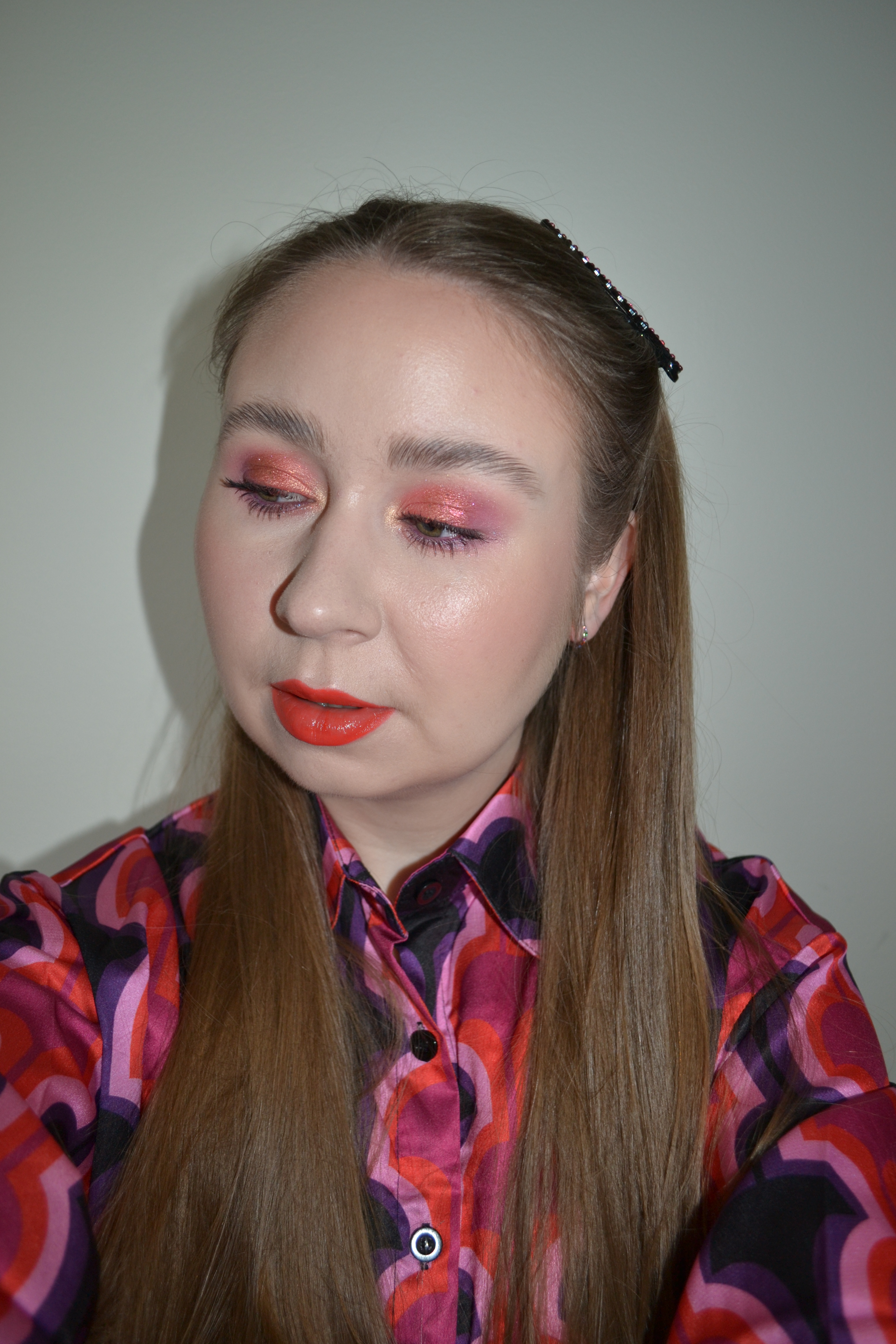 (Base: primer – Iconic London Underglow blurring primer, foundation – Danessa Myricks Beauty Yummy Skin serum skin tint (shade: 2), concealers – Rare Beauty Positive Light under eye brightener (shade: Light) + Fenty Beauty We’re Even hydrating longwear concealer (shade: 120N), powder – e.l.f. Cosmetics Halo Glow setting powder in Light. Face make-up: bronzer – NYX Buttermelt bronzer in 02 All Butta’d Up, blusher – RMS Beauty ReDimension hydra powder blush in Bohemian Girl, highlighter – RMS Beauty ReDimension hydra dew luminizer in Prosecco Fizz. Eye make-up: base – MAC Pro Longwear Paint Pot in Painterly, eyeshadows – Essence eyeshadow in 20 Cream + Colourpop Cabana Club palette (shades: Bikini + Cha Cha Cha + Copa Cute + High Season) + Catrice Space Glam chome eyeshadow in 020 Supernova + Colourpop Hocus Pocus 2 Jelly Much shadow in Shish-Ka-Baby!, mascaras – MAC Extended Play Gigablack Lash mascara + Essence I Love Extreme crazy volume mascara, eyeliner – Colourpop BFF Crème gel liner in Plum Smash. Eyebrows: Anastasia Beverly Hills Brow Freeze + Maybelline Brow Ultra Slim pencil in Medium Brown. Lips: Lunar Beauty lip pencil Tías + 3ina The Color lip glow in 170)