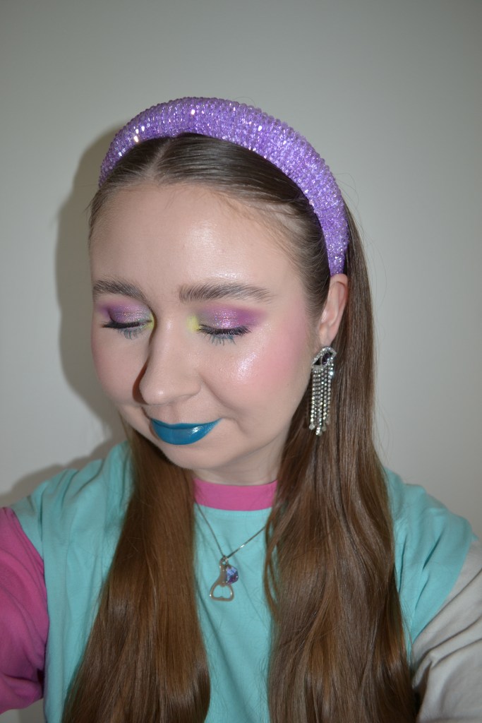 (Base: primer – e.l.f Cosmetics Power Grip primer, foundation – NYX Born To Glow naturally radiant foundation (shade: Porcelain), concealers – Catrice Under Eye Brightener in 010 Light Rose + NYX Bare With Me concealer serum (shade: 02 Light), powders – Laura Mercier Translucent Loose Setting Powder Tone Up in Rose + Bobbi Brown Sheer Finish pressed powder in Soft Porcelain. Face make-up: bronzer – Fenty Beauty Cheeks Out Freestyle cream bronzer in Butta Bisquit, blusher – Colourpop Pokémon Instant Crush cream blush in Hypnosis, highlighter – Colourpop Twilight Super Shock highlighter in Meadow. Eye make-up: base – MAC Pro Longwear Paint Pot in Painterly, eyeshadows – Essence eyeshadow in 20 Cream + Adept Cosmetics Cyborg Choir palette (shades: Robotic Fusion + Synthetic Sound Wave + Android Aura + Digital Harmony + Cybernetic Spark + 7), mascaras – Essence I Love Extreme crazy volume mascara + Kiko Milano Smart Colour mascara in 10 Turquoise, eyeliner – LA Girl Pastel Dream auto eyeliner in Lavender. Eyebrows: Anastasia Beverly Hills Brow Freeze + Maybelline Brow Ultra Slim pencil in Medium Brown. Lips: Max Factor Colour Elixir universal lip liner + Fenty Beauty Poutsicle lipstick in Go Deep)