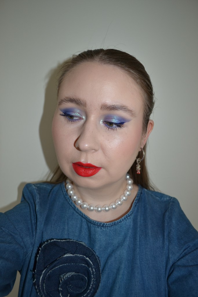(Base: primer – e.l.f. Cosmetics Liquid Poreless Putty primer, foundation – Maybelline SuperStay 24H skin tint (shade: 03), concealers – e.l.f. Cosmetics Putty Color-Correcting Eye Brightener (shade: Fair) + e.l.f. Cosmetics Hydrating Camo concealer (shade: Fair Beige), powders – Charlotte Tilbury Airbrush Brightening Flawless Finish powder (shade: Fair/Medium) + Bobbi Brown Sheer Finish pressed powder in Soft Porcelain, freckles – Essence Got A Crush On Apricots freckles pen (shade: 01 Après Apricots). Face make-up: bronzer – Colourpop Bronze Stix in Laguna Beach, blusher – Colourpop Super Shock blush in Growth Flirt, highlighter – Colourpop Twilight Super Shock highlighter in Vampire Skin. Eye make-up: base – MAC Pro Longwear Paint Pot in Painterly, eyeshadows – Essence eyeshadow in 20 Cream + Ace Beauté Envy palette (shades: Crave + Dominate + Rival + Phantasm), mascara – Kiko Milano Smart Colour mascara in 07 Navy Blue, eyeliners – Lethal Cosmetics x Avatar: The Last Airbender liner set in Katara (dark blue) + Catrice Kohl Kajal waterproof in 150 Ultra Marine. Eyebrows: Anastasia Beverly Hills Brow Freeze gel (with wand) + Maybelline Brow Ultra Slim pencil in Medium Brown. Lips: Essence Stay 8h lipliner in 08 Passionate + Catrice The Joker matte lipstick in 020 Serious Smiles)