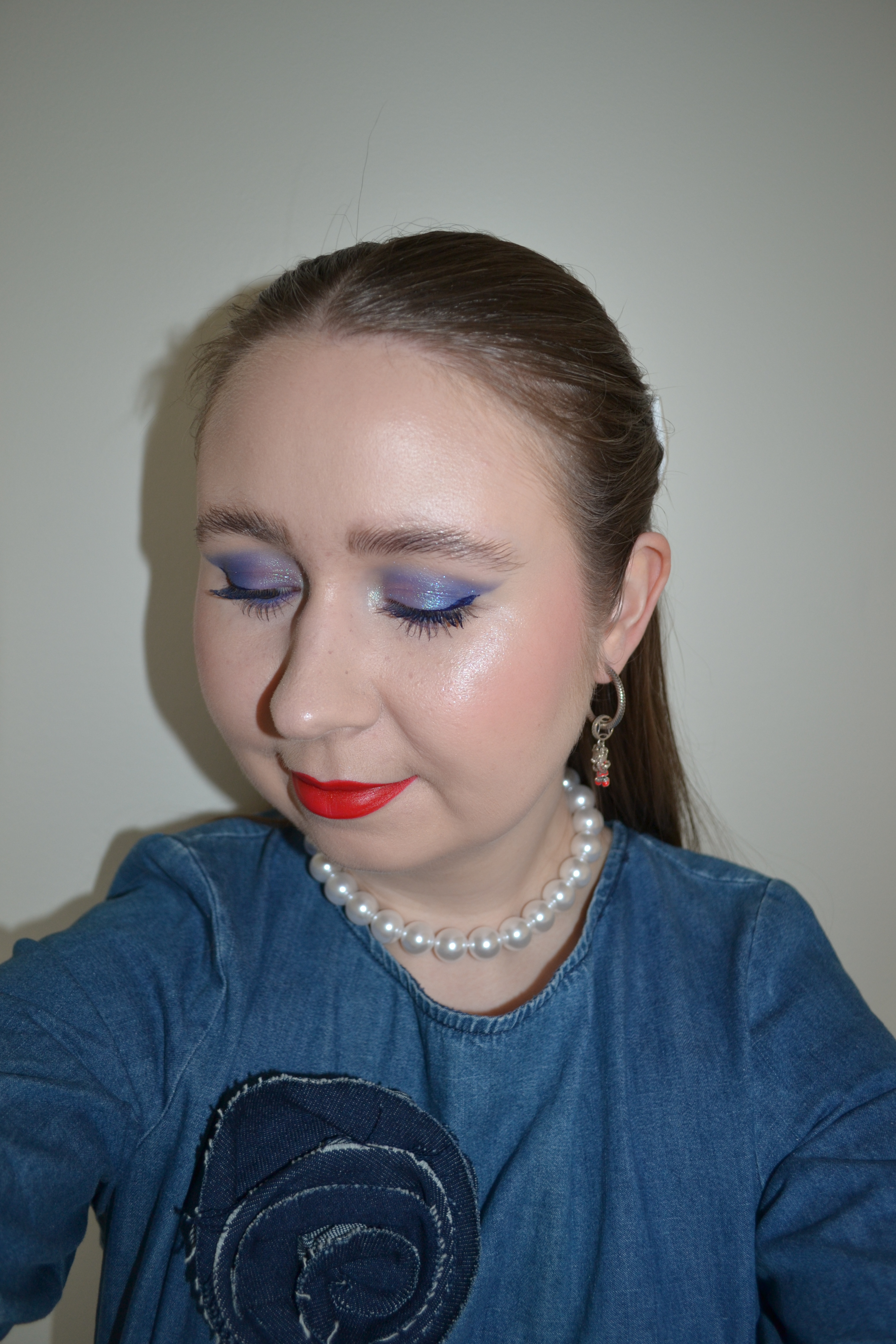 (Base: primer – e.l.f. Cosmetics Liquid Poreless Putty primer, foundation – Maybelline SuperStay 24H skin tint (shade: 03), concealers – e.l.f. Cosmetics Putty Color-Correcting Eye Brightener (shade: Fair) + e.l.f. Cosmetics Hydrating Camo concealer (shade: Fair Beige), powders – Charlotte Tilbury Airbrush Brightening Flawless Finish powder (shade: Fair/Medium) + Bobbi Brown Sheer Finish pressed powder in Soft Porcelain, freckles – Essence Got A Crush On Apricots freckles pen (shade: 01 Après Apricots). Face make-up: bronzer – Colourpop Bronze Stix in Laguna Beach, blusher – Colourpop Super Shock blush in Growth Flirt, highlighter – Colourpop Twilight Super Shock highlighter in Vampire Skin. Eye make-up: base – MAC Pro Longwear Paint Pot in Painterly, eyeshadows – Essence eyeshadow in 20 Cream + Ace Beauté Envy palette (shades: Crave + Dominate + Rival + Phantasm), mascara – Kiko Milano Smart Colour mascara in 07 Navy Blue, eyeliners – Lethal Cosmetics x Avatar: The Last Airbender liner set in Katara (dark blue) + Catrice Kohl Kajal waterproof in 150 Ultra Marine. Eyebrows: Anastasia Beverly Hills Brow Freeze gel (with wand) + Maybelline Brow Ultra Slim pencil in Medium Brown. Lips: Essence Stay 8h lipliner in 08 Passionate + Catrice The Joker matte lipstick in 020 Serious Smiles)
