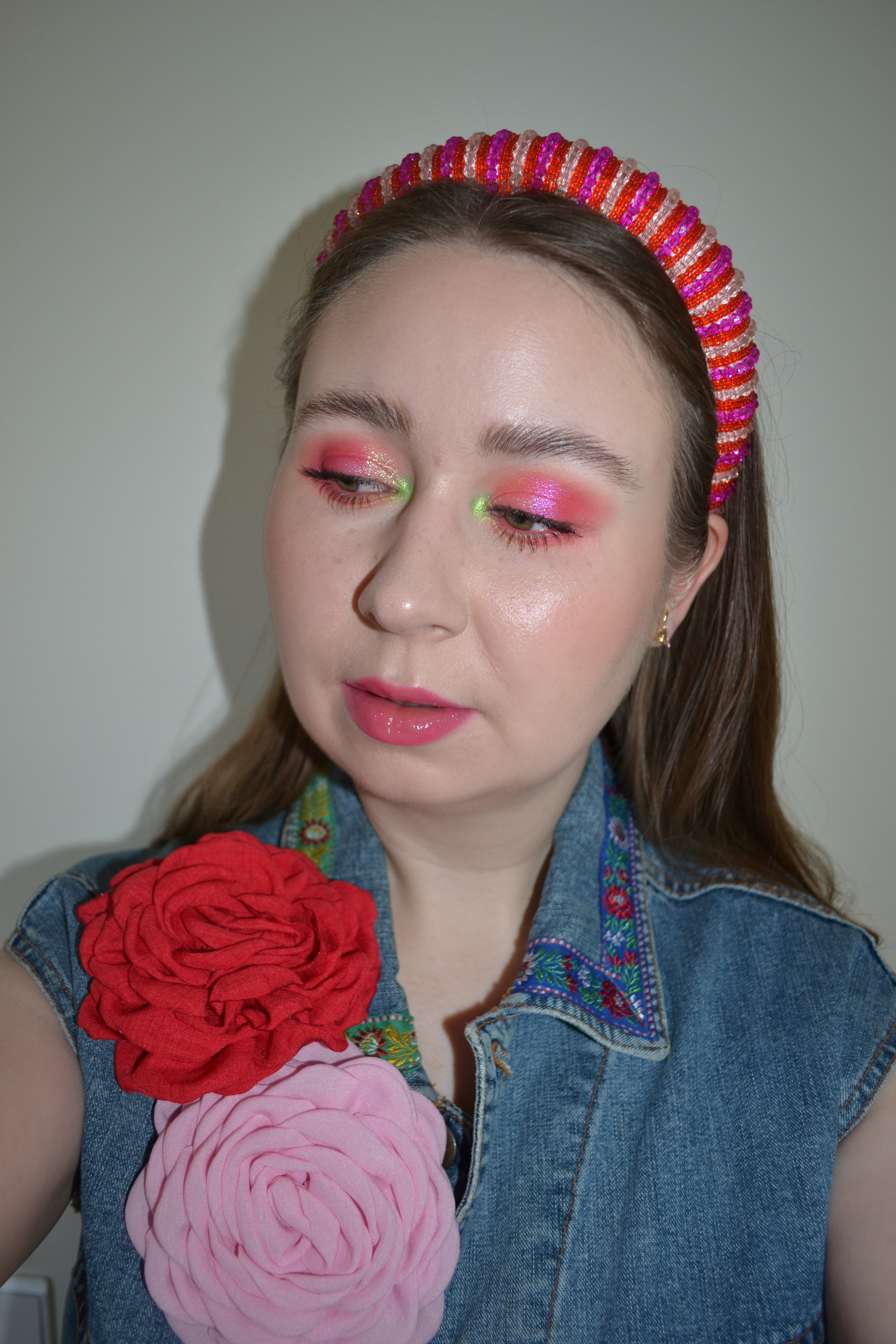 (Base: primer – Urban Decay All Nighter face primer, foundation – Rare Beauty Positive Light tinted moisturizer (shade: 14W), concealers – Smashbox x Becca Under Eye Brightening Corrector in Fair/Light + Natasha Denona Hy-Glam concealer (shade: P1), powders – Laura Mercier Translucent Loose Setting Powder Tone Up in Rose + Rare Beauty Always An Optimist Soft Radiance setting powder in Light, freckles – Essence Got A Crush On Apricots freckles pen (shade: 01 Après Apricots). Face make-up: bronzer – Rare Beauty Warm Wishes Effortless bronzer in Power Boost, blusher – Catrice Seeking Flowers blush & brush stick in C02 S-peachless, highlighter – Catrice Seeking Flowers cream-to-powder highlighter in C01 Watch Me Bloom. Eye make-up: base – MAC Prep + Prime 24-Hour Extend Eye Base, eyeshadows – Gourmande Girls Spooked palette (shades: Ghoul + Haunted + Terror + Bloody + Pumpkin + Apple Bob), mascaras – MAC Extended Play Gigablack Lash mascara + L’Oréal Lash Paradise mascara in Intense Black, eyeliner – Catrice Kohl Kajal Waterproof in 180 Red Coral. Eyebrows: Anastasia Beverly Hills Brow Freeze gel (with wand) + Maybelline Brow Ultra Slim pencil in Medium Brown. Lips: MAC Talking Points lip pencil + NYX Butter Gloss Bling lipgloss in 05 She Got Money)