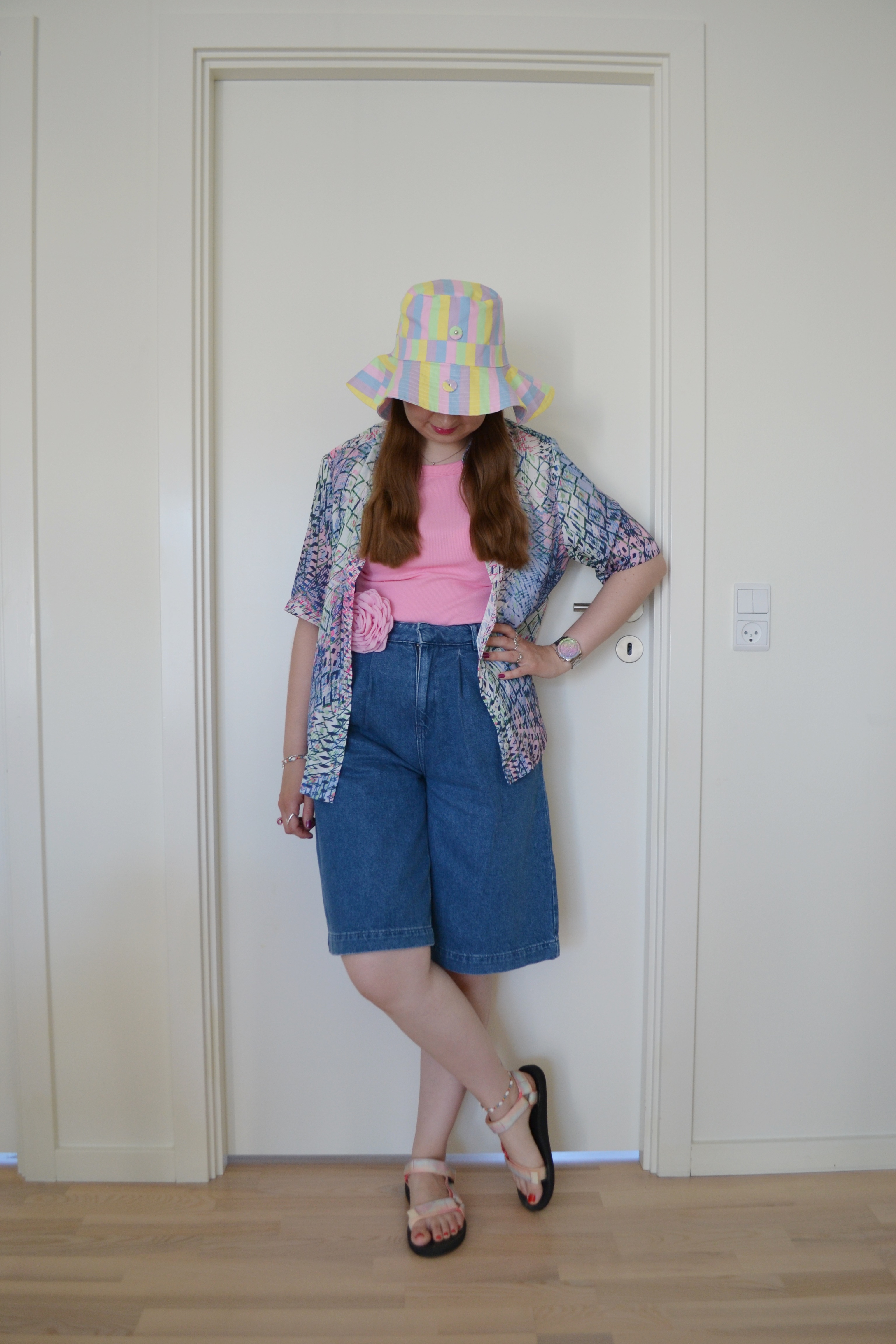 (Hat – Crás, shirt – second hand, top – H&M, flower pin – Black Colour, shorts – Asos Design, sandals – Teva)