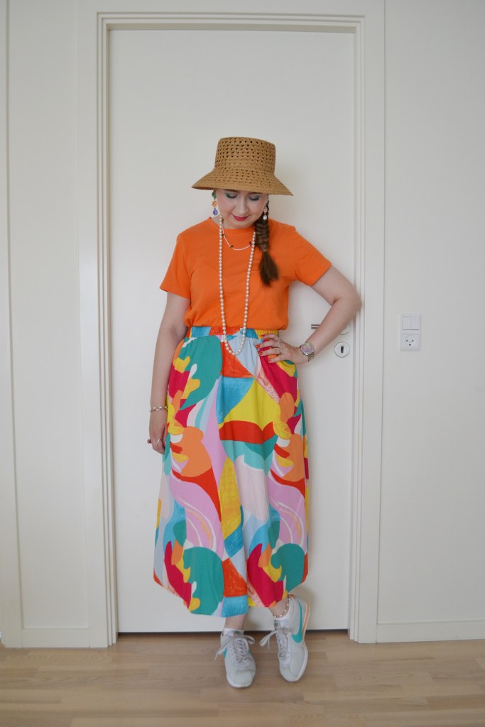 (Hat – H&M, T-shirt – Kaffe, skirt – YAS, sneakers – Nike)